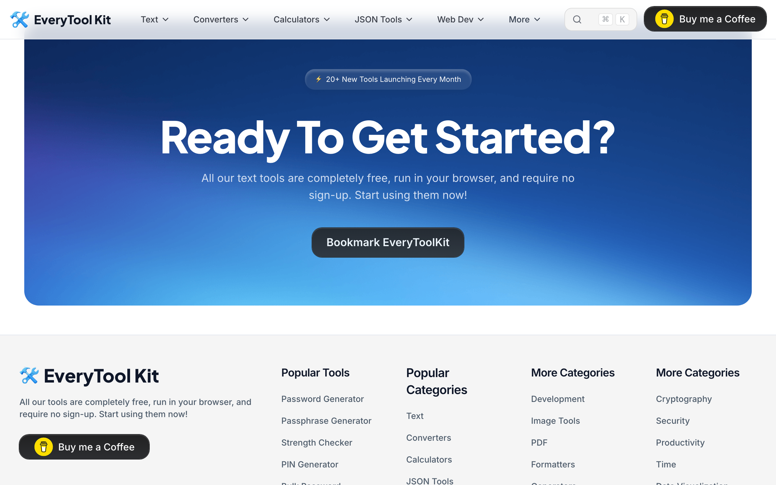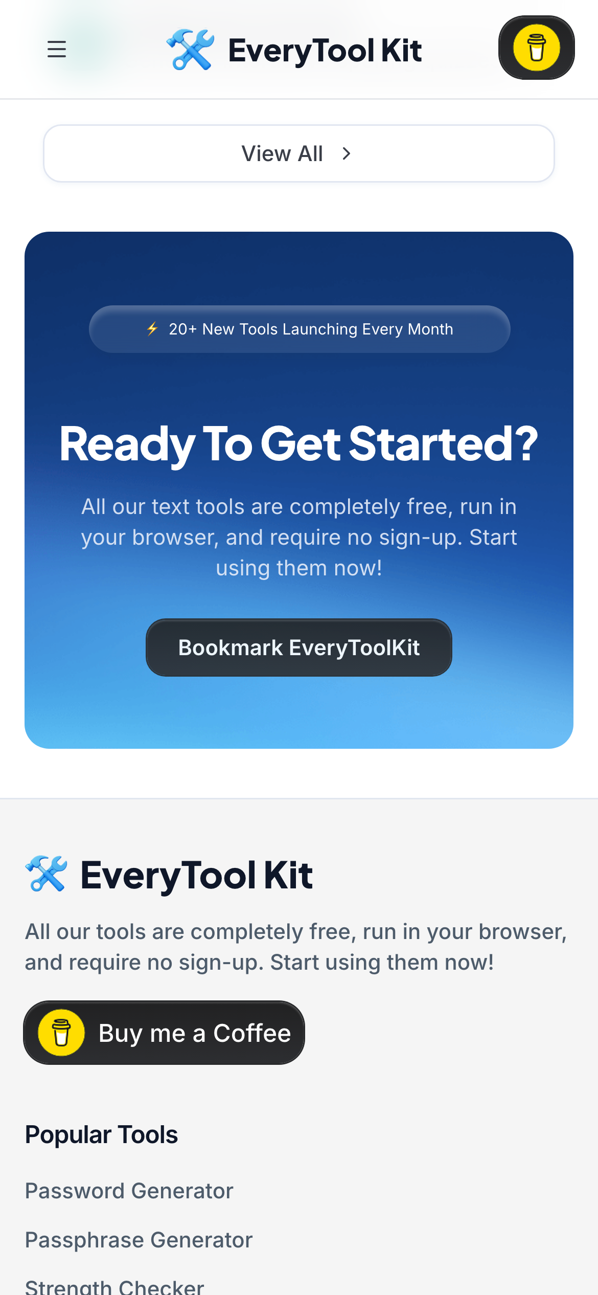 EveryToolkit.com is a free, open-source collection of over 500 online tools organized across 24+ categories. The platform provides utilities for developers, designers, and general users without requiring registration, payments, or account creation. The tool collection includes developer utilities such as JSON formatters, JWT decoders, regex testers, and base64 converters, alongside password generators, unit converters, calculators, and image processing tools. The site prioritizes a clean, fast user experience with minimal distractions—no popups or unnecessary clutter. All tools are accessible directly from a single website, eliminating the need to navigate between multiple platforms or services. EveryToolkit is supported by non-intrusive advertising rather than paywalls or subscription models. The project is open source, allowing community contributions and transparency in development. The platform is designed for developers, IT professionals, content creators, and anyone needing quick access to common utility tools in a consolidated location.