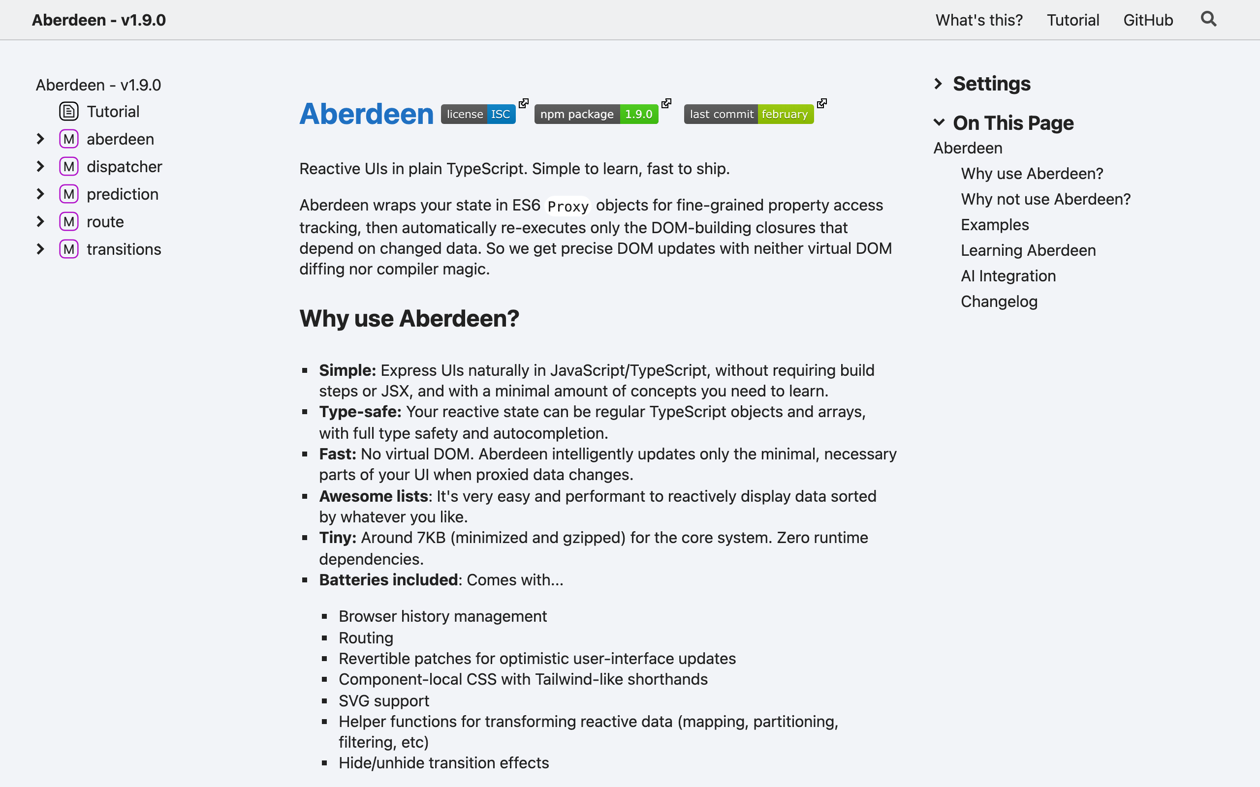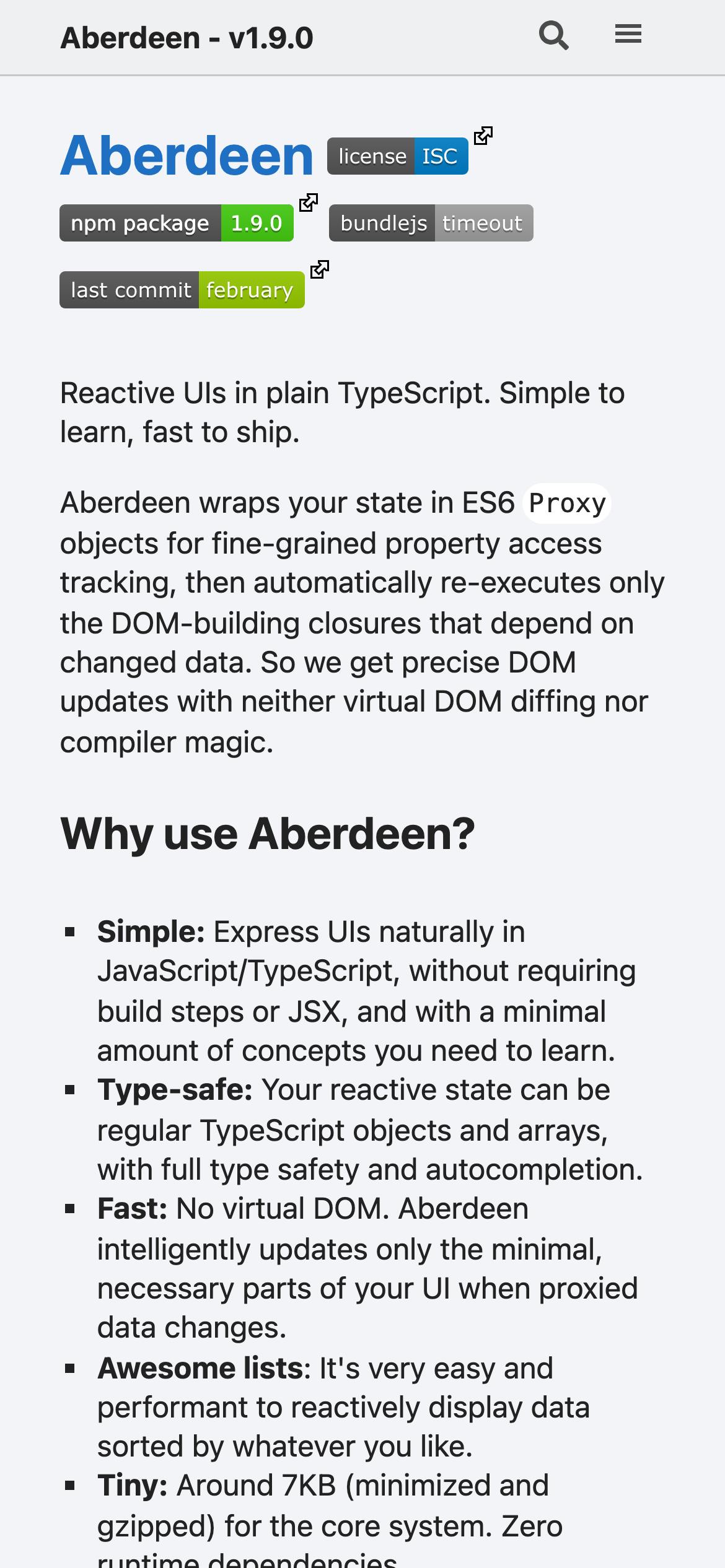 Aberdeen is a reactive UI framework for JavaScript that enables developers to build dynamic user interfaces using plain TypeScript. The framework implements fine-grained reactivity by wrapping application state in ES6 Proxy objects to track property-level changes, then automatically re-executing only the DOM-building functions that depend on modified data. Unlike some competing approaches, Aberdeen achieves precise DOM updates without relying on virtual DOM diffing or compile-time transformations. This approach simplifies the development model while maintaining performance efficiency. The framework was originally conceived in 2011 and has been validated through use in multiple startup projects before being released as open source. Aberdeen targets developers who prefer working with straightforward TypeScript rather than learning framework-specific template syntax or compilation steps. The learning curve is designed to be approachable for developers familiar with JavaScript fundamentals. Aberdeen suits teams looking to build reactive applications with minimal architectural overhead. It works well for projects where developers want direct control over state management and DOM updates without additional layers of abstraction. The framework is particularly relevant for developers who have evaluated other reactive libraries but seek a simpler, more transparent alternative that leverages standard JavaScript features.