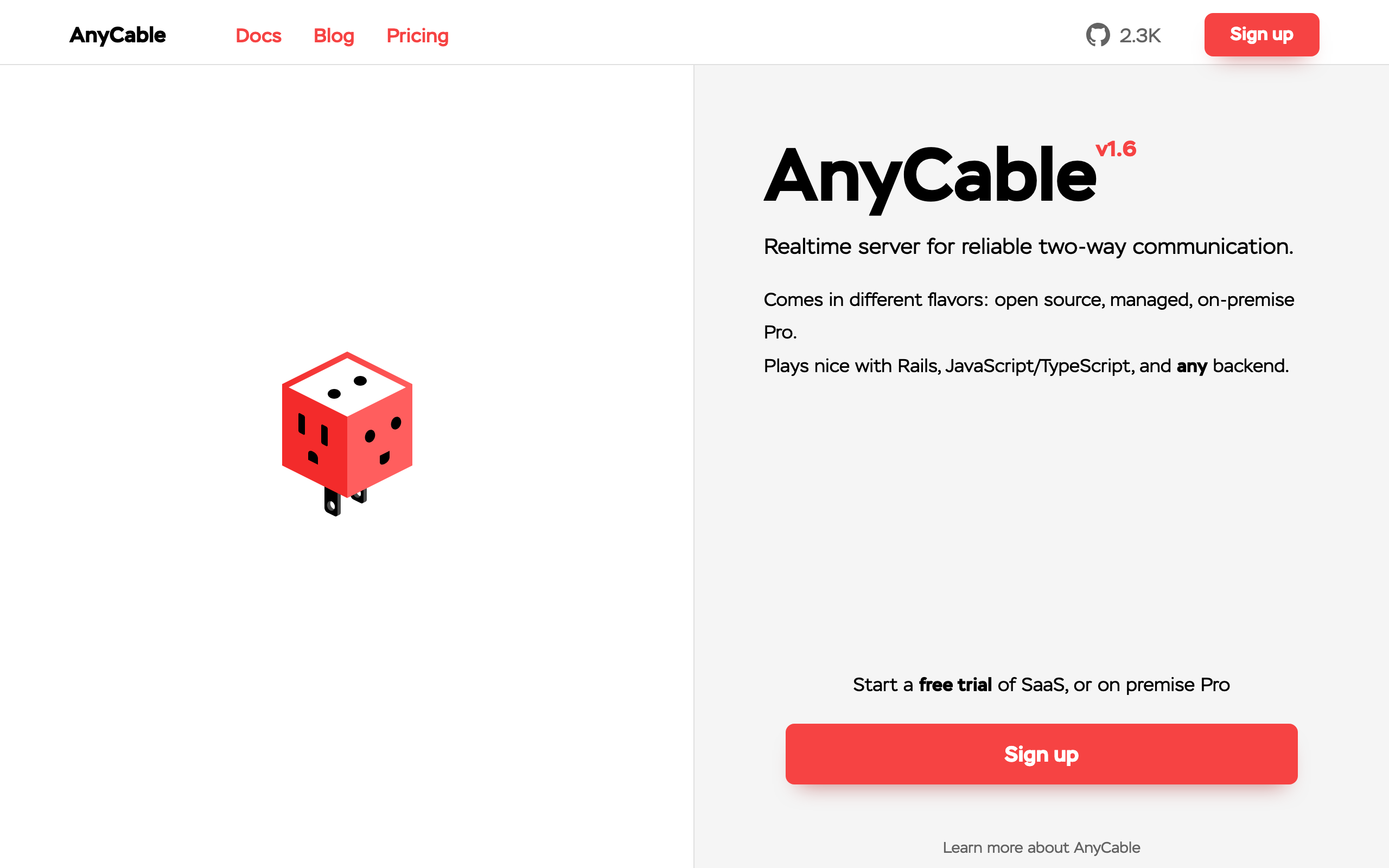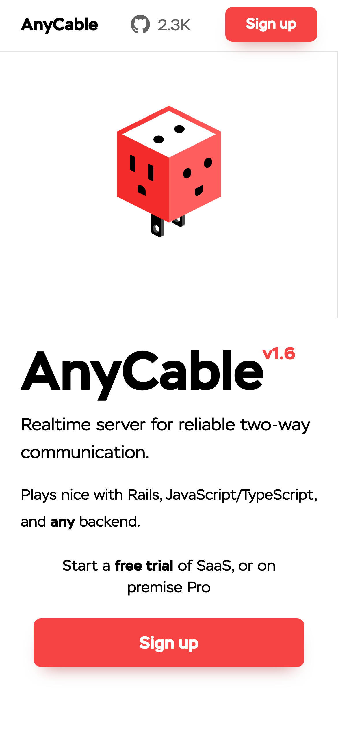 AnyCable is an open-source realtime server that enables reliable two-way communication over WebSockets, Server-sent events, and other protocols. It provides infrastructure for building realtime features such as chats, notifications, typing indicators, presence tracking, collaborative cursors, and data streaming. The platform is designed to work with any backend framework, decoupling realtime functionality from the main application server. This architecture allows developers to scale WebSocket connections independently and integrate realtime capabilities without being locked into a specific backend technology. AnyCable addresses the complexity of managing WebSocket connections at scale by handling connection management, message routing, and state synchronization. It supports broadcasting, subscriptions, and bidirectional communication patterns commonly needed in modern applications. The project is maintained as an open-source tool, making it accessible for developers who want production-ready realtime infrastructure without vendor lock-in. It's particularly suited for teams building feature-rich applications that require responsive, interactive experiences across multiple clients. By separating realtime concerns from application logic, AnyCable enables developers to maintain cleaner codebases while deploying scalable communication layers that can handle numerous concurrent connections efficiently.
