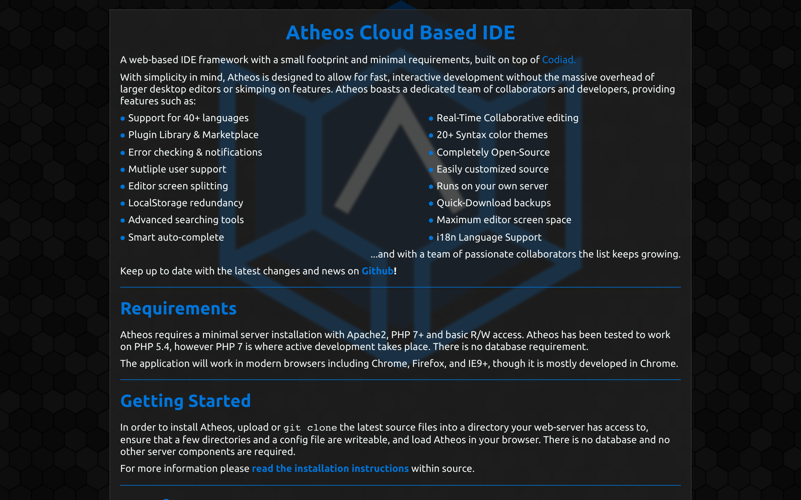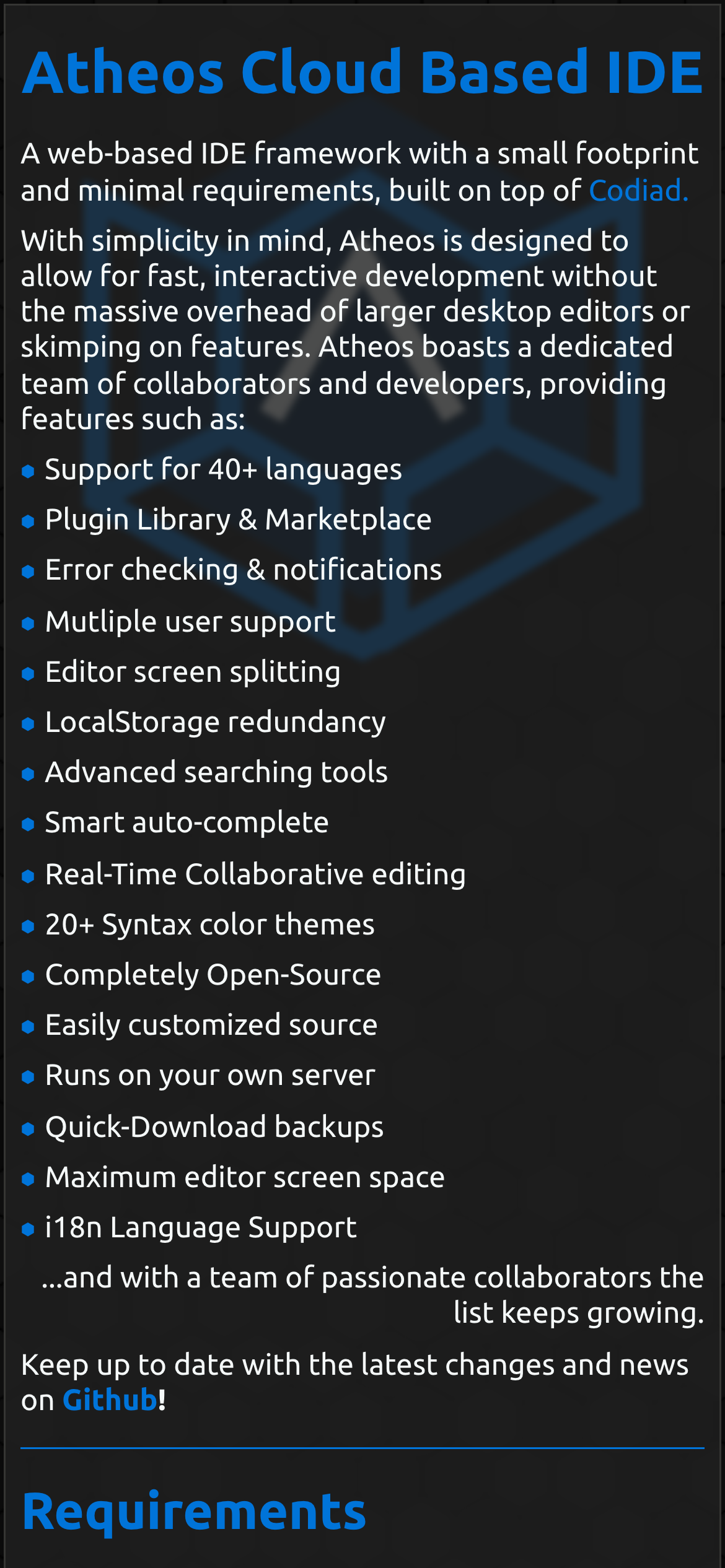 Web-based IDE framework with a small footprint and minimal requirements, continued from Codiad. )