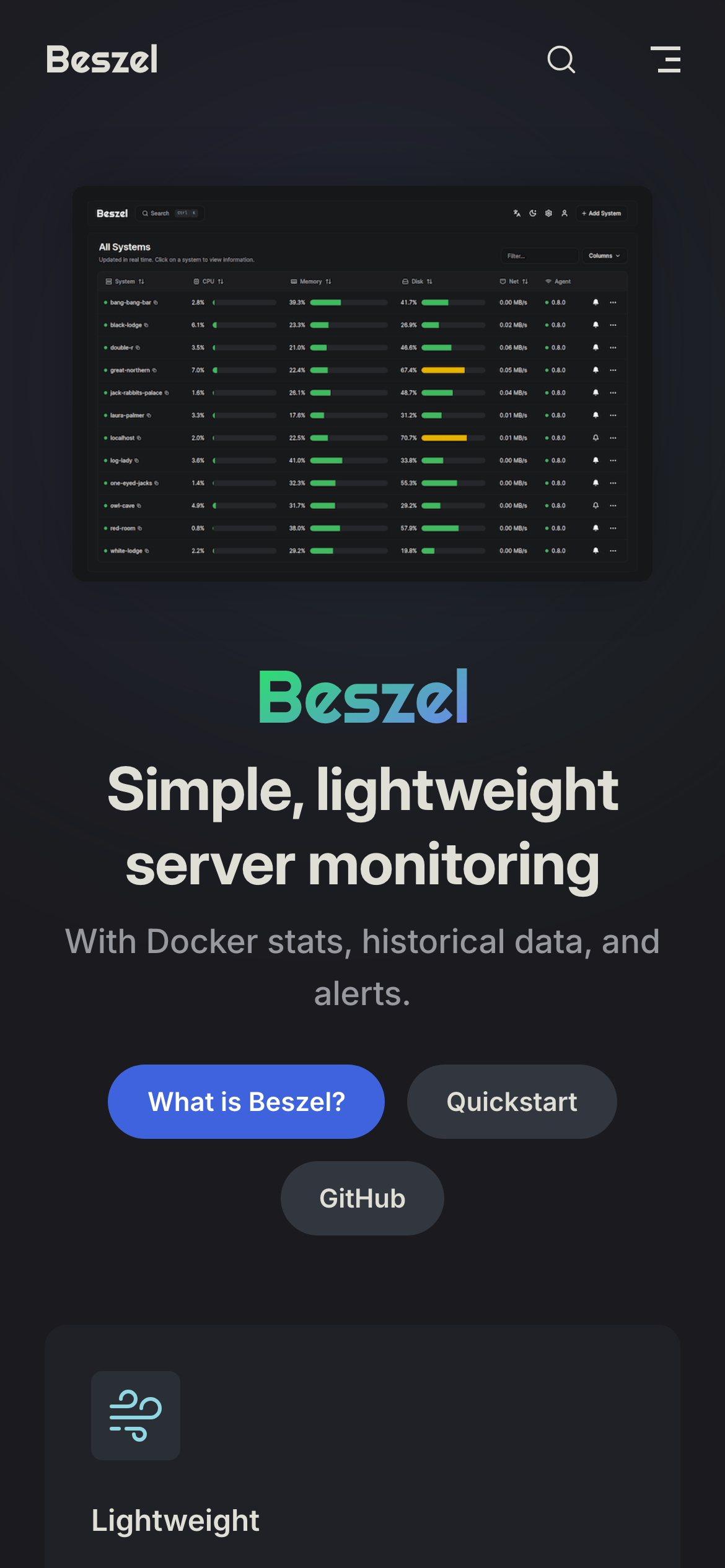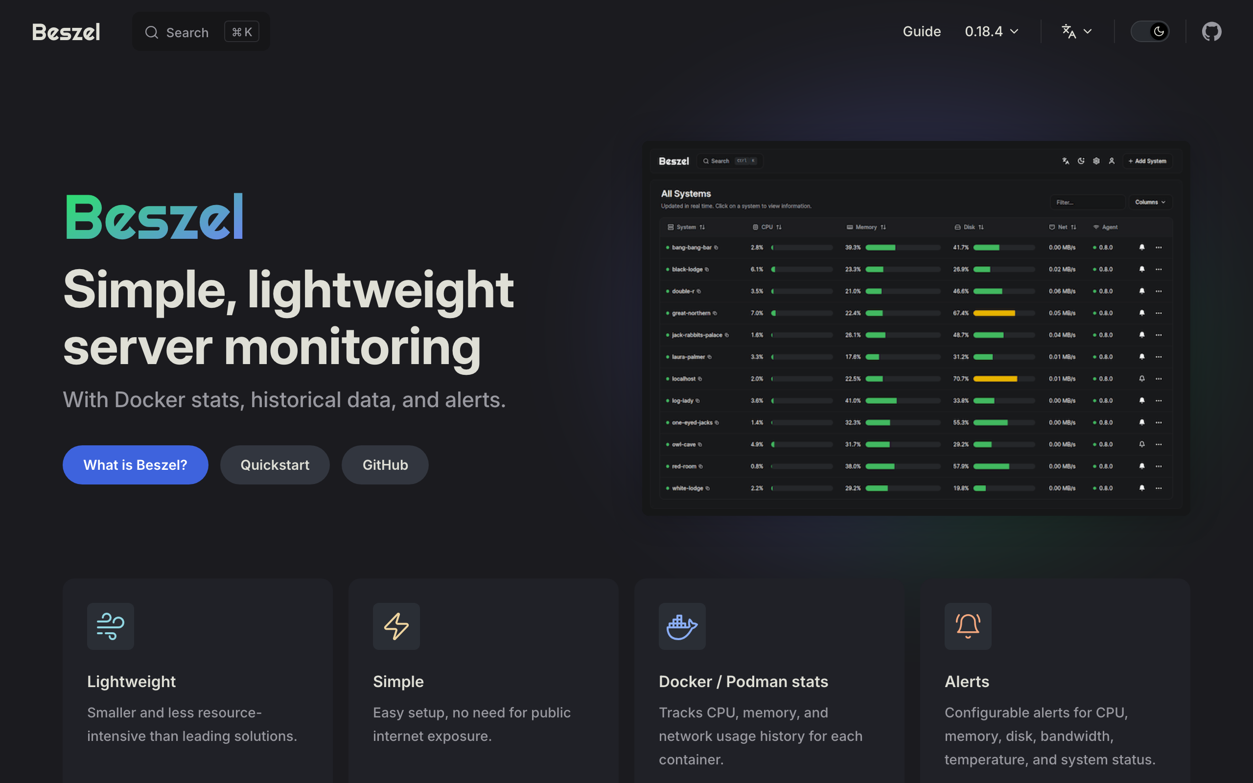 Beszel is a lightweight open-source server monitoring tool designed for developers and system administrators who need to track server performance without complex infrastructure. The platform provides real-time monitoring of key server metrics alongside historical data for trend analysis, allowing users to review performance over time. It includes native Docker statistics integration for containerized environments, making it suitable for modern deployment scenarios. The tool offers configurable alerts to notify users when metrics exceed defined thresholds, enabling proactive issue detection. Beszel is built as a self-hosted solution, giving users full control over their monitoring data and infrastructure. Its lightweight architecture makes it accessible for small deployments and resource-constrained environments where heavier monitoring solutions may be impractical. The project is maintained as open source on GitHub, allowing the community to review code, contribute improvements, and deploy without licensing constraints. Beszel suits teams looking for straightforward server visibility without the overhead of enterprise monitoring platforms, particularly those already using containerization and seeking Docker-aware monitoring capabilities.