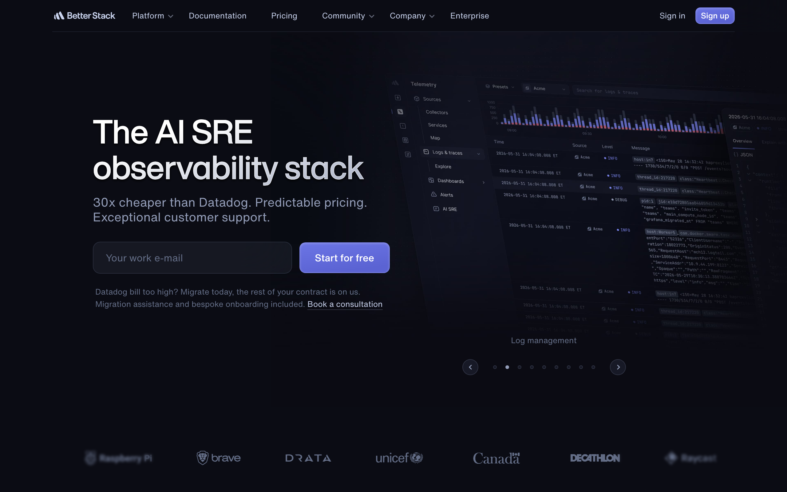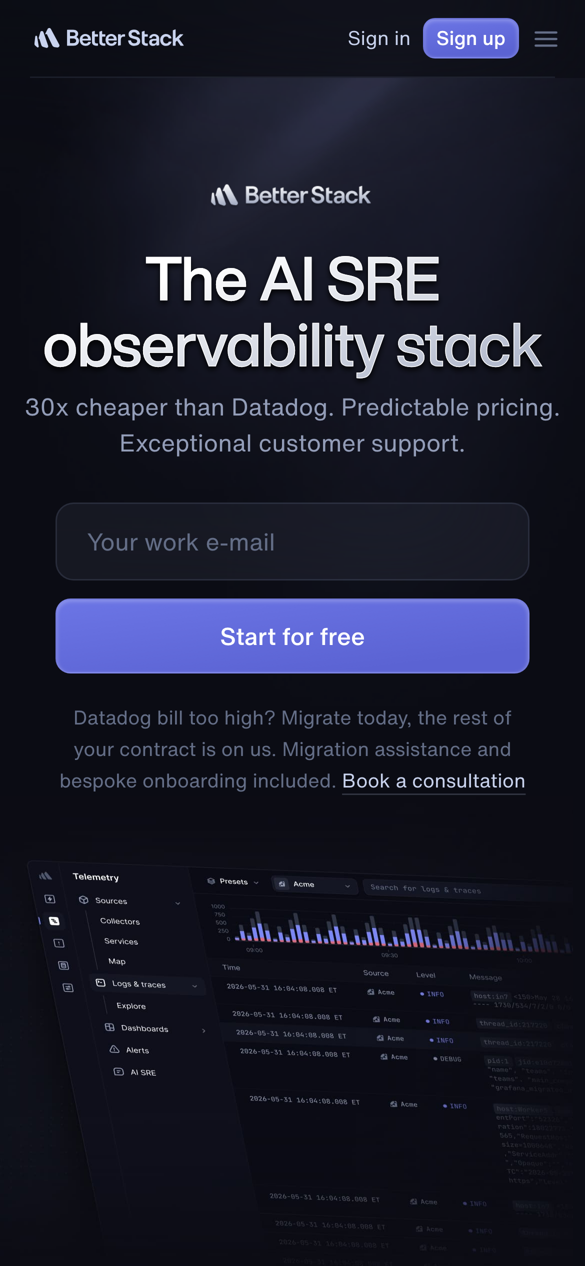 Better Stack is an observability platform designed for modern engineering teams to monitor, troubleshoot, and manage their systems. The platform consolidates multiple monitoring functions into a single interface, including incident management, on-call scheduling, log aggregation, metrics, traces, and error tracking. The product serves engineering teams of various sizes who need centralized visibility into their infrastructure and applications. It supports teams looking to reduce mean time to resolution (MTTR) during incidents and streamline their monitoring workflows. Key features include AI-powered SRE capabilities and MCP server support, which enable teams to automate common observability tasks. The platform integrates incident response processes with monitoring data, allowing teams to correlate alerts with logs, metrics, and errors to identify root causes more efficiently. Better Stack is available as open source software, making it accessible for teams who prefer to self-host their observability infrastructure. The company offers a commercial version with additional features and support, backed by a 60-day money back guarantee. The platform has been adopted by over 7,000 customers across different industries and organization sizes.