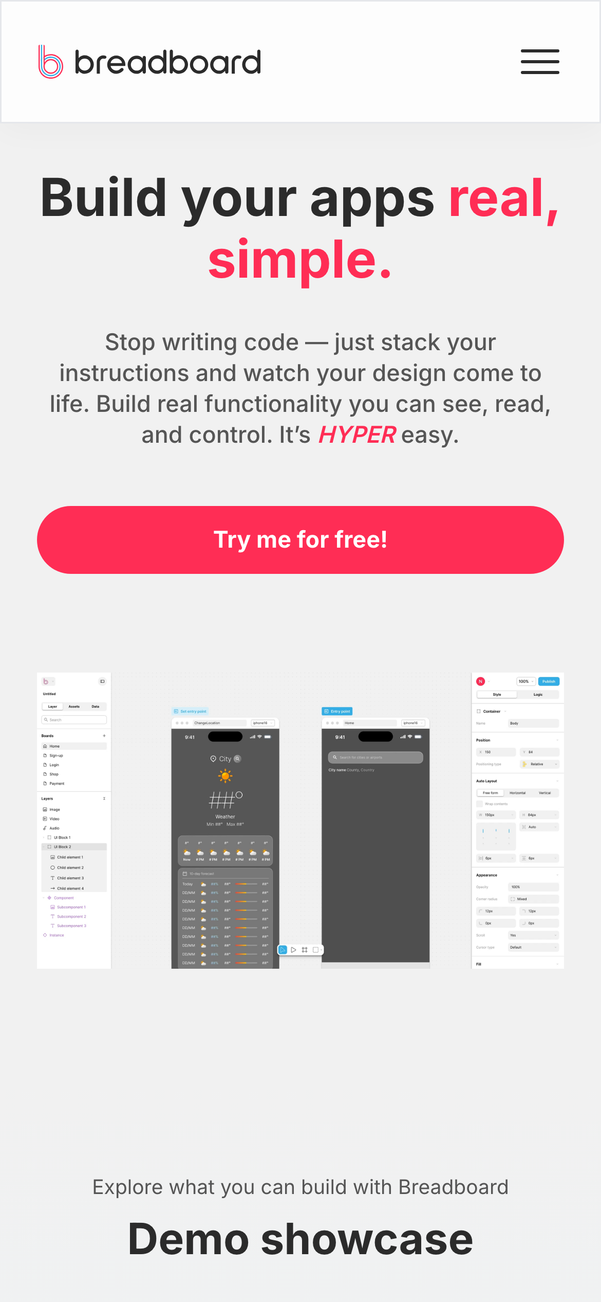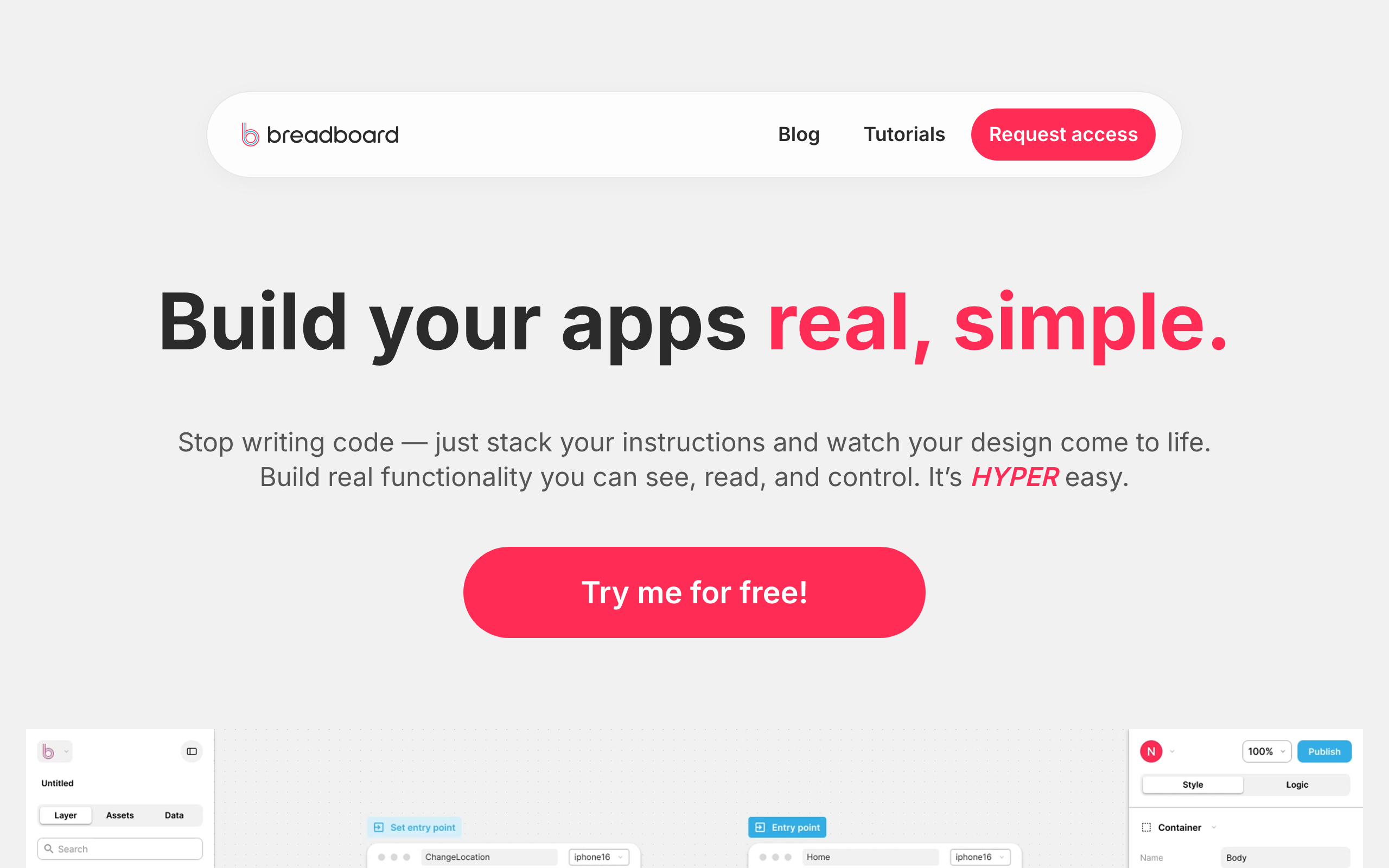 Hey HN! I’m Simone. We re-built Breadboard, a visual app builder that mixes Figma-style UI design with Shortcuts-style logic so you can build, preview, and publish interactive web apps directly from the canvas. What it does Design UIs visually with a flexible canvas –like Figma–. Define ap