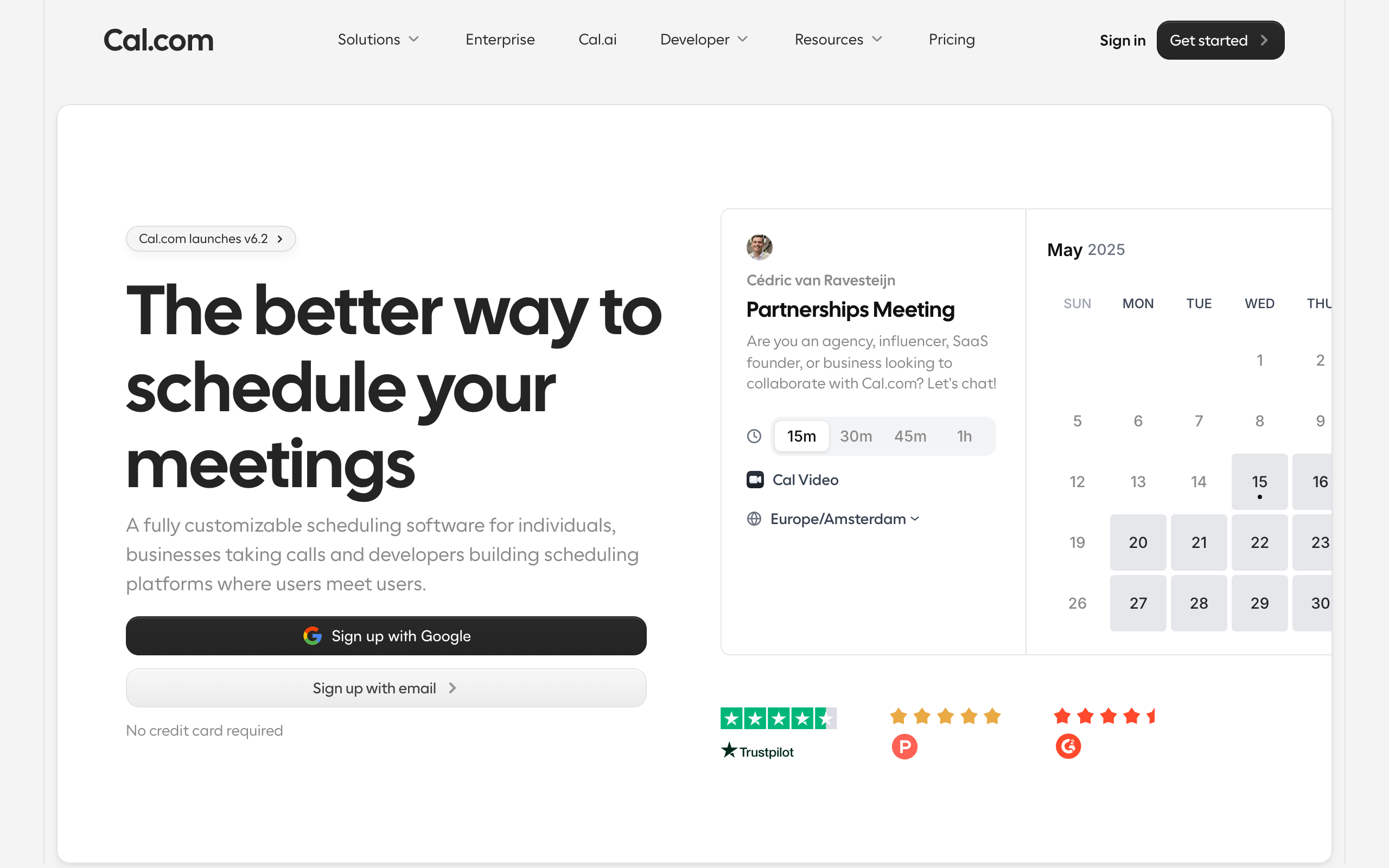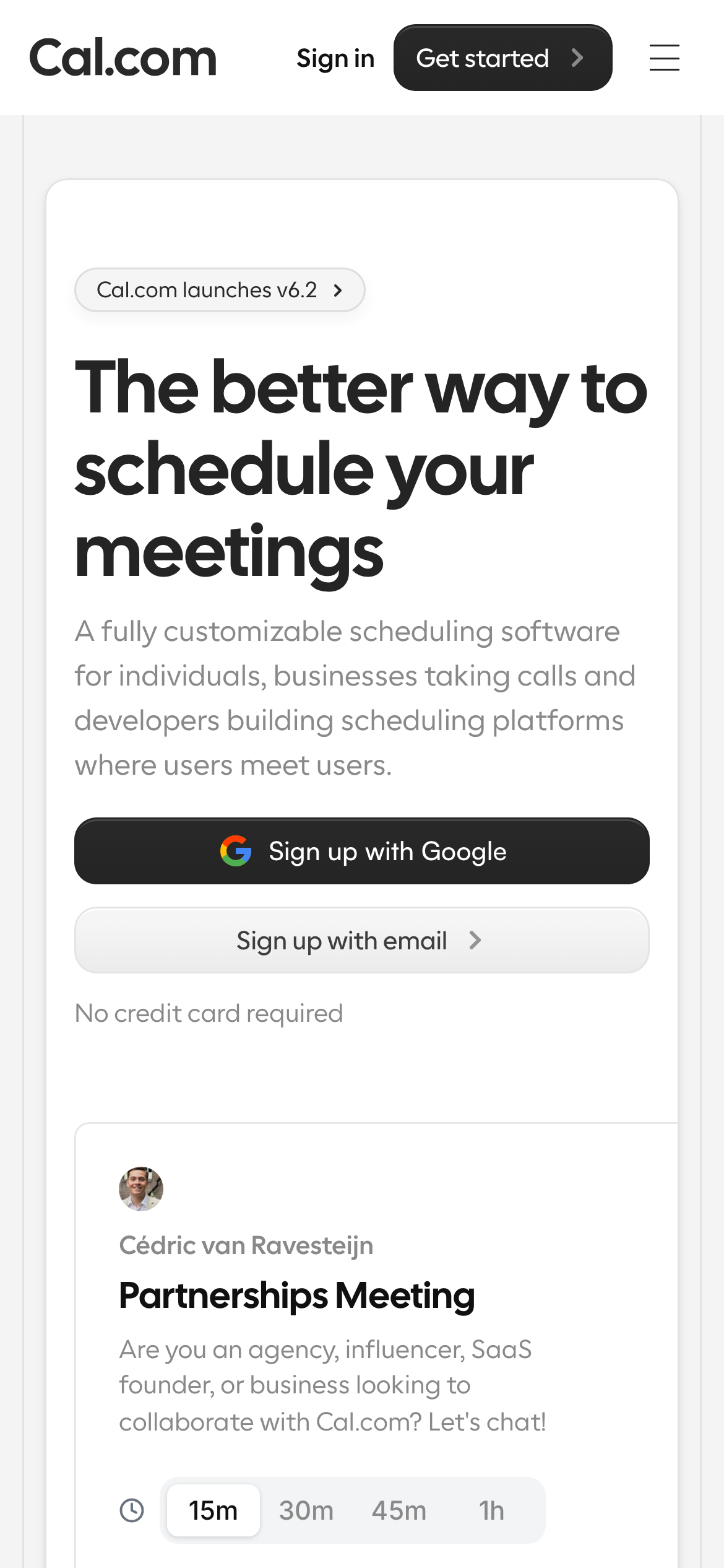 A fully customizable scheduling software for individuals, businesses taking calls and developers building scheduling platforms where users meet users.