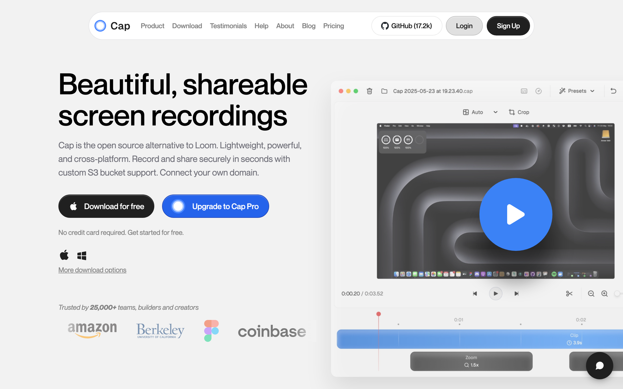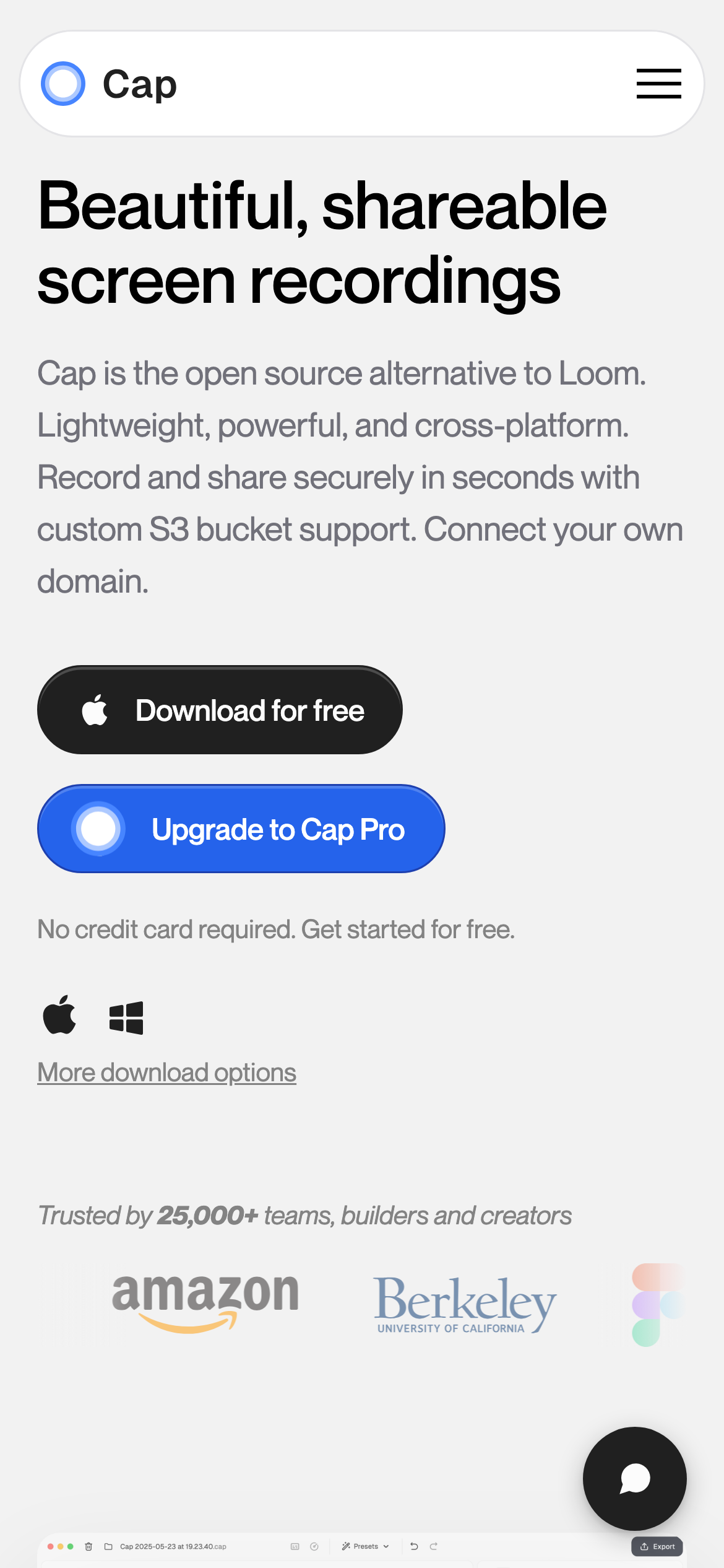 Cap is an open-source screen recording and sharing application that provides a lightweight alternative to Loom. Available for macOS and Windows, Cap enables users to record their screen and share videos quickly without the constraints of proprietary software. Being open-source, the codebase is publicly accessible on GitHub, allowing developers to review, modify, and contribute to the project. Cap is designed for users who need straightforward screen recording functionality, whether for creating tutorials, demonstrations, bug reports, or async communication. The application emphasizes cross-platform compatibility and ease of use, allowing recordings to be captured and shared in minimal steps. As a free, open-source tool, Cap appeals to individuals and teams seeking screen recording capabilities without subscription fees or vendor lock-in. The project represents an alternative for those who prefer transparent, community-driven software development or require the flexibility to self-host or customize their recording solution.