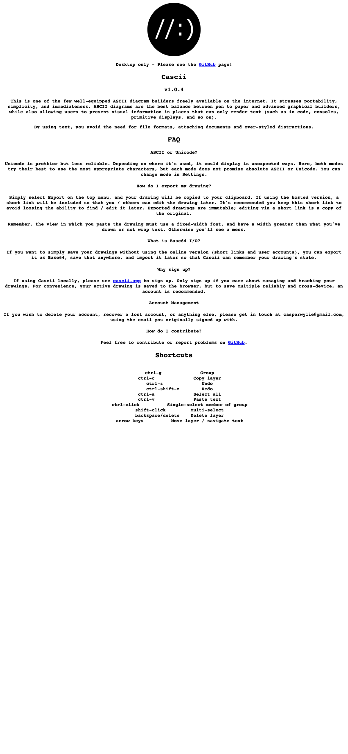 CASCII is a free, open-source ASCII diagram builder designed for creating text-based diagrams directly in a web browser. Built entirely in vanilla Javascript with zero dependencies, CASCII requires no servers, build tools, external libraries, stylesheets, or markup to function. Users can begin creating diagrams immediately by opening a single HTML file. The tool is particularly suited for developers, technical writers, and documentation creators who need to produce ASCII art diagrams for code repositories, technical specifications, or plaintext documentation. Its lightweight architecture makes it accessible across different environments and systems without setup requirements. Key features include support for both ASCII and Unicode characters, enabling users to create a variety of diagrams from simple flowcharts to complex system architecture visualizations. The no-dependency approach ensures portability and keeps the application simple and maintainable. Being fully open-source with its code available on GitHub, CASCII allows developers to inspect the codebase, contribute improvements, or adapt the tool for their specific needs. The project is currently in beta status, indicating ongoing development while remaining functional for practical use. CASCII targets users who prefer straightforward, offline-capable solutions for diagram creation without the overhead of heavier design applications or cloud-based tools.