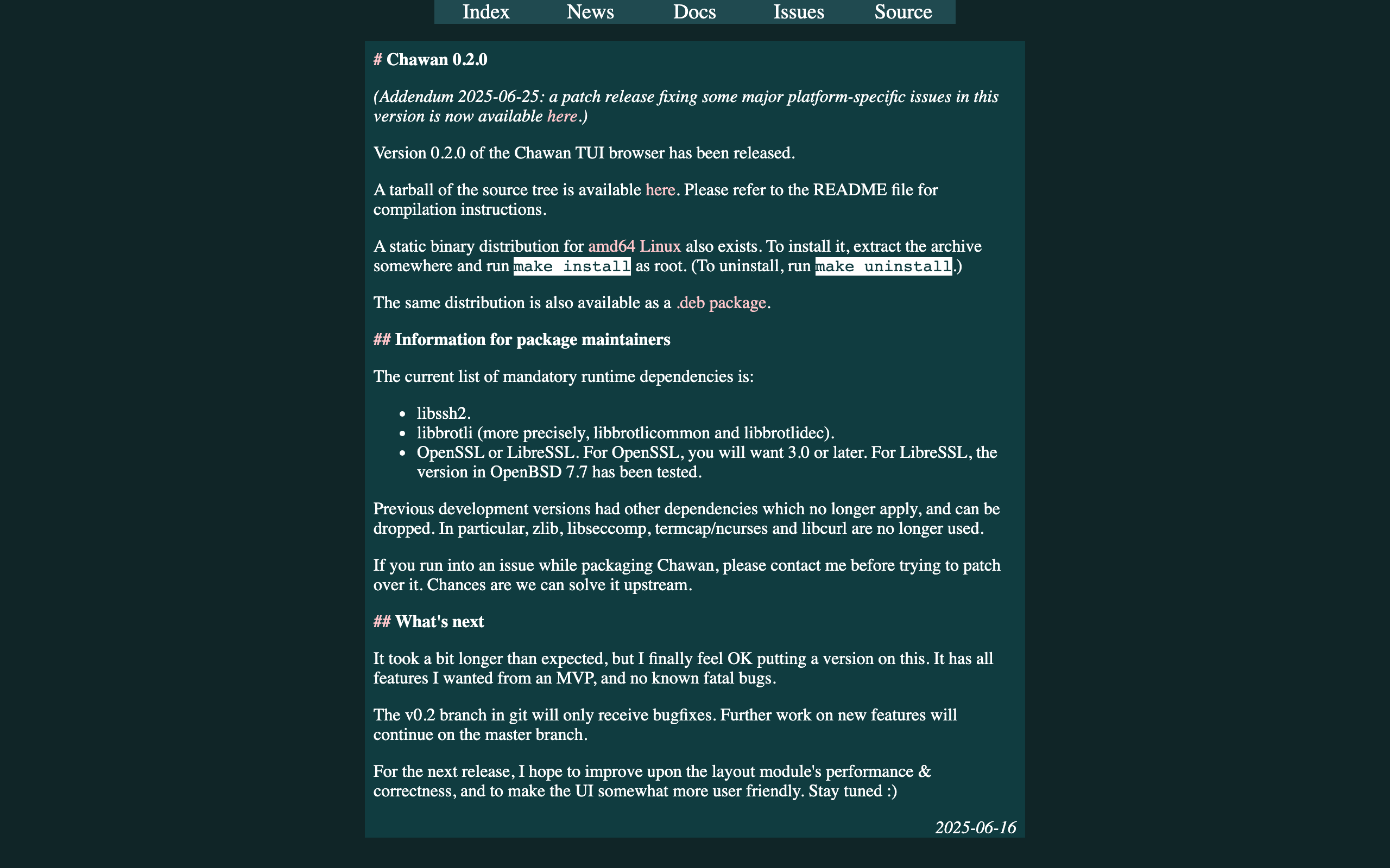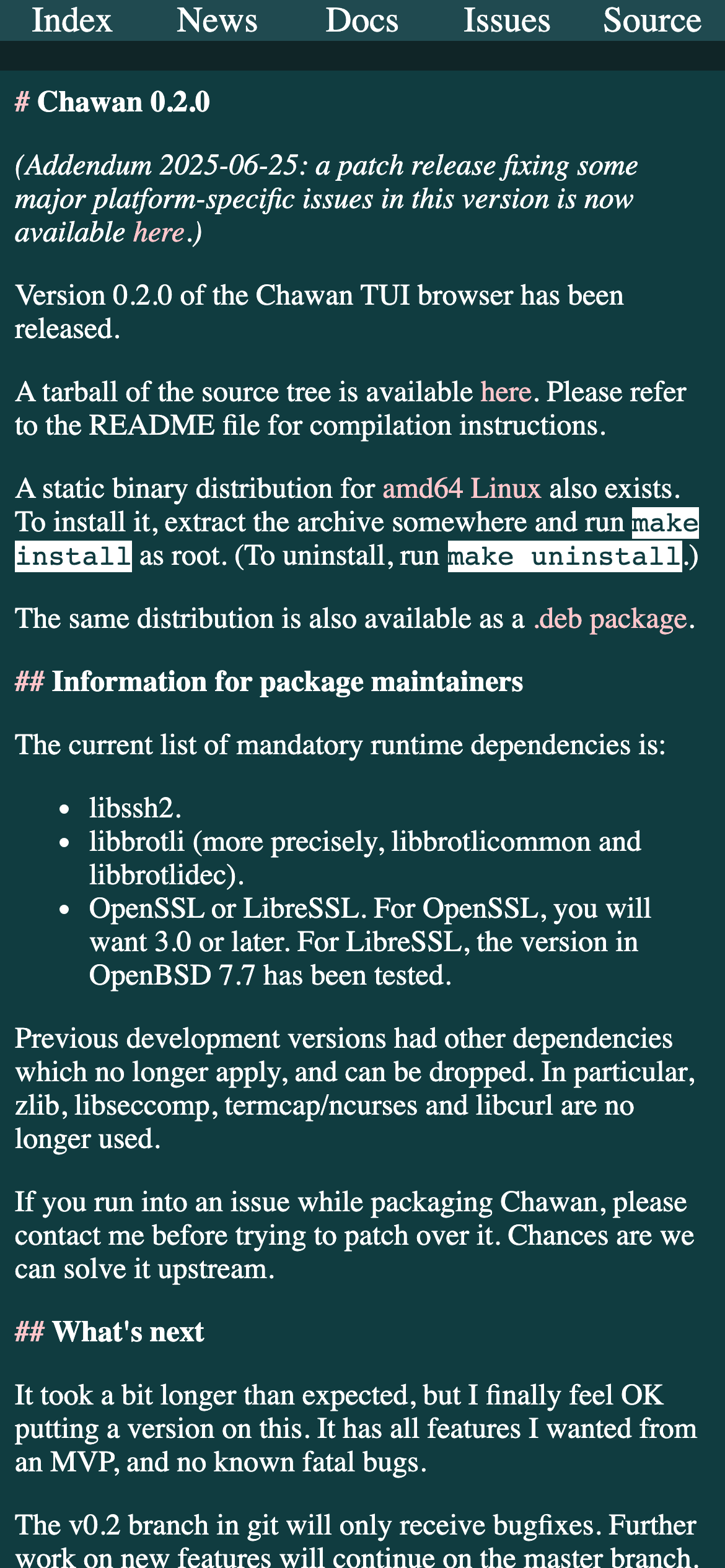 Chawan is a terminal-based web browser written in Nim that enables web browsing within command-line environments. It supports CSS rendering and JavaScript execution, with inline image display through sixel and kitty graphics protocols. The browser handles multiple protocols beyond HTTP(S), including SFTP, FTP, Gopher, and Gemini, making it suitable for accessing diverse internet resources from the terminal. Originally developed as a w3m clone, Chawan maintains a similar user interface while offering extended functionality. The application targets developers and advanced users who prefer terminal-based workflows or require web access in environments where graphical browsers are unavailable or impractical. Version 0.2.0 represents the first stable release with an MVP feature set and no known critical bugs. The software has minimal runtime dependencies including libssh2, libbrotli, and OpenSSL or LibreSSL, with streamlined requirements compared to earlier development versions. Binary distributions are available for AMD64 Linux systems, alongside source code for compilation on other platforms. Chawan provides practical web browsing capabilities within terminal constraints, with active development planned for improving layout rendering performance and UI refinements in future releases.