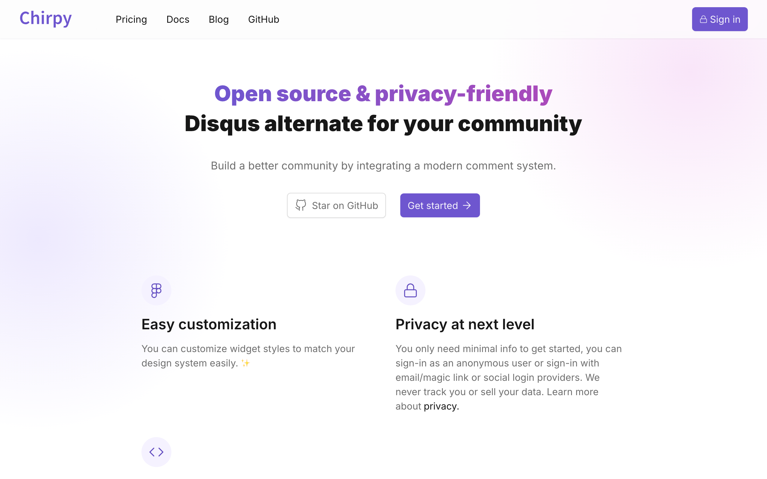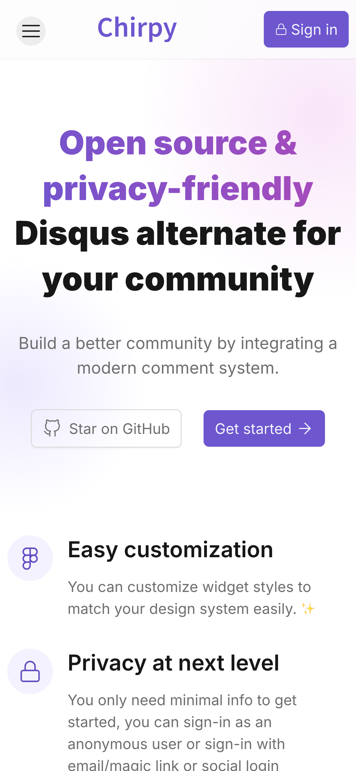 Chirpy is an open-source comment system designed as a privacy-conscious alternative to Disqus. It enables website owners and content creators to add customizable comment sections to their sites while maintaining user privacy standards. The platform is built for developers and publishers who want commenting functionality without relying on third-party services that collect extensive user data. The project is fully open source and available on GitHub, allowing developers to self-host, modify, and contribute to the codebase. Chirpy can be deployed on Vercel or other hosting platforms, giving users flexibility in how they implement the solution. The system focuses on providing a lightweight, privacy-friendly commenting experience with customization options to match individual site designs and requirements. Chirpy is particularly suited for bloggers, documentation sites, and content platforms that prioritize user privacy while still wanting to foster community engagement through comments. By eliminating dependence on external comment systems, it offers greater control over data handling and user experience. The open-source nature makes it accessible to those who value transparency and want to avoid proprietary black-box solutions.