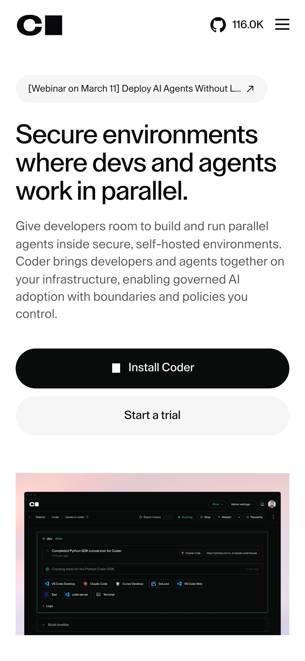 Coder is an open-source platform for creating and managing self-hosted cloud development environments. It enables organizations to provision secure, isolated workspaces where developers can code, test, and collaborate without relying on external cloud services. The platform is designed for development teams and enterprises that require control over their infrastructure and data. It allows administrators to define standardized development environments as code, manage resource allocation, and enforce governance policies across multiple workspaces. Coder integrates with existing infrastructure, supporting various compute platforms and container runtimes. Key capabilities include workspace provisioning, resource management, audit logging, and role-based access controls. The platform supports both individual developers and team-based workflows, making it suitable for organizations of various sizes. Coder distinguishes itself through its self-hosted architecture, which gives organizations complete control over security, compliance, and infrastructure costs. It enables running AI coding agents at scale within a governed environment, with full visibility into permissions and audit trails. The open-source model allows teams to inspect the codebase, customize functionality, and avoid vendor lock-in. The platform serves as an alternative to cloud-based development environments, offering organizations that need on-premises solutions or require specific compliance requirements a way to maintain standardized development infrastructure while preserving control over their technical stack.