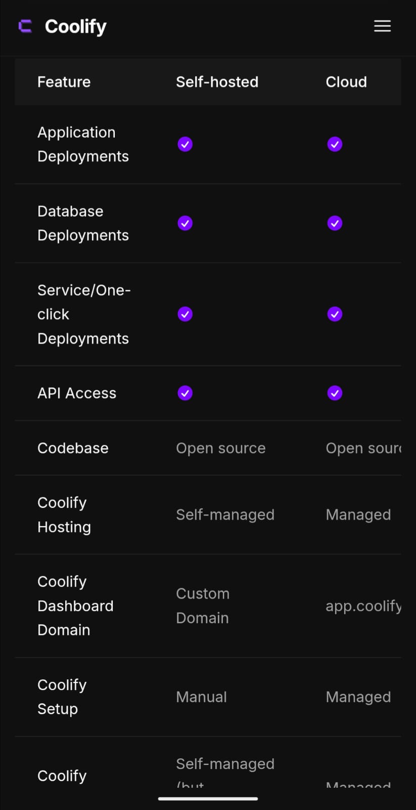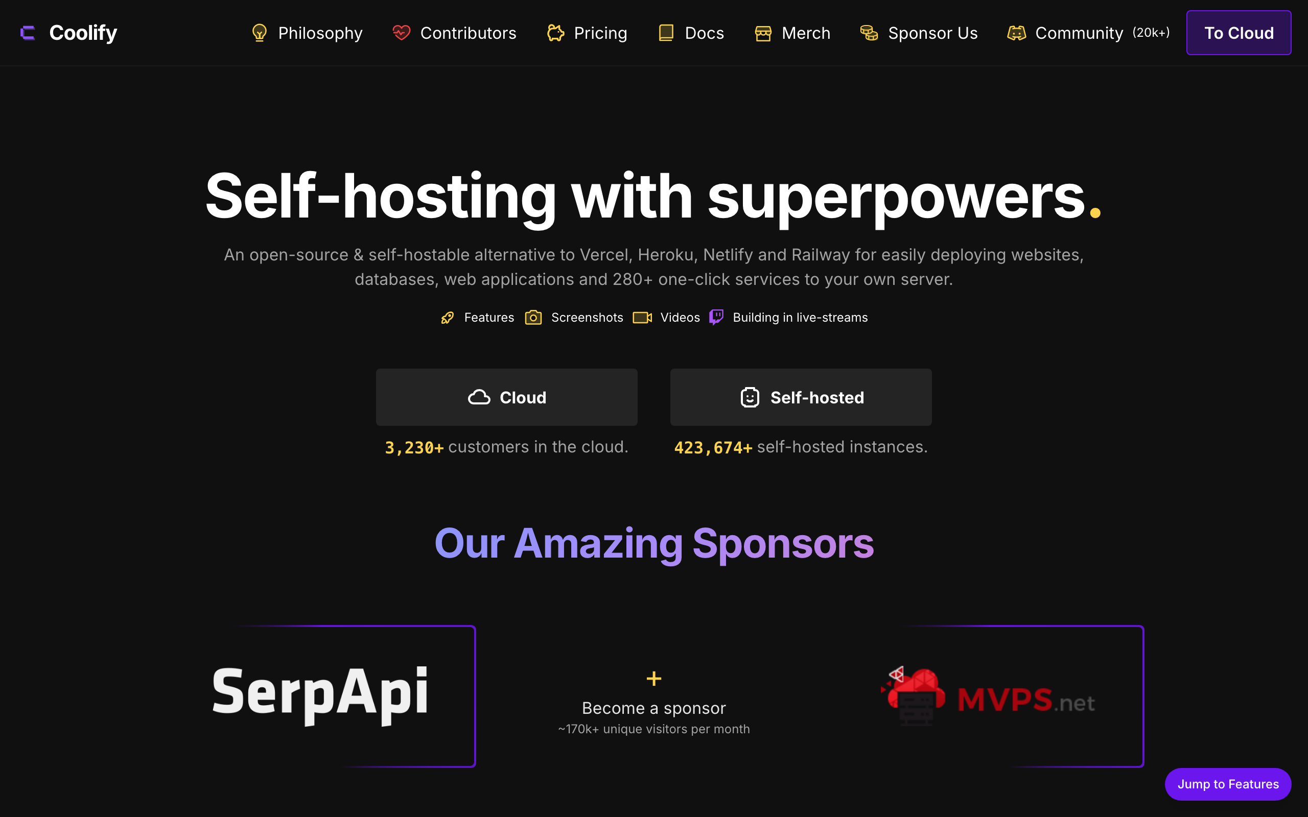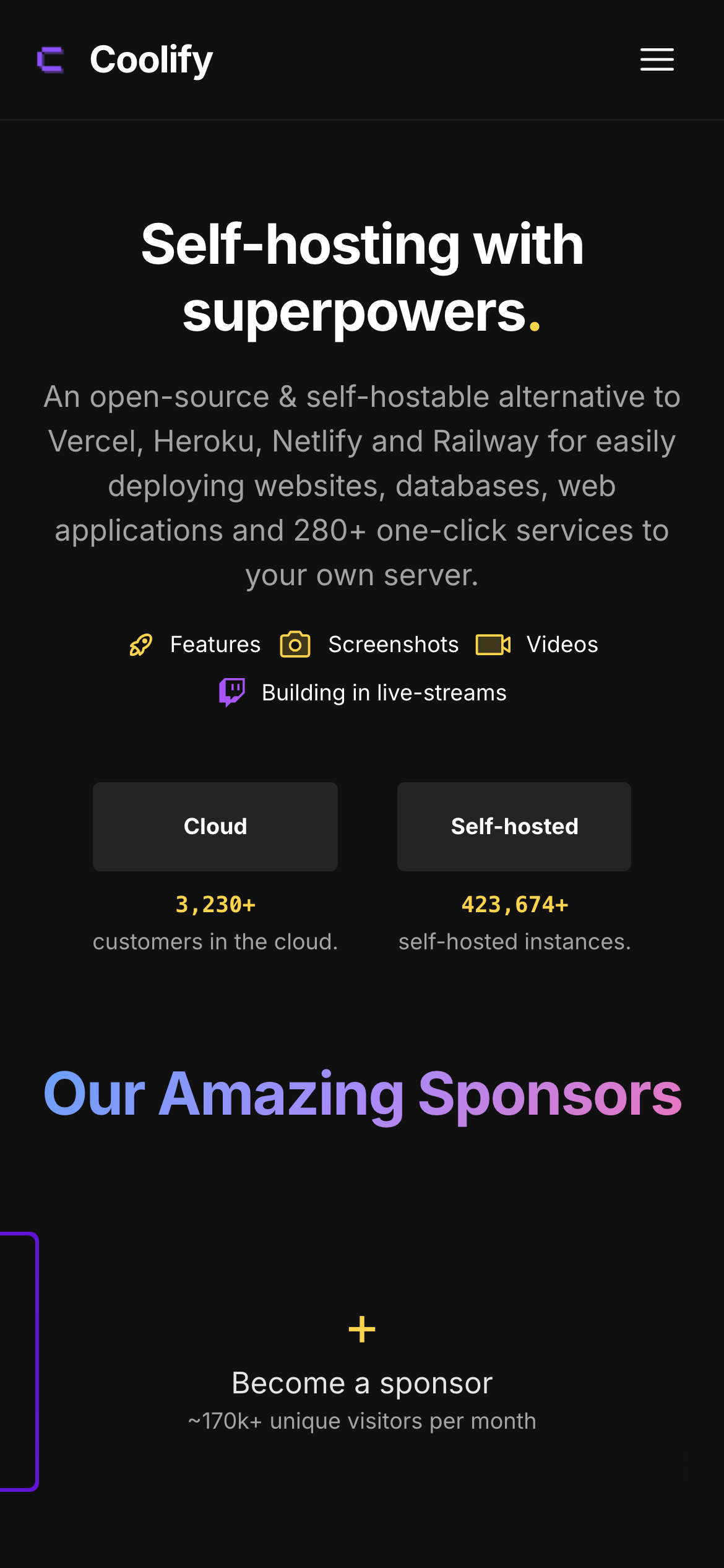 Coolify is an open-source, self-hostable platform that provides an alternative to managed deployment services like Vercel, Heroku, Netlify, and Railway. It enables users to deploy websites, databases, web applications, and over 280 pre-configured services directly to their own servers. The platform is designed for developers and organizations seeking greater control over their infrastructure while reducing dependency on third-party hosting providers. By allowing self-hosting, Coolify gives users ownership of their deployments and data, with the flexibility to customize their environment according to specific needs. Key features include support for deploying multiple application types, access to a large library of one-click installable services, and a command-line interface for streamlined management. The project is fully open-source and available on GitHub, allowing community contributions and transparency in development. Coolify is distributed as free, open-source software, making it accessible to users with varying budgets. The installation process is straightforward, with dedicated scripts provided for Linux, macOS, and Windows systems. This approach appeals to developers who prefer open standards, those managing infrastructure costs, and organizations with specific compliance or data residency requirements that preclude using cloud platforms.