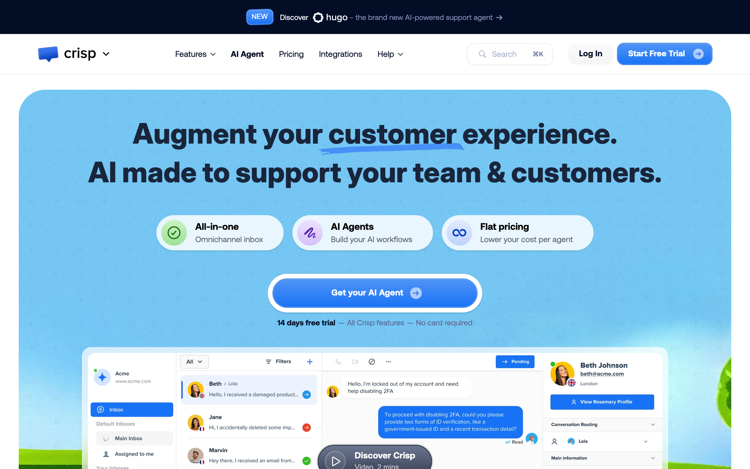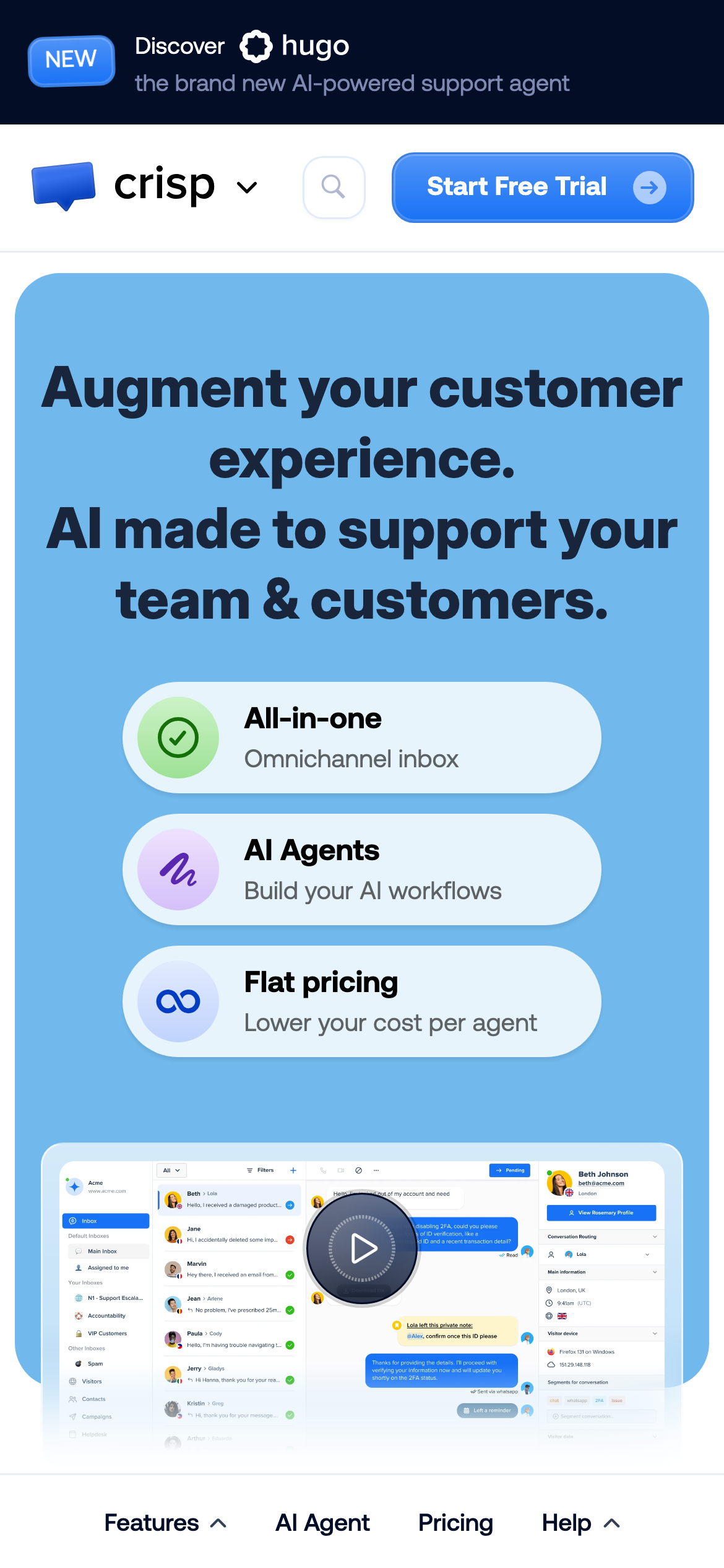 Crisp is an all-in-one business messaging platform designed to streamline customer communications. The platform consolidates multiple messaging channels into a single interface, allowing businesses to manage conversations with customers across email, chat, social media, and other messaging services from one centralized location. The platform is built for businesses of various sizes that need to coordinate customer interactions across multiple communication channels. Teams can collaborate on customer conversations, assign messages to specific team members, and maintain conversation history in one place. This approach reduces the need for switching between separate applications and helps prevent messages from being missed or duplicated. Crisp offers features typical of business messaging platforms, including conversation management, team collaboration tools, and integration capabilities with other business applications. The platform aims to improve response times and customer service efficiency by organizing all incoming messages in a unified inbox. The service operates on a web-based model, making it accessible from various devices without requiring software installation. Crisp positions itself as a straightforward alternative to more complex customer service platforms, focusing on core messaging functionality for businesses seeking a consolidated communication hub.