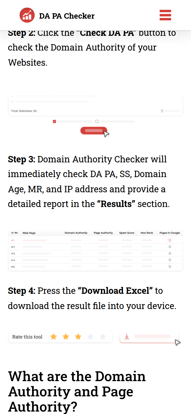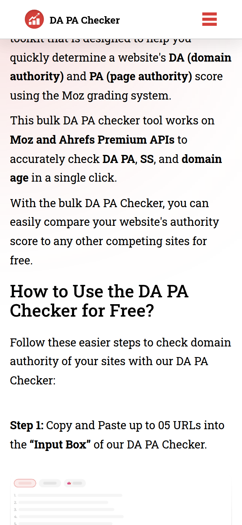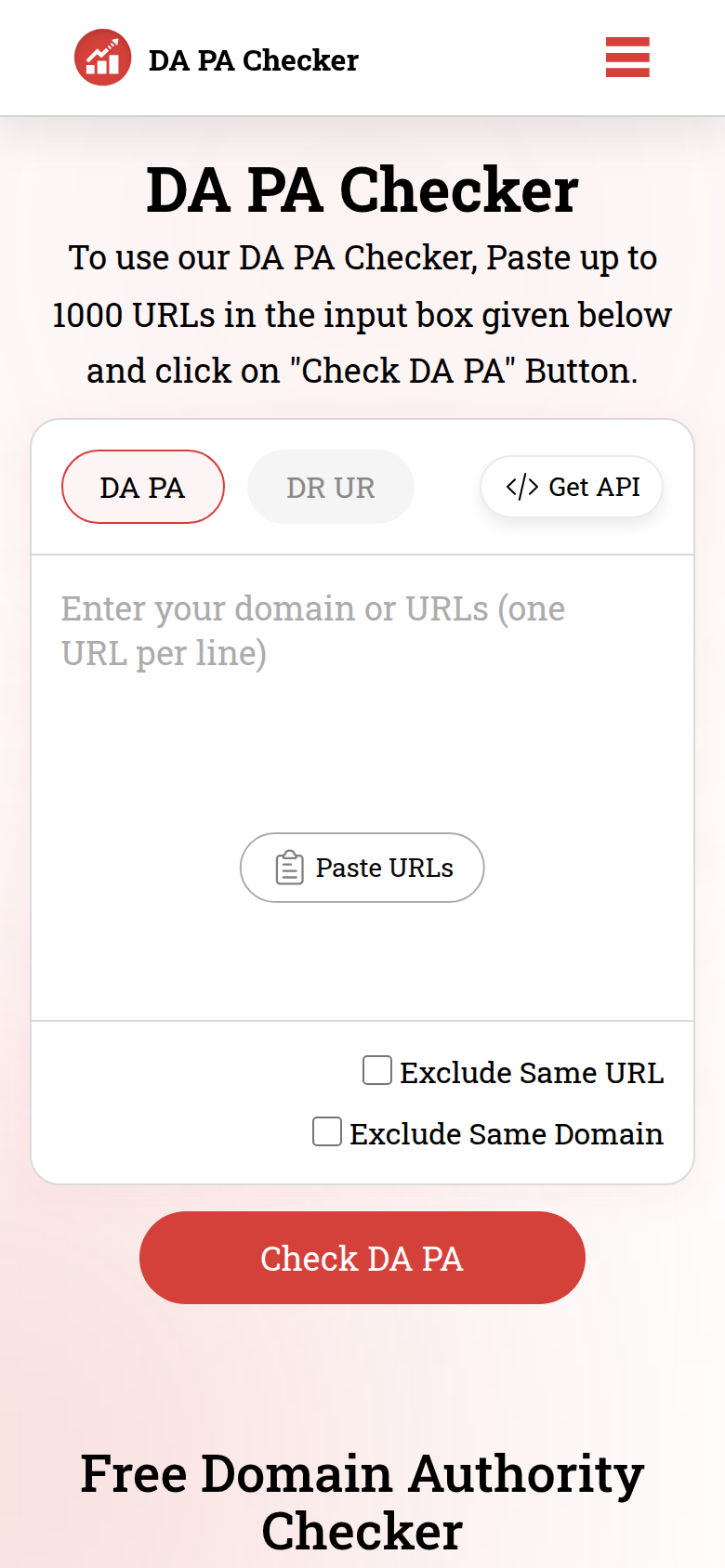 - Check Domain Authority (DA) and Page Authority (PA) for up to 1000 URLs at once