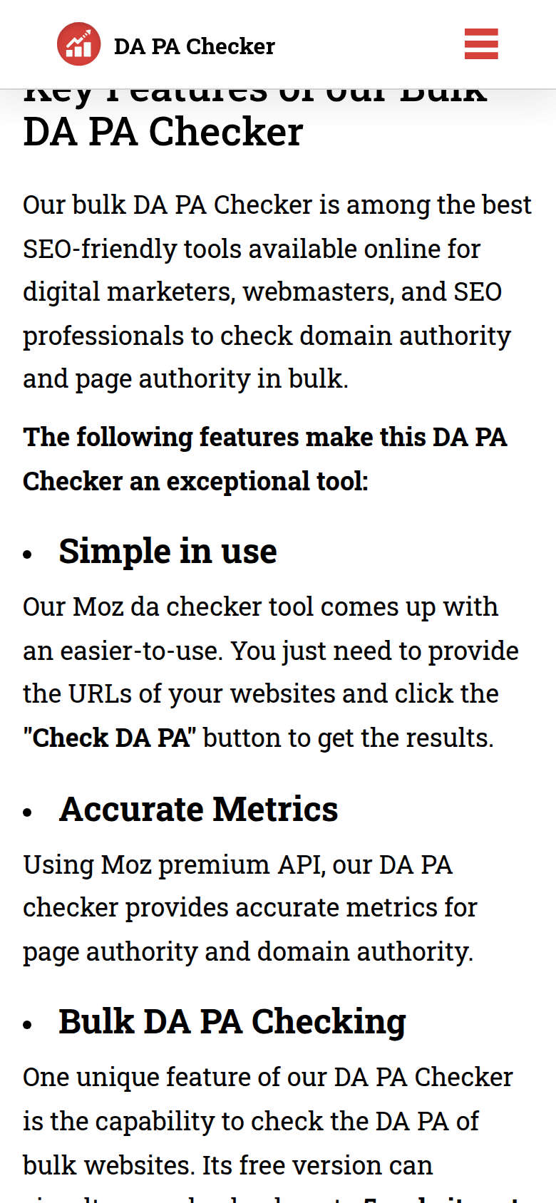 DA PA Checker is a free online tool designed to analyze Domain Authority (DA) and Page Authority (PA) metrics for websites. The tool allows users to check these SEO metrics for up to 1000 URLs in a single session without requiring account registration or signup. Domain Authority and Page Authority are metrics developed by Moz that estimate how likely a website or individual page is to rank in search engine results. DA PA Checker makes these metrics accessible to website owners, digital marketers, SEO professionals, and content creators who need to evaluate domain strength and page-level ranking potential. The primary differentiator of DA PA Checker is its bulk checking capability, enabling users to analyze multiple URLs simultaneously rather than checking one domain at a time. This functionality is particularly useful for competitive analysis, link prospecting, and website audits where assessing multiple properties is necessary. The tool is suitable for anyone involved in search engine optimization, link building, or website analysis who needs quick access to DA and PA metrics. By offering free access without mandatory account creation, DA PA Checker provides a straightforward solution for users seeking baseline authority metrics without financial investment or registration barriers. The service can be accessed directly through their website at dapachecker.org.