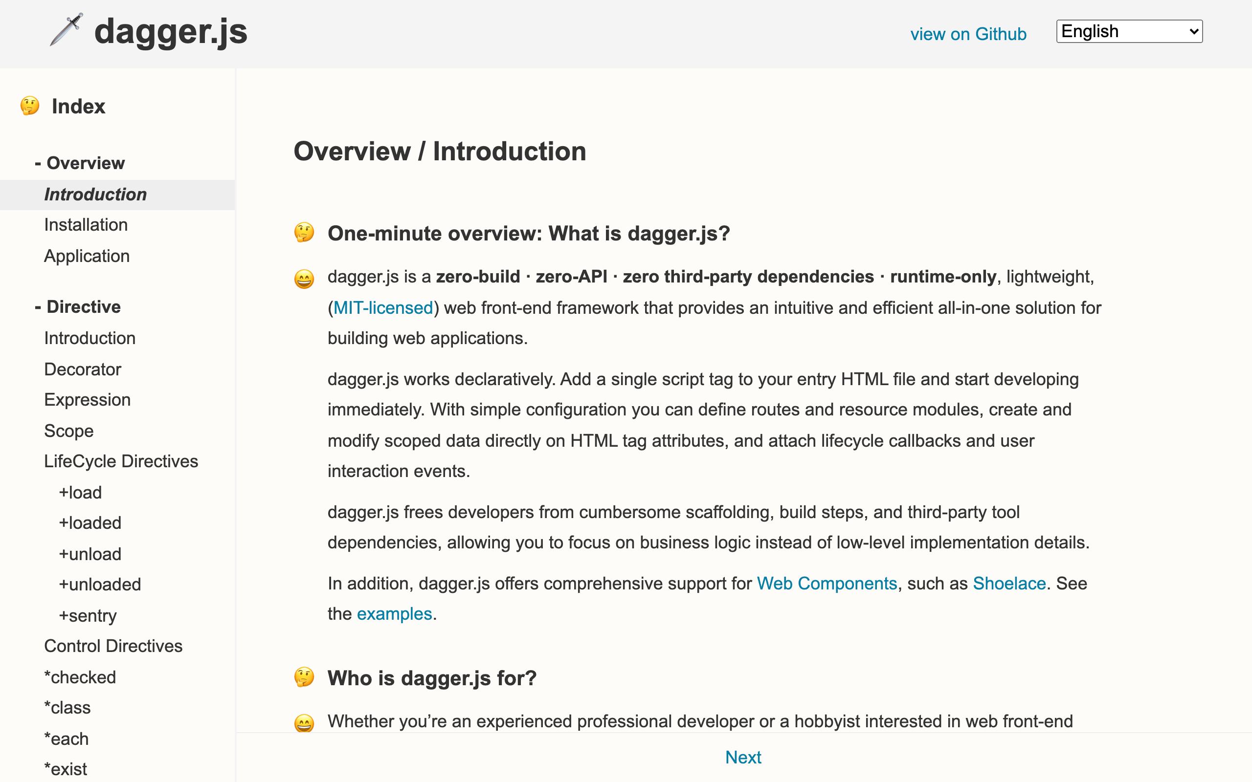 TL;DR: dagger.js is a buildless, runtime-only micro-framework that plays nicely with native Web Components. It uses HTML-first directives (e.g. +click, +load) so you can ship a page by dropping a single <script> from a CDN—no bundlers, no compile step. Why I built it Modern stacks are powerful