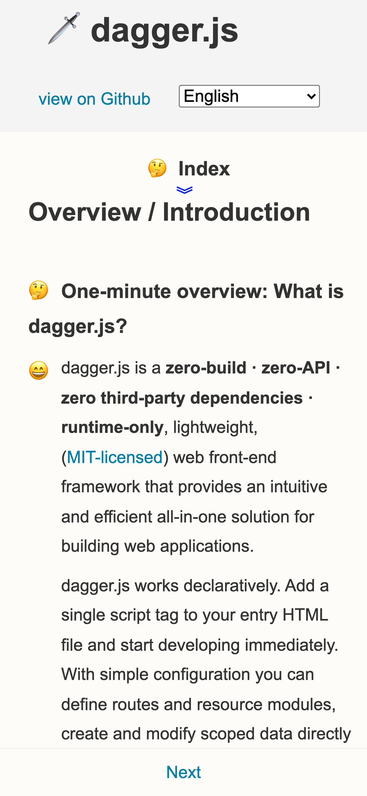 Dagger.js is a lightweight, runtime-only micro-framework designed for building web applications with native Web Components. It requires no build tools, bundlers, or compilation step—developers can add a single script tag from a CDN and begin working immediately. The framework uses HTML-first directives (such as +click and +load) to enable interactive functionality directly within markup, allowing developers to write declarative UI without JSX, DSLs, or complex abstractions. It operates purely at runtime with no virtual DOM, keeping applications lightweight and performant. Dagger.js is built for developers who prefer working with plain HTML and native JavaScript while maintaining clean, simple code. It eliminates common friction points in modern web development by removing the need for build configuration, bundling processes, and learning curve-heavy abstractions. The framework is open source and available on GitHub, making it suitable for projects ranging from simple interactive pages to more substantial applications where developers want to avoid tooling complexity. It appeals to those seeking a straightforward alternative to heavier frontend frameworks, while still providing structure and interactivity through its directive-based system.