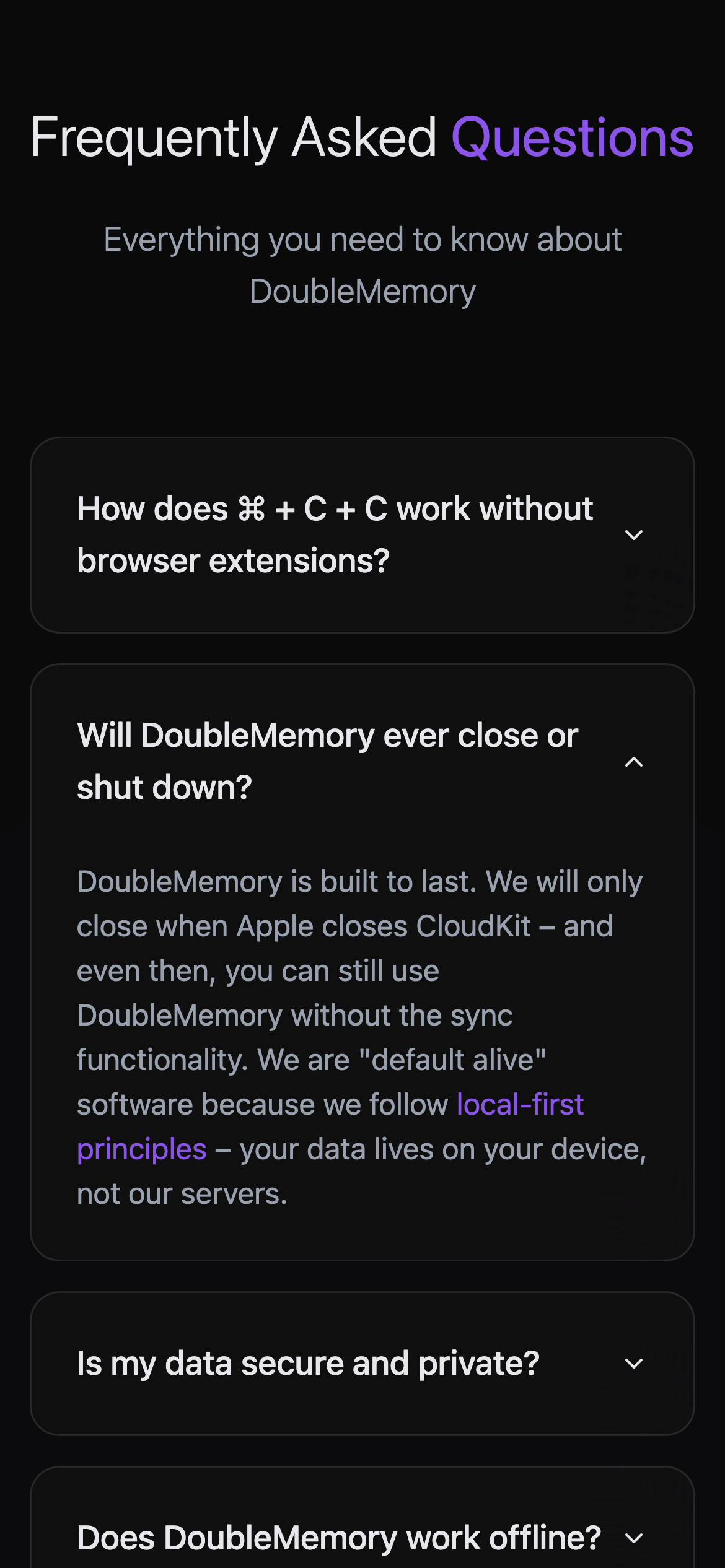 DoubleMemory started as an experiment to see if I can somehow automatically save all double cmd + c, as I often do instinctively, so I don't need extensions to save links and text into an app, and avoiding flooding the capture history as regular clipboard managers does. My motivation was not to