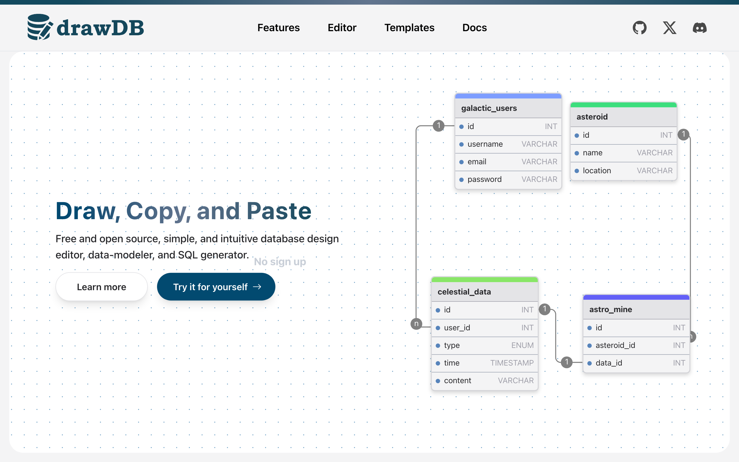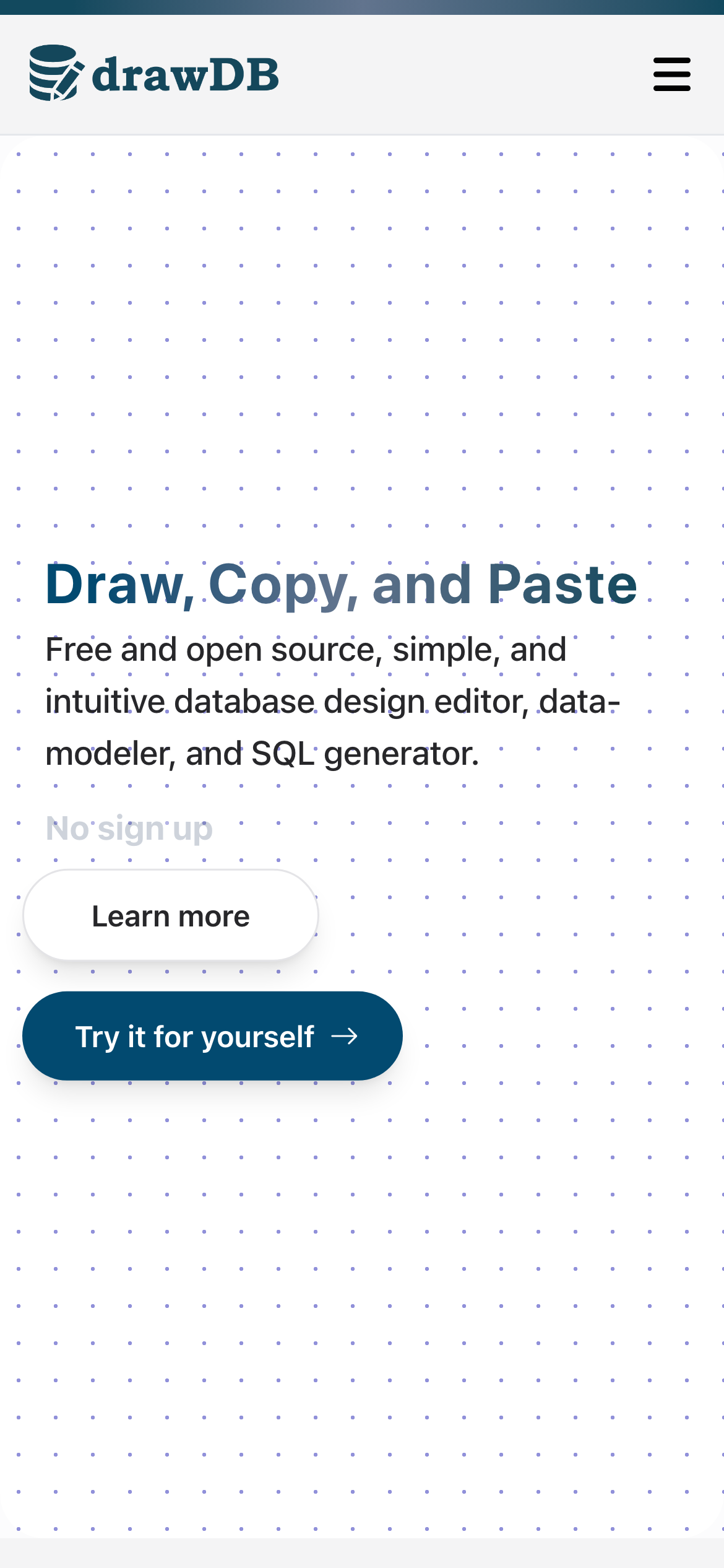 DrawDB is an open-source, web-based database design tool that enables users to create entity-relationship diagrams, model data structures, and generate SQL scripts. The platform allows designers, developers, and database administrators to visualize database schemas and export working SQL code without requiring an account or payment. The tool functions as an online alternative to traditional database modeling software, offering a straightforward interface for designing relational databases. Users can create tables, define relationships, set constraints, and generate corresponding SQL statements for various database systems. The application supports exporting diagrams and scripts, making it practical for documentation and implementation workflows. DrawDB serves developers and database professionals who need accessible schema design capabilities without licensing costs or software installation. It is particularly useful for those in educational settings, small teams, or individuals exploring database design concepts. The project originated as an open-source initiative shared by its creator during their job search as a college student. Since its release, the community-driven project has remained freely available, with no premium tier or account requirement to access core functionality. The combination of accessibility, ease of use, and export capabilities positions DrawDB as a practical tool for database planning and visualization tasks.