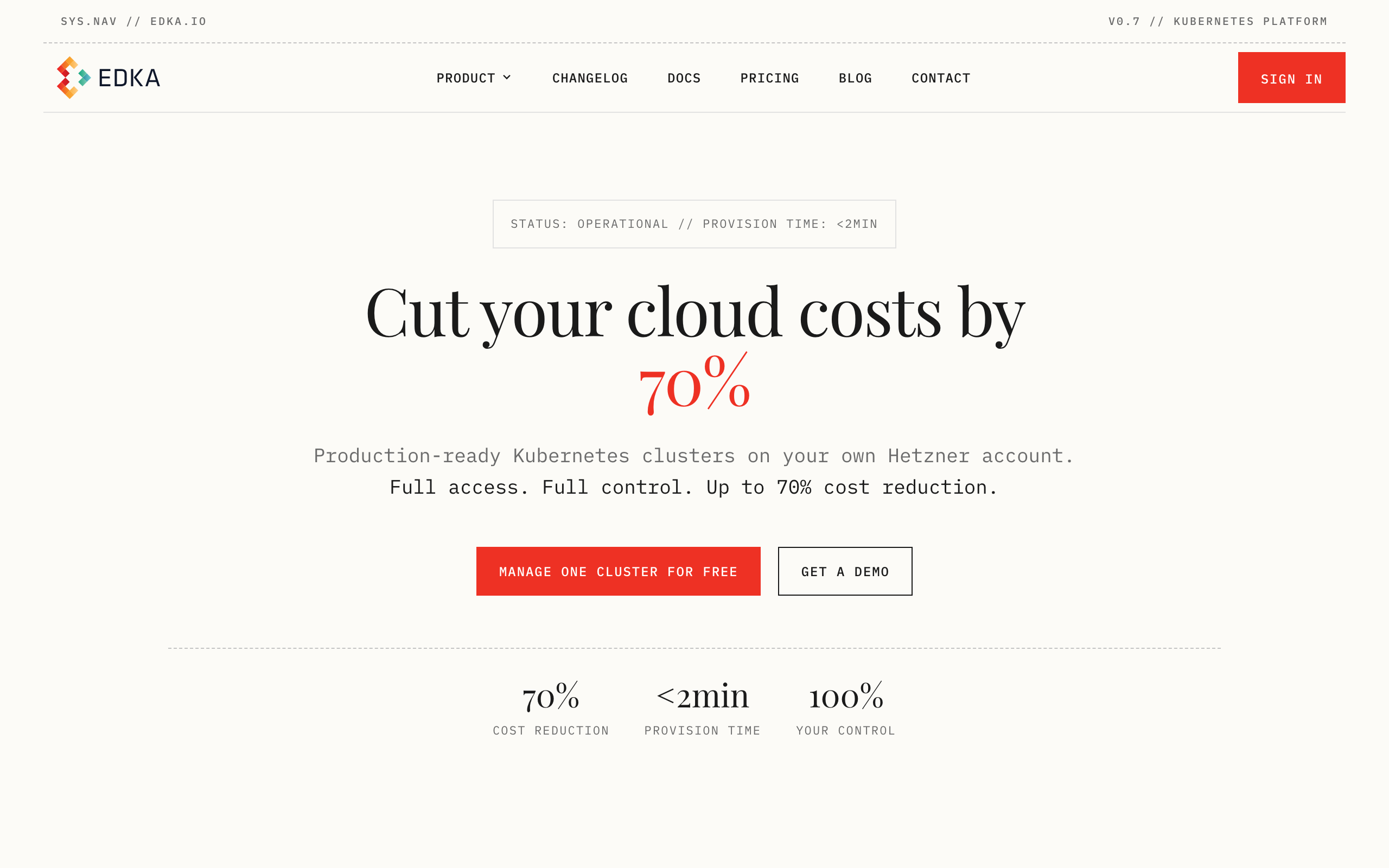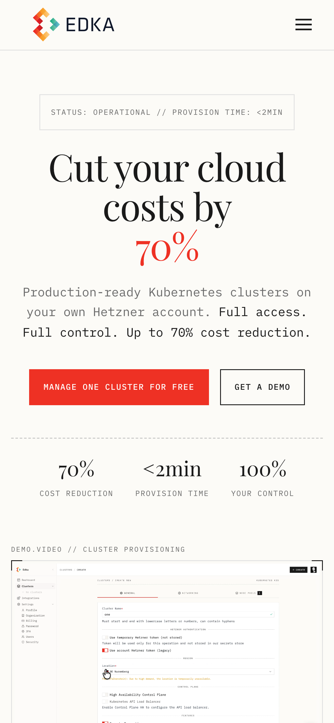 Edka is an open-source Kubernetes management platform designed to simplify cloud operations and accelerate application delivery. Built by a developer with over a decade of Kubernetes experience, including contributions to early Kubernetes projects and AWS EKS development, Edka enables teams to run and manage Kubernetes clusters efficiently on cost-effective infrastructure. The platform is particularly suited for small businesses and development teams seeking to reduce cloud spending without sacrificing reliability. Edka leverages Hetzner Cloud as its underlying infrastructure, which the creator has validated as a stable foundation for production Kubernetes workloads. The tool abstracts away much of the operational complexity associated with self-managed Kubernetes, making it accessible to teams with varying levels of DevOps expertise. As an open-source project, Edka provides transparency and allows community contribution while eliminating licensing costs. It addresses a specific gap in the Kubernetes ecosystem: affordable, managed Kubernetes operations for organizations that need more control than fully managed services provide but want to avoid the operational burden and expense of traditional approaches. Edka is ideal for teams running applications on Kubernetes who want to optimize infrastructure costs while maintaining production-grade reliability and operational simplicity.