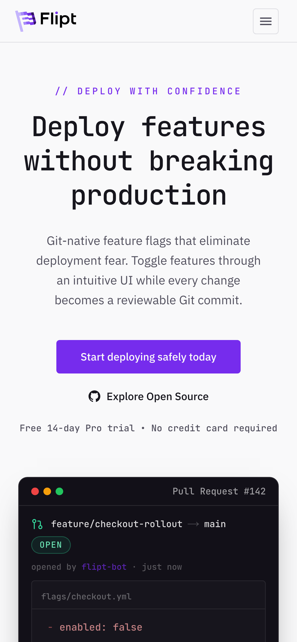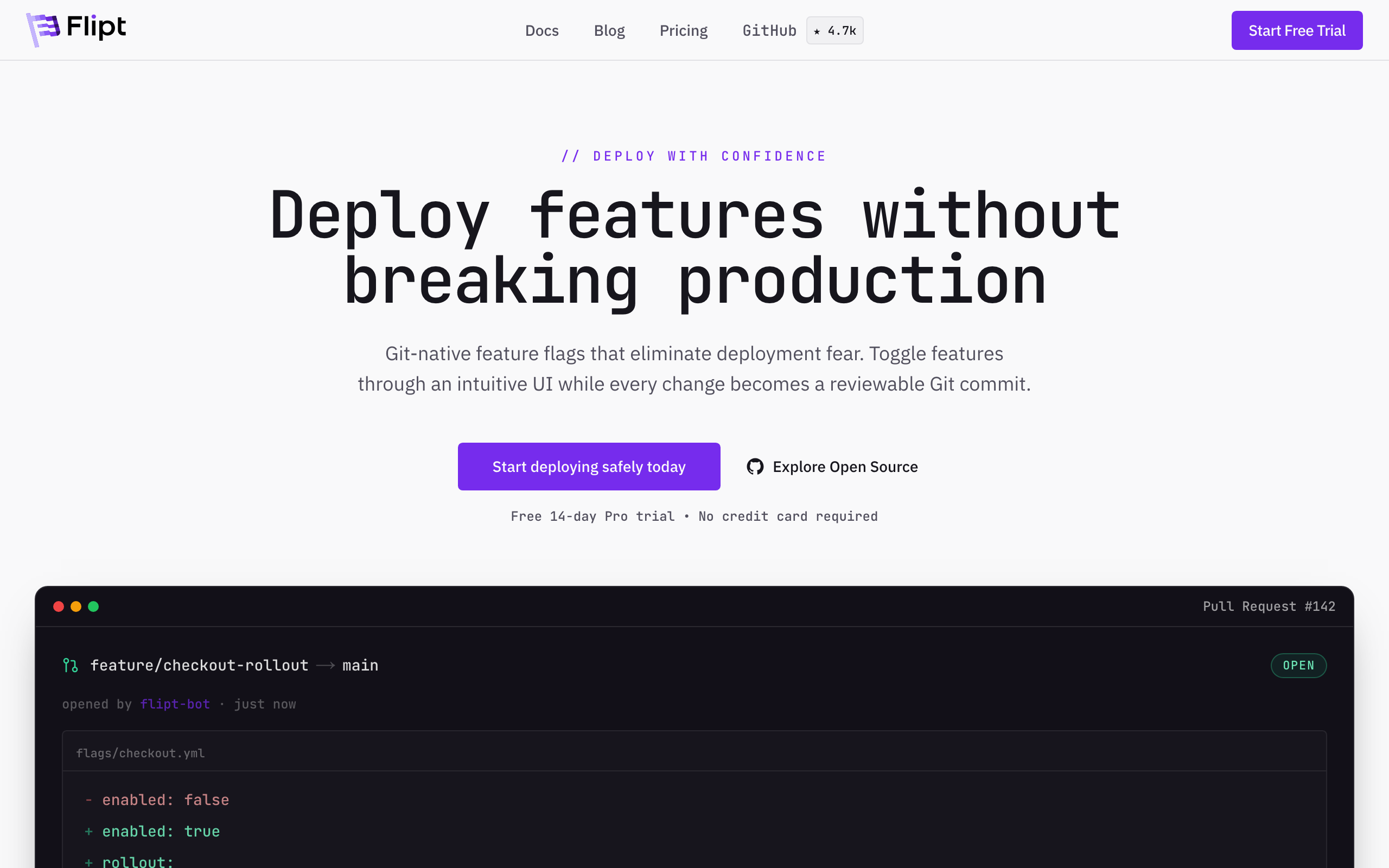 Flipt is an open-source feature flag solution designed to help development teams safely manage feature deployments without breaking production. It provides an alternative to commercial solutions like LaunchDarkly, offering core feature flagging capabilities at no cost. The platform enables teams to toggle features on and off through an intuitive user interface while maintaining full control over changes through Git integration. Every feature flag modification is automatically synced to Git, creating reviewable commits that maintain an audit trail of all deployment decisions. This Git-native approach combines the safety of version control with the convenience of a dedicated UI. Flipt supports multiple data backends, allowing teams to choose their preferred storage solution rather than being locked into a single database option. The solution is built for developers and deployment teams who need to reduce risk during releases, manage gradual feature rollouts, and maintain code review practices around infrastructure changes. The product targets engineering teams of various sizes looking for a self-hosted or open-source alternative to proprietary feature flag services. By eliminating the need for complex setup processes, Flipt allows teams to implement feature flags without significant operational overhead, making safer deployments more accessible to organizations with limited budgets or specific data sovereignty requirements.