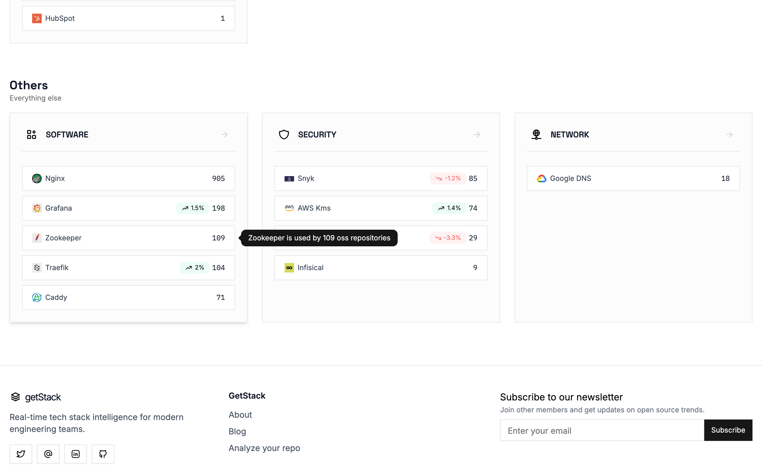 Hi HN! I’ve been working on getstack.dev[1], a tool to help developers track GitHub open-source trends, tech adoption, and repository stacks — updated weekly. About a month ago, I broke my leg. While stuck on the couch, I figured I’d put the downtime to good use and finally build a side project I’d