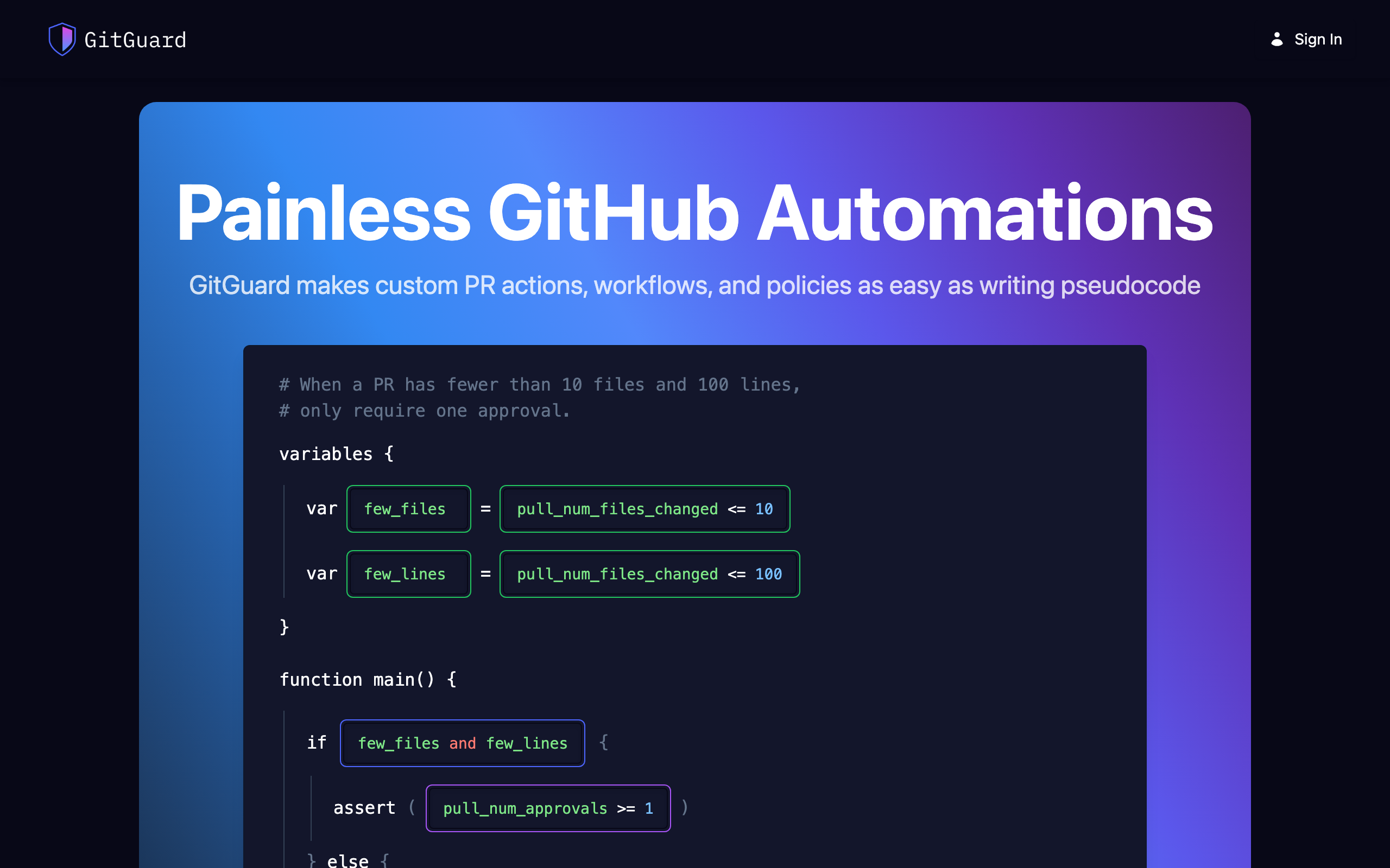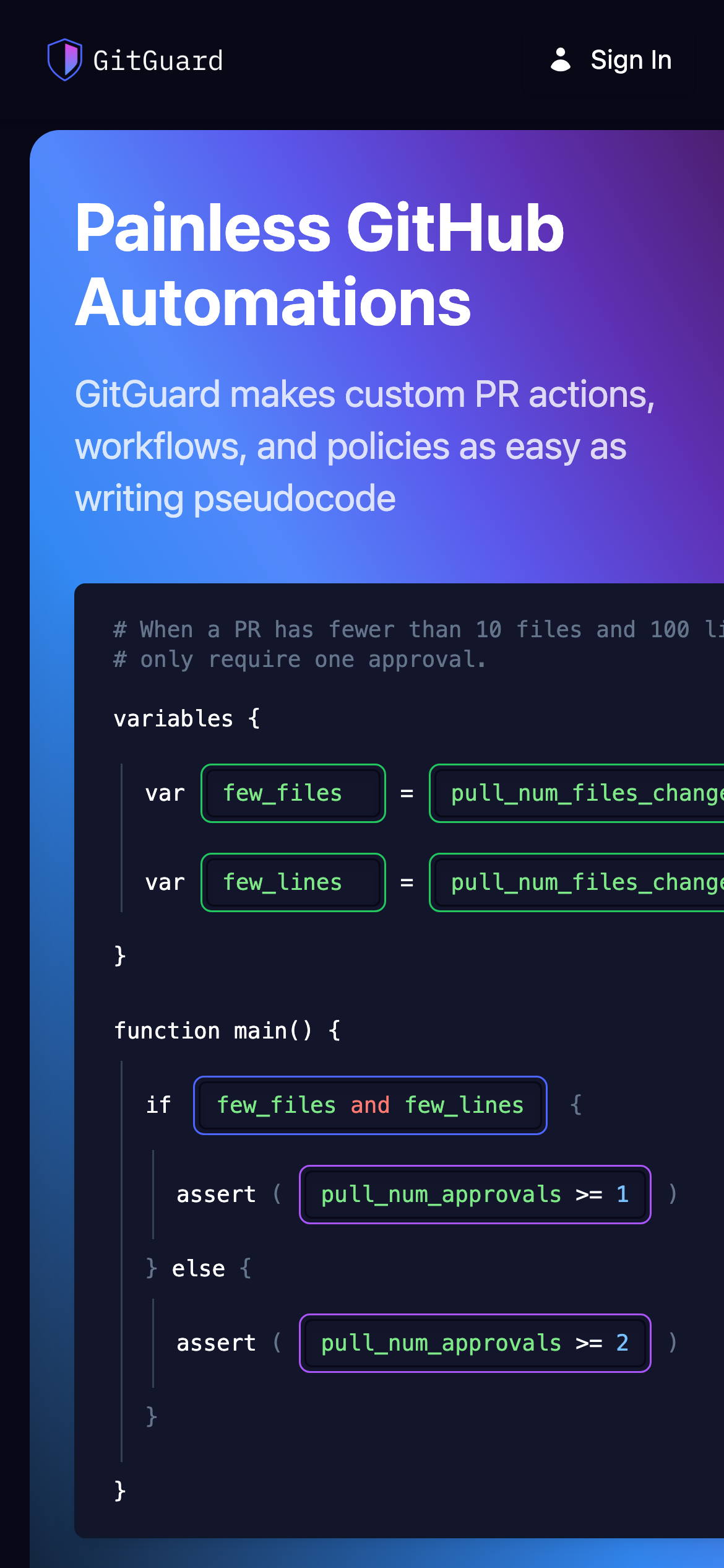GitGuard is an open-source DevOps tool that automates GitHub pull request governance through customizable policy enforcement. Rather than relying on manual branch protection rules and disparate scripts, GitGuard centralizes policy management in a single configuration system. The tool enables teams to define conditional review requirements based on specific criteria. Common use cases include requiring reviews from designated teams when certain files are modified, enforcing additional checks when database migrations are present, and ensuring code changes meet organizational standards before merging. GitGuard addresses a common challenge faced by development teams: the need to maintain consistent code quality and compliance without building bespoke solutions. By providing a structured framework for policy definition, it reduces the complexity of managing multiple custom scripts and GitHub's native branch protections. The product is designed for engineering teams and organizations that want to codify their review processes and enforce best practices consistently across repositories. It integrates directly with GitHub's workflow, making it accessible to teams already using GitHub for version control. As an open-source project, GitGuard allows teams to self-host the solution, customize it to their specific needs, and avoid vendor lock-in. This approach makes it particularly suitable for organizations with specific compliance requirements or those seeking transparency in their DevOps toolchain.