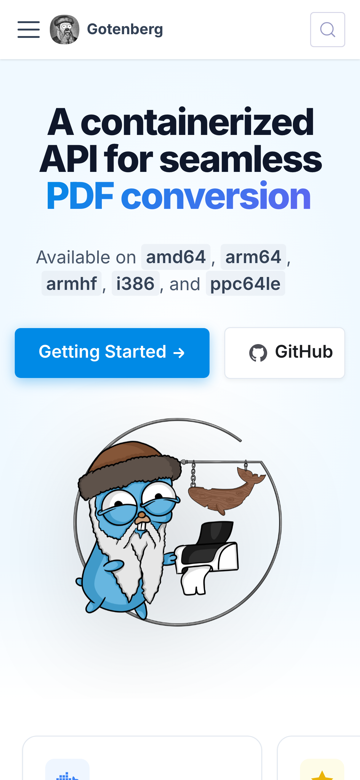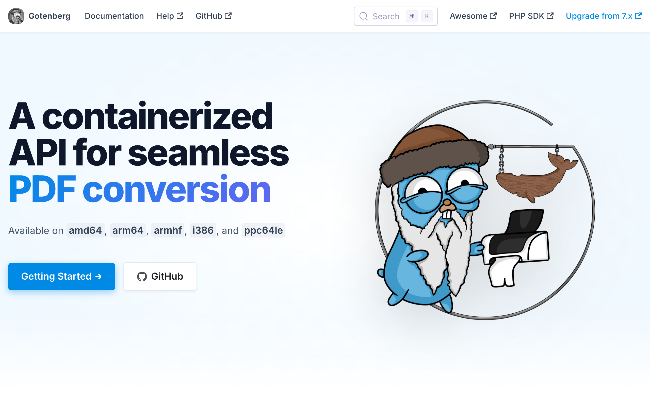 Gotenberg is an open-source, containerized API that enables developers to convert documents into PDF files programmatically. It integrates with powerful tools like Chromium and LibreOffice to support conversion from multiple formats including HTML, Markdown, Word, Excel, and others. The API is designed to be developer-friendly, allowing teams to embed PDF conversion functionality directly into their applications without managing complex dependencies. Available as a Docker container, Gotenberg runs on multiple architectures including amd64, arm64, armhf, i386, and ppc64le, making it suitable for diverse deployment environments. The project is maintained as open-source software, providing transparency and flexibility for organizations that want to self-host their document conversion infrastructure. Gotenberg is particularly useful for applications requiring batch document processing, automated report generation, or on-demand PDF creation from web content. By containerizing the conversion process, it simplifies deployment and scaling compared to managing Chromium and LibreOffice installations directly. The straightforward API design makes integration straightforward for developers working with various tech stacks.