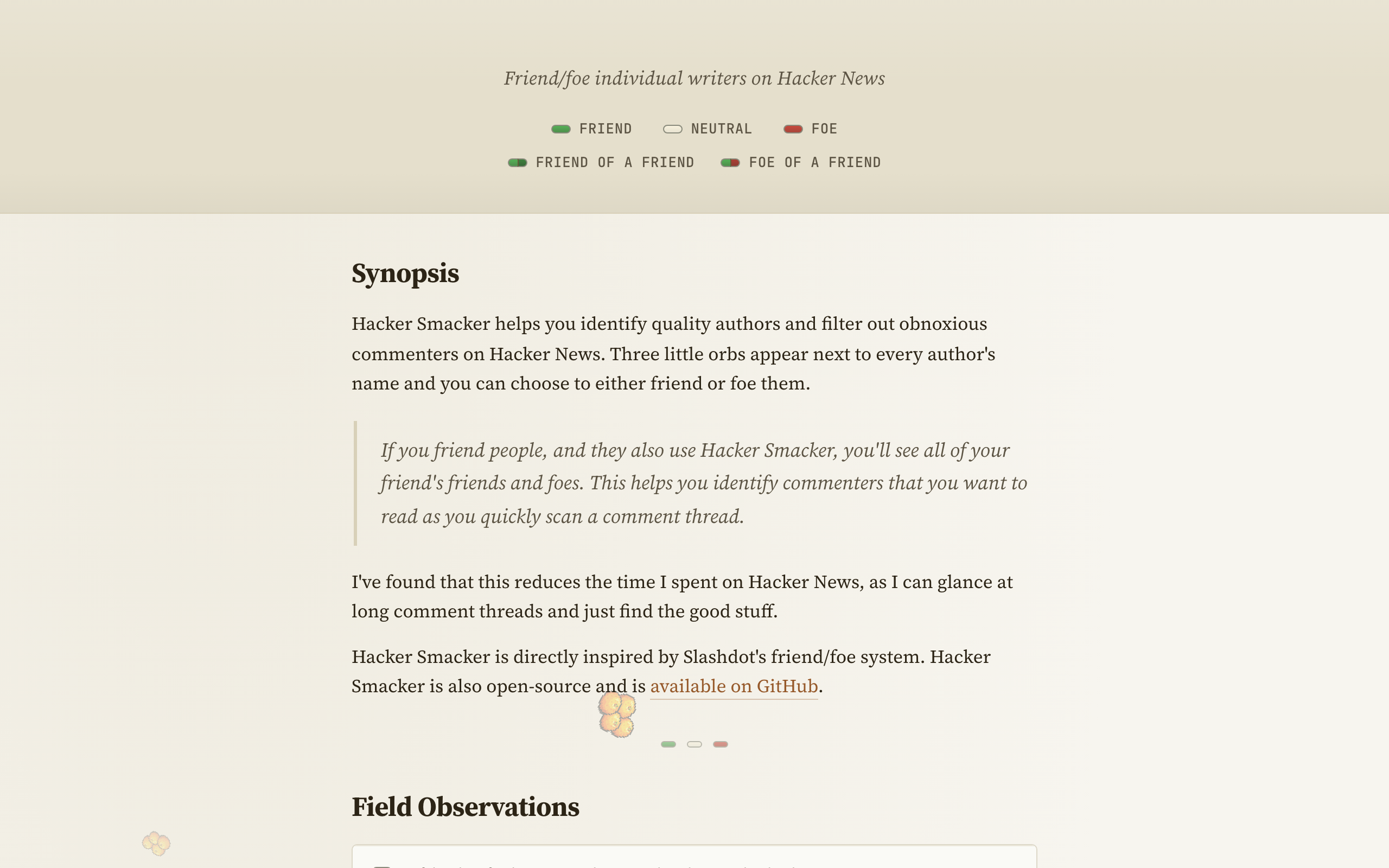 Hacker Smacker is a browser extension that adds friend and foe functionality to Hacker News. The tool displays three interactive orbs next to each commenter's name, allowing users to mark authors as friends or foes based on comment quality and engagement style. When marked, these designations persist across future Hacker News threads, making it easier to identify and locate preferred commenters while filtering out unwanted contributors. The extension is designed for Hacker News readers who want to streamline their browsing experience by quickly spotting quality discussions and authors worth following. Rather than reading through entire comment threads, users can glance at the friend/foe indicators to prioritize which comments to read. The tool is inspired by Slashdot's established friend/foe system and brings similar community-focused filtering to Hacker News. Hacker Smacker is open-source software, available on GitHub for review and contribution. The project requires no subscription or payment, making it freely accessible to all Hacker News users. The extension helps reduce time spent browsing by surfacing meaningful conversations and commentary from trusted community members.