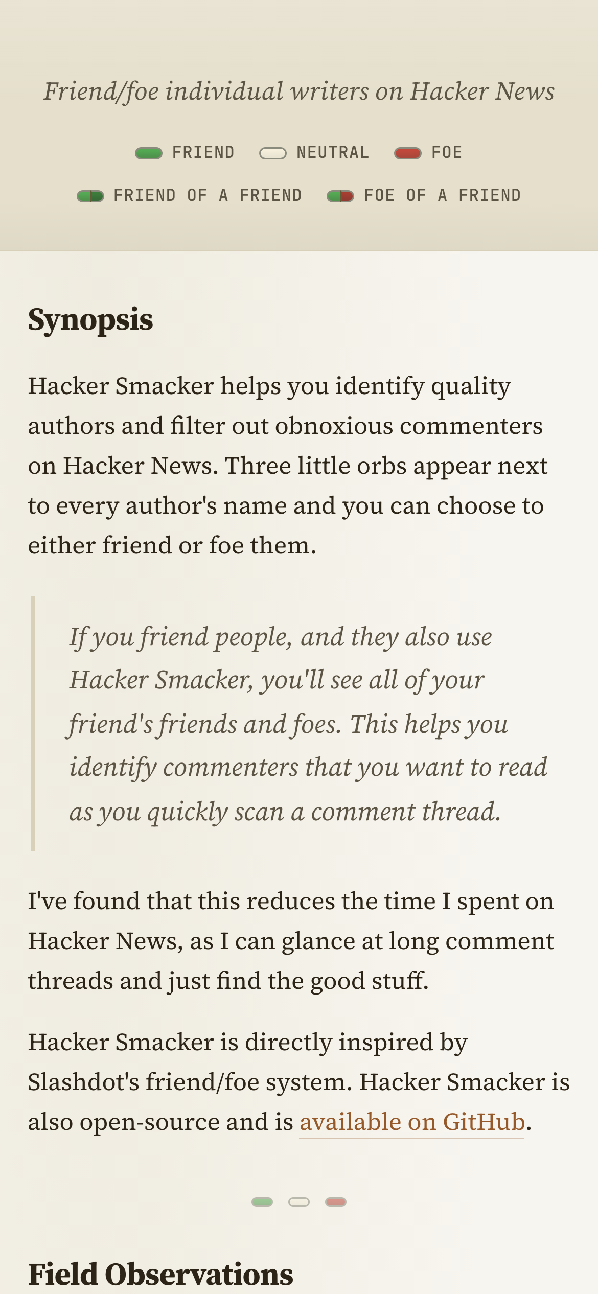 - Inspired by Slashdot's proven friend/foe system adapted for Hacker News