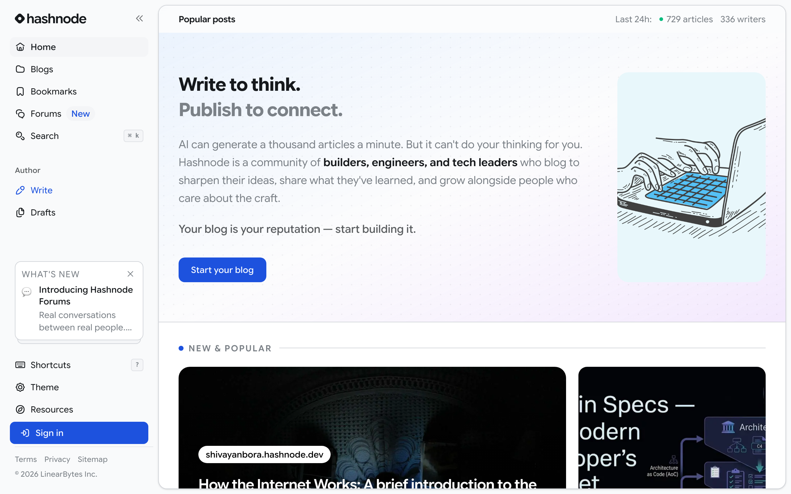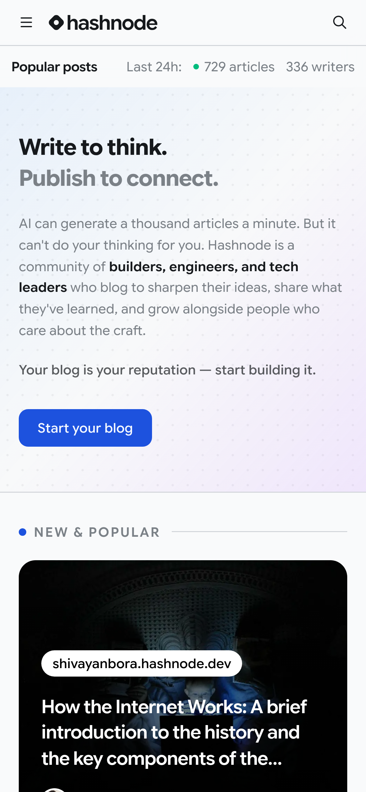 Hashnode is a blogging platform where developers, engineers, and tech leaders write to sharpen ideas, share knowledge, and build their reputation. Start for free.