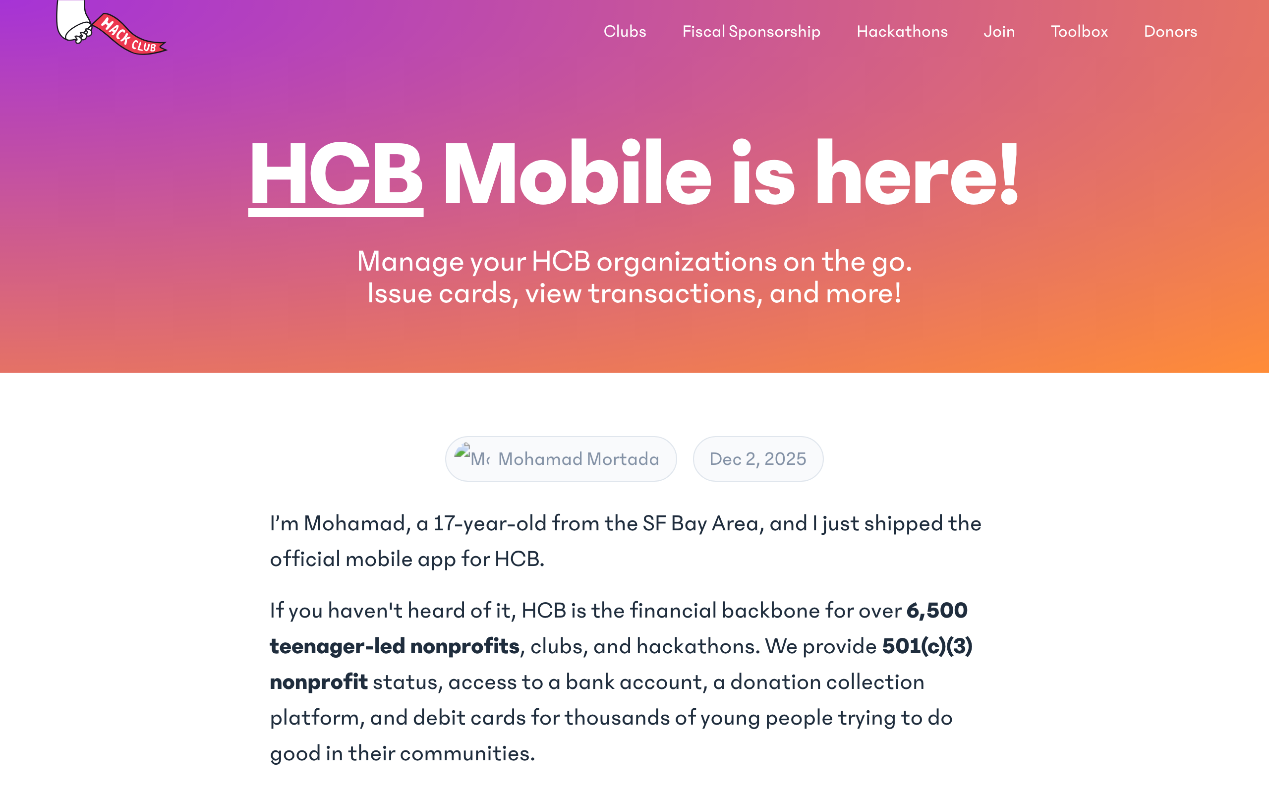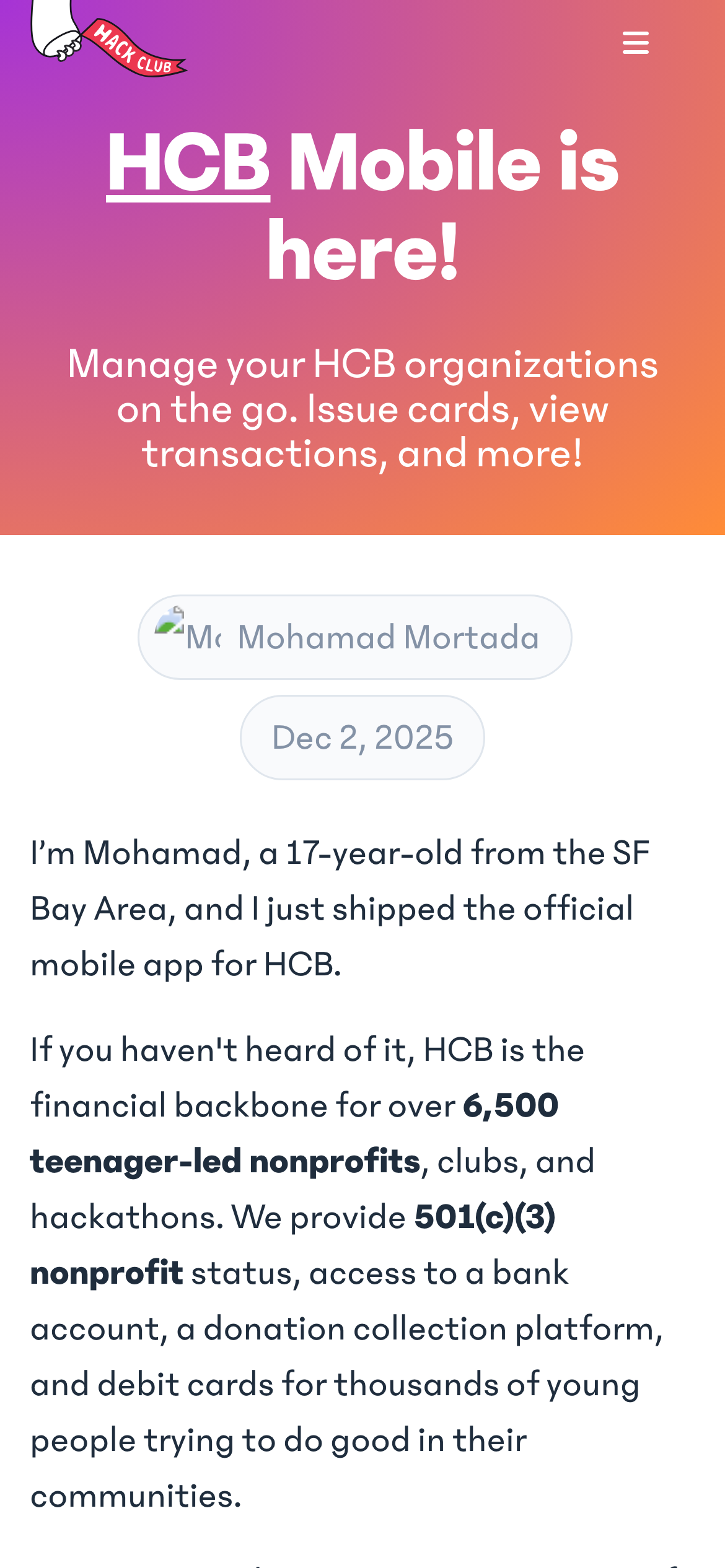 HCB Mobile is a React Native application built with Expo that enables nonprofit organizations to manage their finances on the go. Developed by Hack Club, the app serves the HCB (Hack Club Bank) platform, which processes $6 million monthly for over 6,500 nonprofit organizations worldwide. The app allows users to issue cards, view transactions, and manage their HCB organizations directly from their mobile devices. It provides essential banking functionality tailored for nonprofits that rely on HCB's fiscal sponsorship services. Built by a full-time student developer, HCB Mobile successfully navigated Apple and Google's app store approval processes—a notable achievement given the complexity of launching financial applications on mobile platforms. The application is open source, allowing community contributions and transparency in its development. The project demonstrates practical implementation of React Native for fintech applications serving a specific organizational need. Users can access core financial management features without requiring desktop access, improving accessibility for nonprofit teams managing multiple locations or working remotely. HCB Mobile is available on both iOS and Android platforms through their respective app stores, with the source code available on GitHub for developers interested in the technical implementation or contributing to the project.