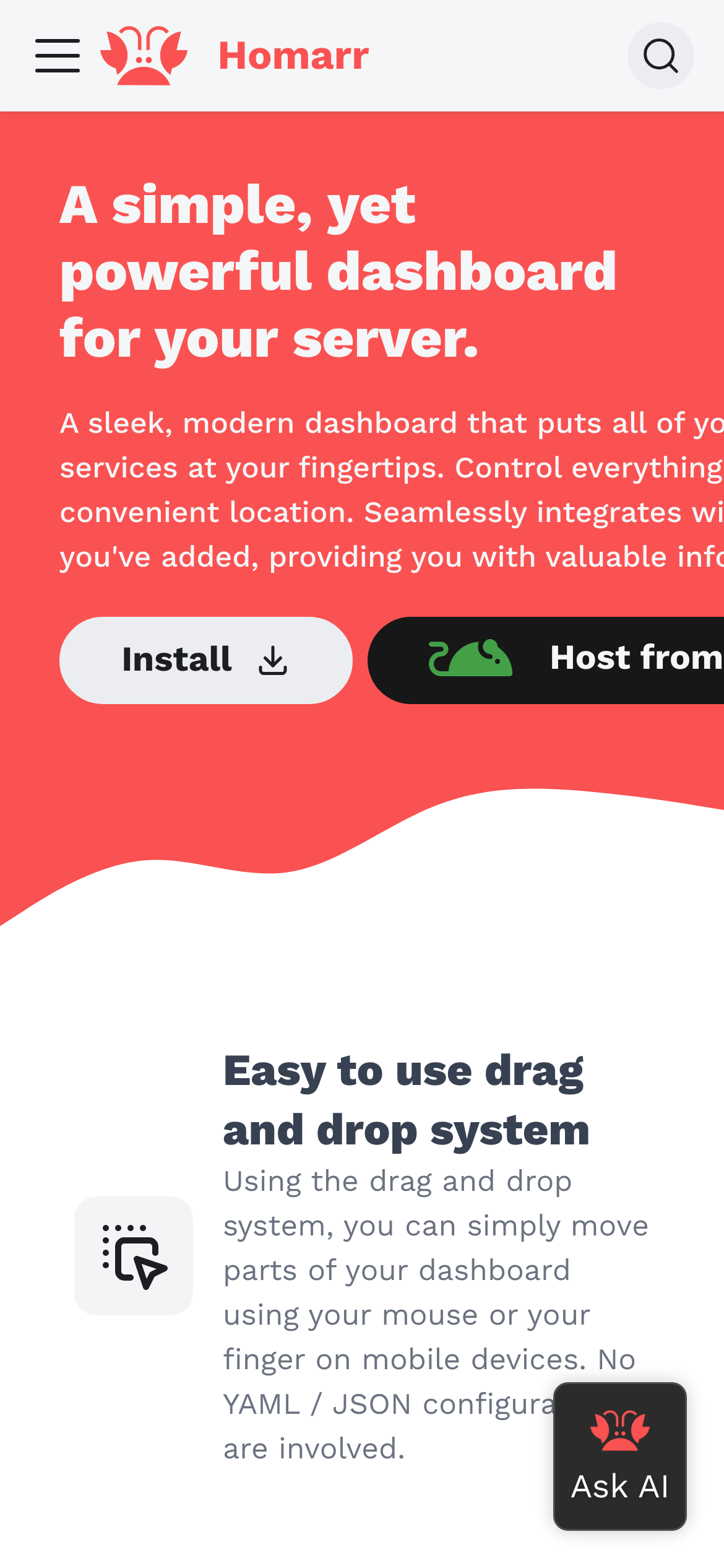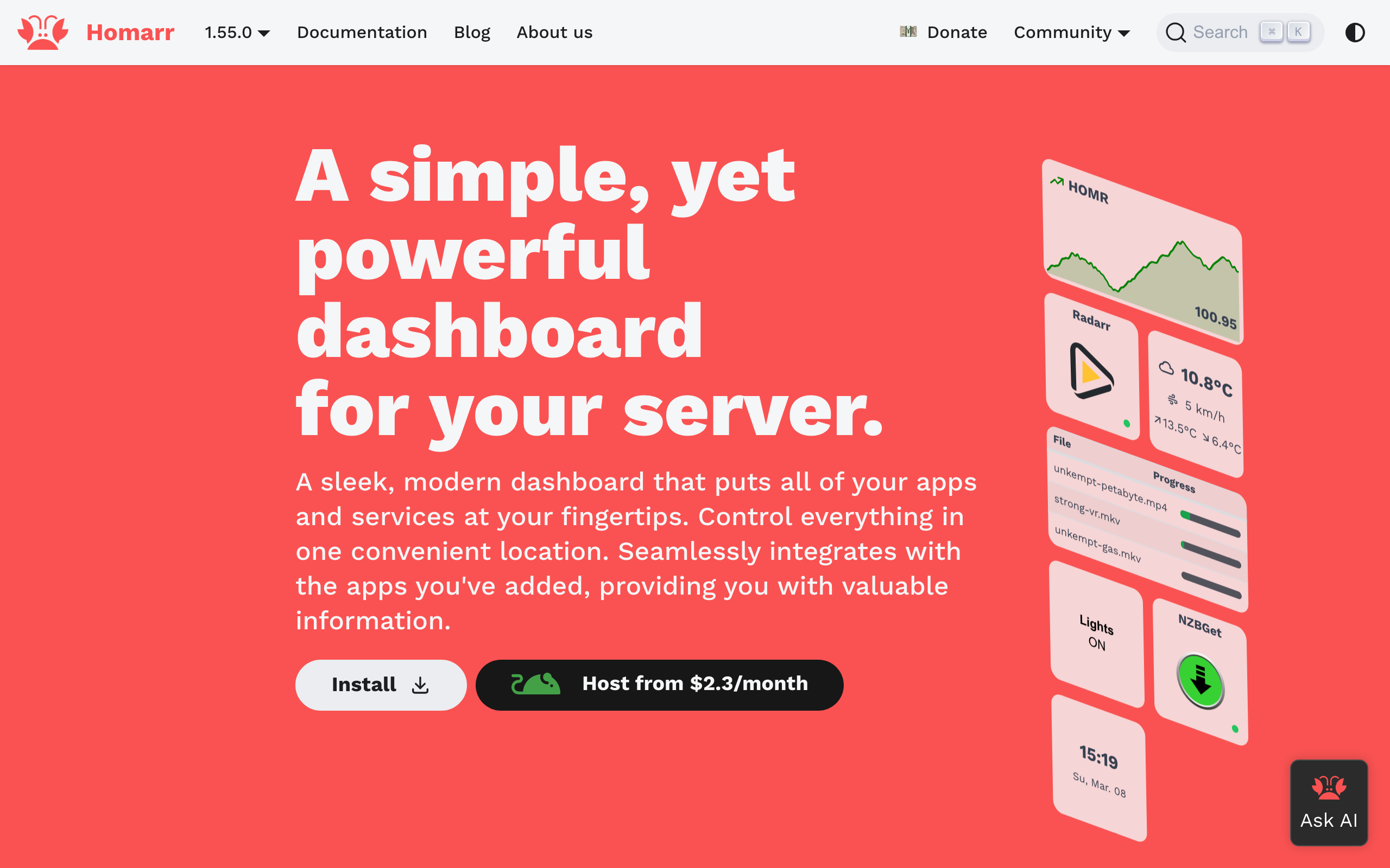 Homarr is an open-source dashboard application designed to centralize management of servers, applications, and services. The platform provides a single interface where users can access, monitor, and control multiple tools and services without navigating between different applications. Homarr features a modern, web-based design with extensive integration capabilities, allowing it to pull information from and interact with connected services directly from the dashboard. The application is primarily targeted at server administrators, home lab enthusiasts, and teams managing multiple applications and services. It supports various deployment methods, making it accessible across different infrastructure setups. Configuration is handled through a web interface, eliminating the need for complex manual setup or configuration files. Homarr's key strengths include its flexible integration architecture, modern user interface, and open-source availability. Being freely available on GitHub, users can deploy it without licensing costs and have access to the source code for customization. The dashboard consolidates information and controls from disparate services into one convenient location, reducing the time spent switching between applications and improving overall operational efficiency.