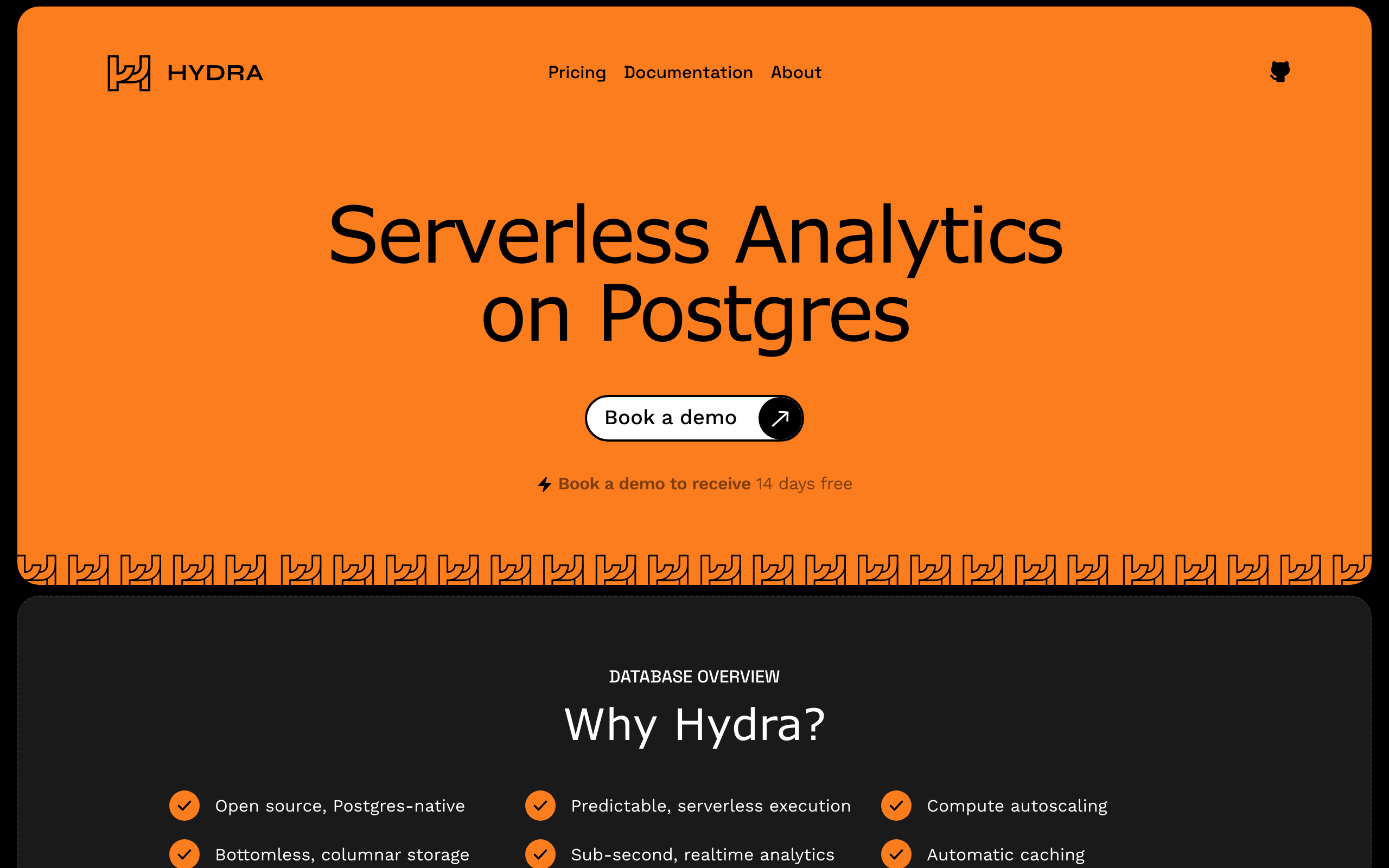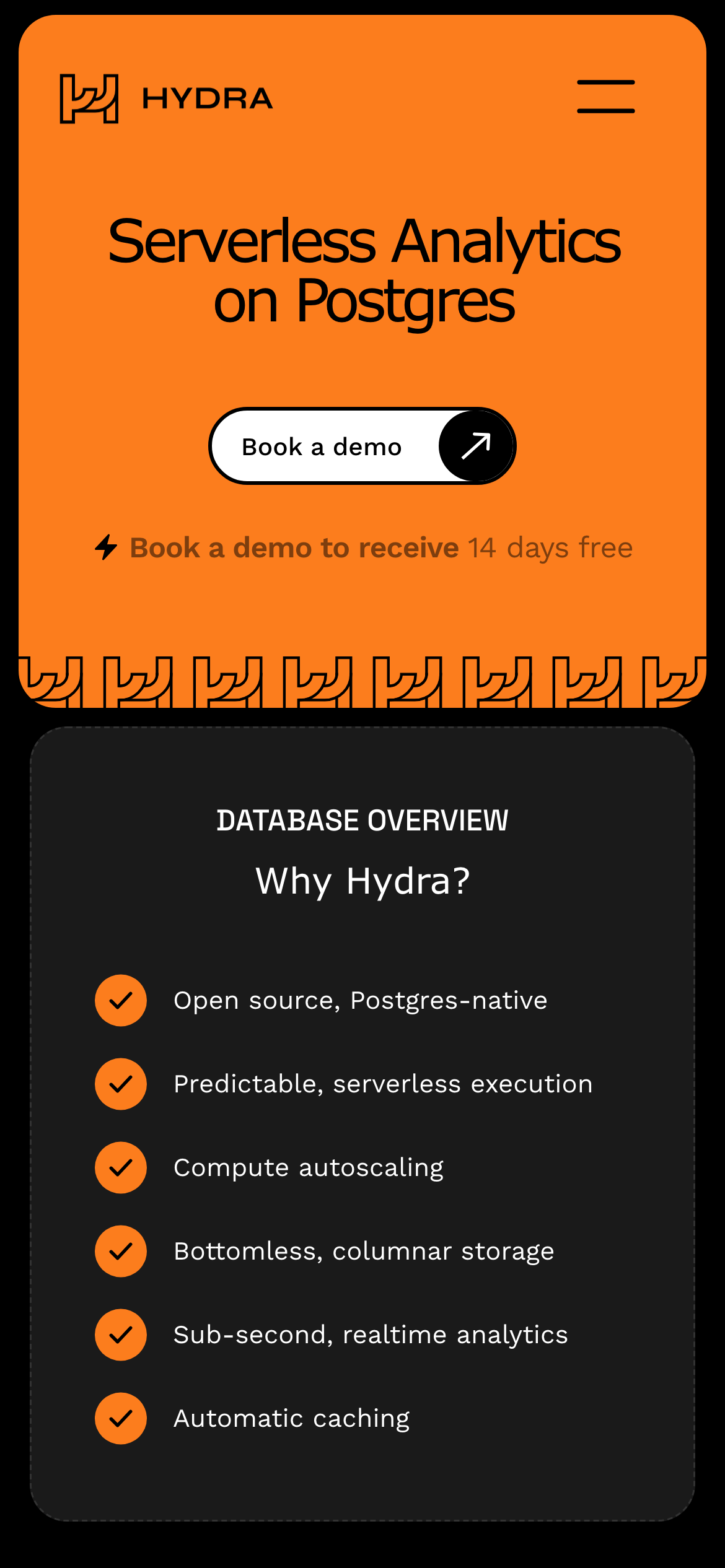 Hi HN, Hydra cofounders (Joe and JD) here ( https://www.hydra.so/ )! We enable realtime analytics on Postgres without requiring an external analytics database. Traditionally, this was unfeasible: Postgres is a rowstore database that’s 1000X slower at analytical processing than a colum