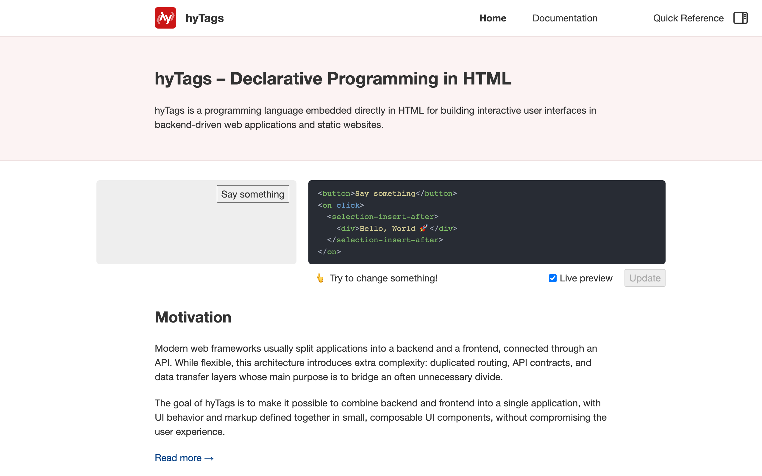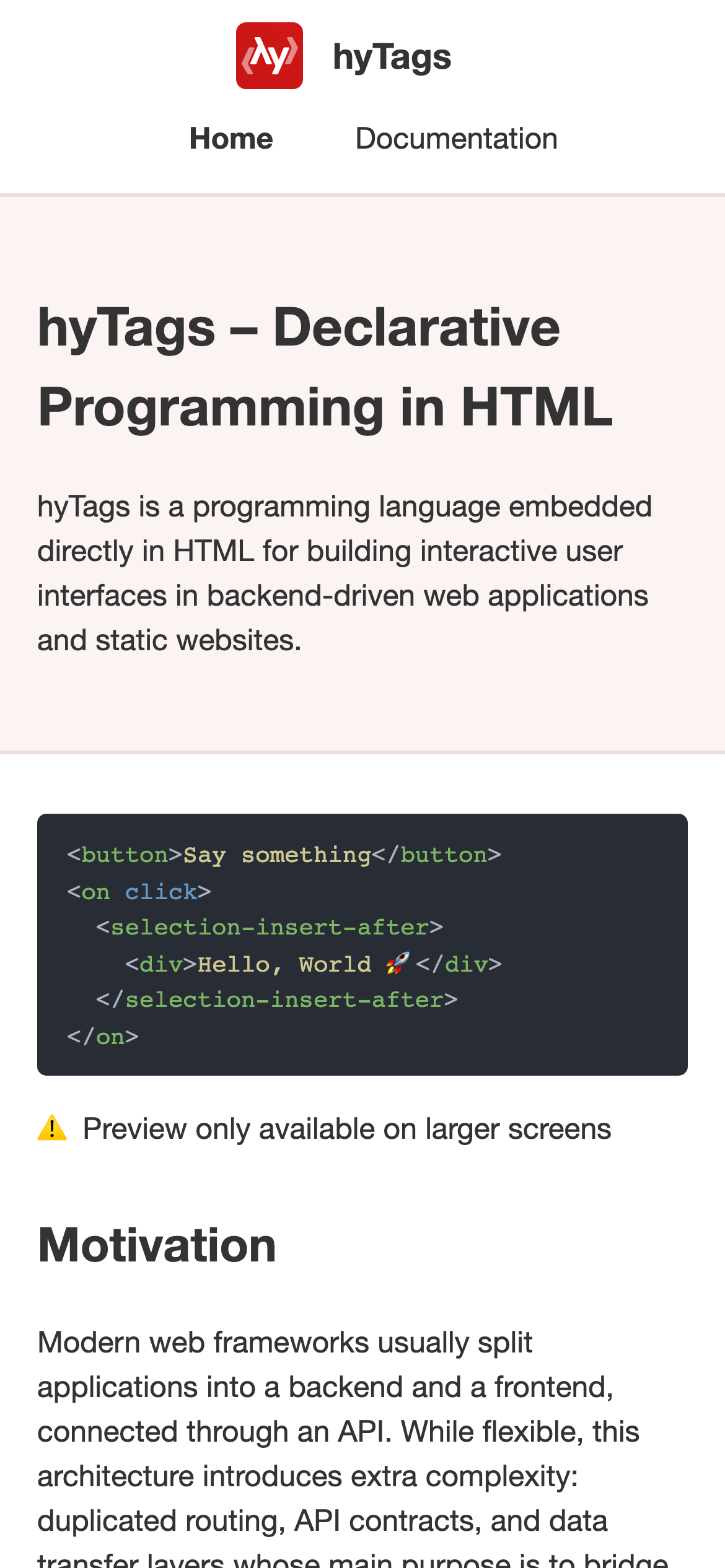 HyTags is an open-source programming language embedded in HTML designed for building interactive web user interfaces. It enables developers to create full-stack web applications by combining backend and frontend logic within a single codebase, eliminating the traditional separation between client and server-side development. The language supports core programming constructs including control flow, functions, and asynchronous handling—all expressed through HTML tags. This approach allows UI behavior and markup to be defined together in composable components, reducing architectural complexity typically introduced by separate frontend frameworks and backend services. HyTags addresses a specific development friction point: conventional web application architecture requires duplicated routing logic, explicit API contracts, and data transfer layers that primarily serve to bridge an unnecessary divide between backend and frontend. By consolidating these layers, HyTags streamlines the development process while maintaining user experience quality. The project originated as a way to write full-stack web applications in Swift without requiring a separate frontend implementation, though it has evolved into a standalone declarative language. It is distributed under the MIT license and can be integrated into projects via CDN, making it accessible for developers seeking to reduce architectural overhead in web development. The framework is particularly suited for developers building smaller to medium-sized applications who want to maintain a unified codebase without the complexity of managing separate API contracts and frontend-backend synchronization.
