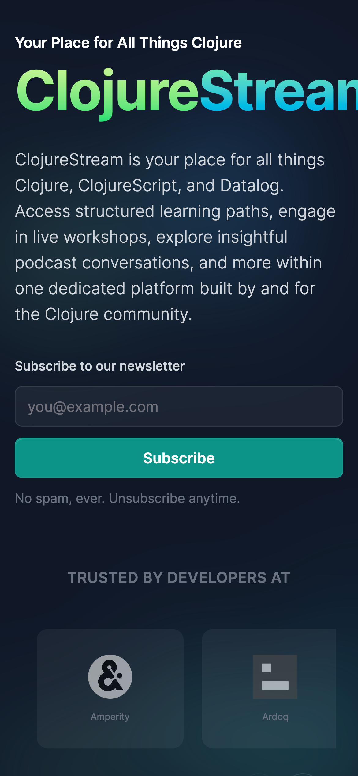 I built a self-hosted course platform in Clojure is a content management system designed specifically for teaching Clojure programming. The platform combines structured course content with interactive learning experiences, offering project-based courses that allow learners to build practical applications while mastering the language. The platform features live workshops that bring instructors and students together for real-time collaboration and Q&A sessions. It also incorporates community features that connect practitioners, enabling peer-to-peer learning and knowledge sharing among users. The system is self-hosted, meaning organizations and educators can deploy and manage it on their own infrastructure rather than relying on third-party platforms. This approach appeals to Clojure practitioners who want control over their learning environment and data. The platform targets developers interested in learning Clojure, from beginners seeking structured introduction to the language to experienced programmers looking to deepen their expertise. It also serves instructors and organizations that want to provide Clojure training within a customizable, self-controlled environment. Key differentiators include its focus on project-based learning rather than purely theoretical instruction, the integration of live interactive workshops, and the emphasis on building an active community around Clojure education. The self-hosted nature distinguishes it from cloud-based course platforms.