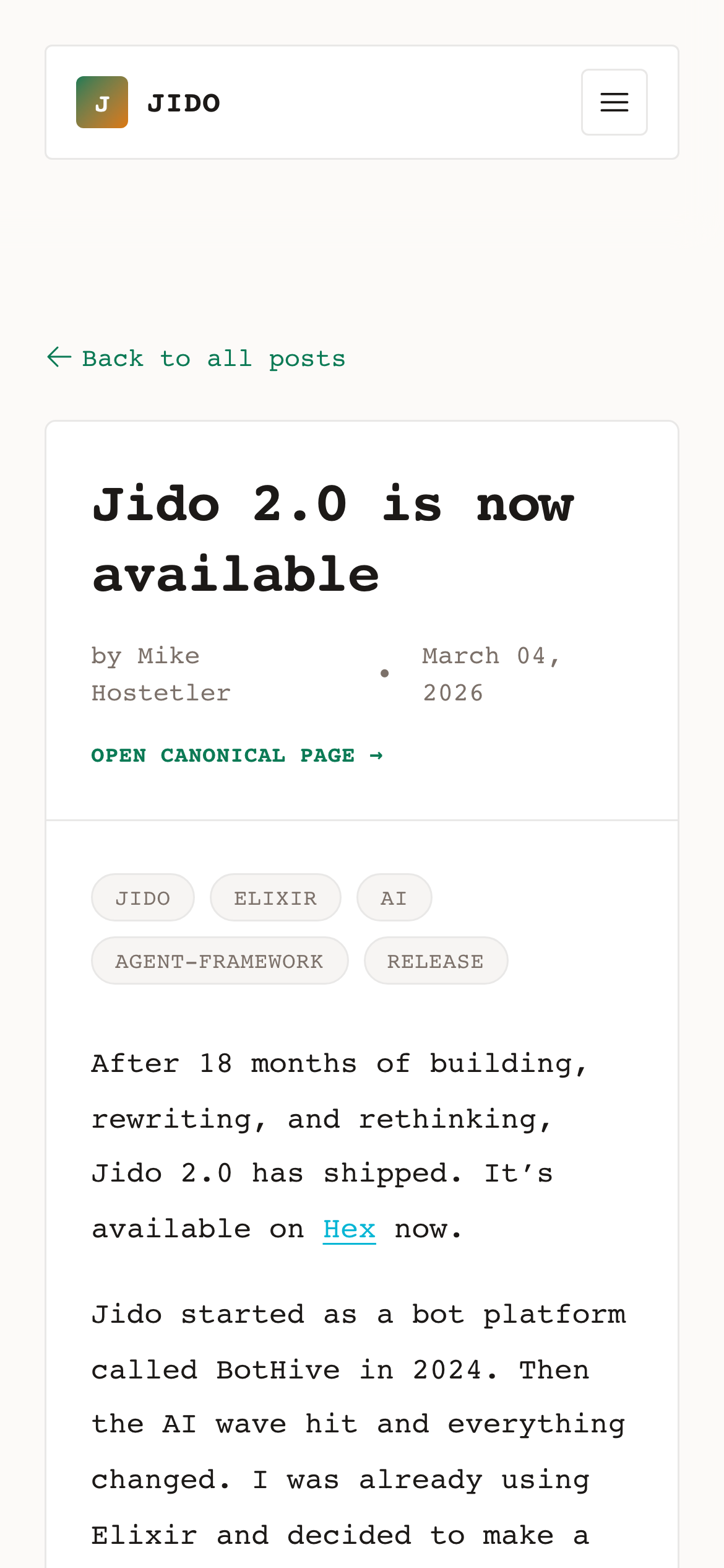 Hi HN! I'm the author of an Elixir Agent Framework called Jido. We reached our 2.0 release this week, shipping a production-hardened framework to build, manage and run Agents on the BEAM. Jido now supports a host of Agentic features, including: - Tool Calling and Agent Skills - Comprehensive mu