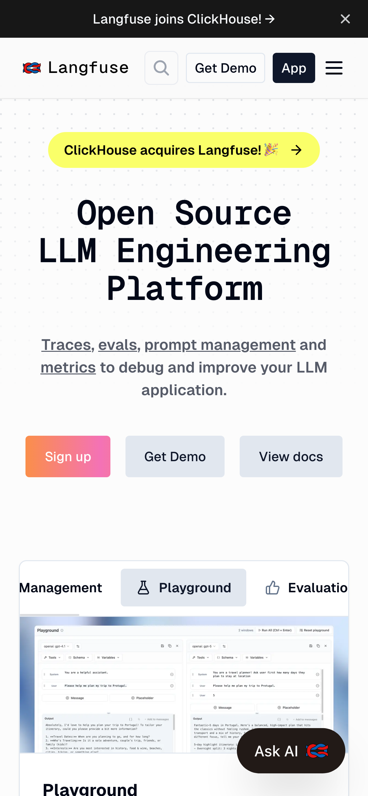 Langfuse is an open-source observability and analytics platform designed for large language model (LLM) applications. It provides developers with tools to trace execution, run evaluations, manage prompts, and track performance metrics across LLM-powered systems. The platform integrates with popular frameworks and libraries including LangChain, OpenAI, LlamaIndex, and LiteLLM, making it accessible to teams using various LLM stacks. Langfuse enables users to debug application behavior, understand model performance, and identify issues in production environments. Core features include distributed tracing capabilities for tracking requests through complex LLM pipelines, evaluation frameworks for assessing output quality, centralized prompt management for version control and deployment, and comprehensive metrics collection for monitoring application health. Langfuse serves developers and teams building LLM applications who need visibility into their systems' behavior and performance. The open-source model allows organizations to self-host the platform, while a cloud version is available for those preferring managed infrastructure. The project emphasizes transparency and community-driven development, with its codebase available on GitHub. This approach appeals to teams seeking observability solutions they can audit, customize, and extend to meet specific requirements.