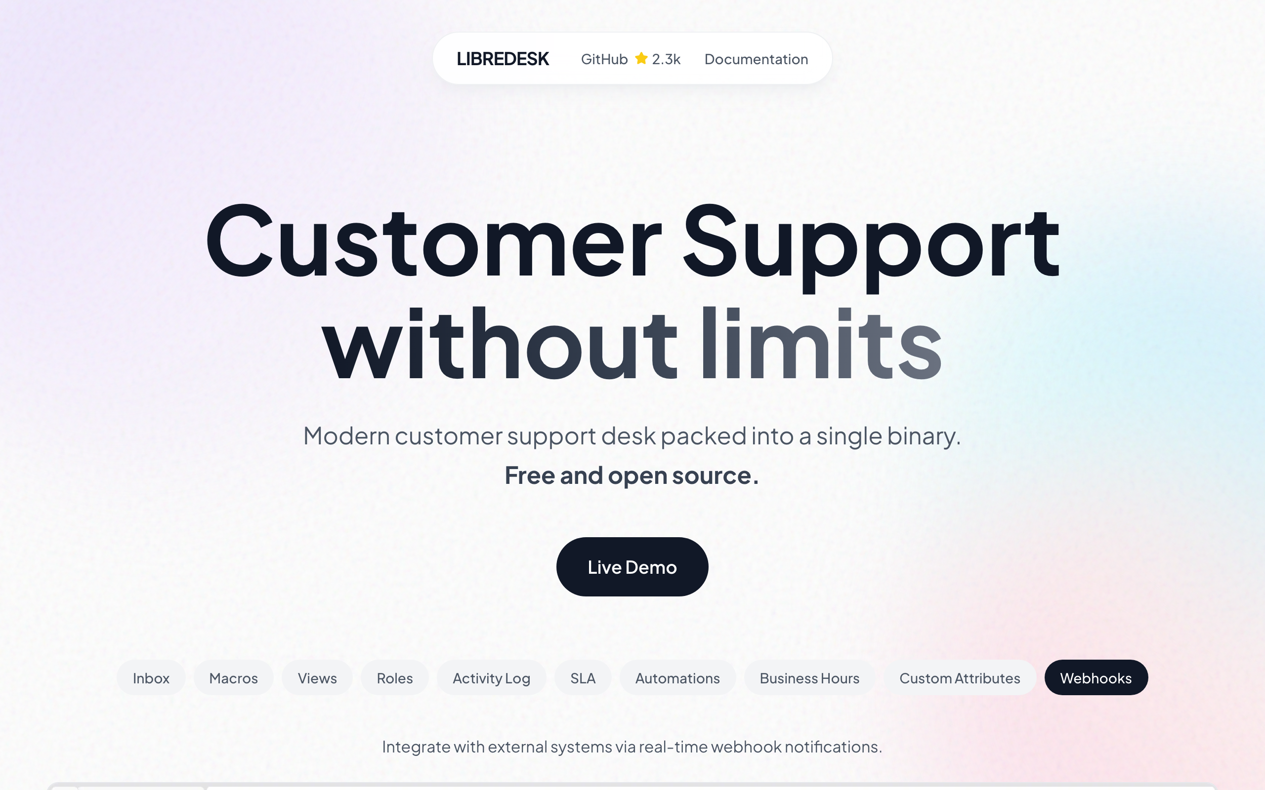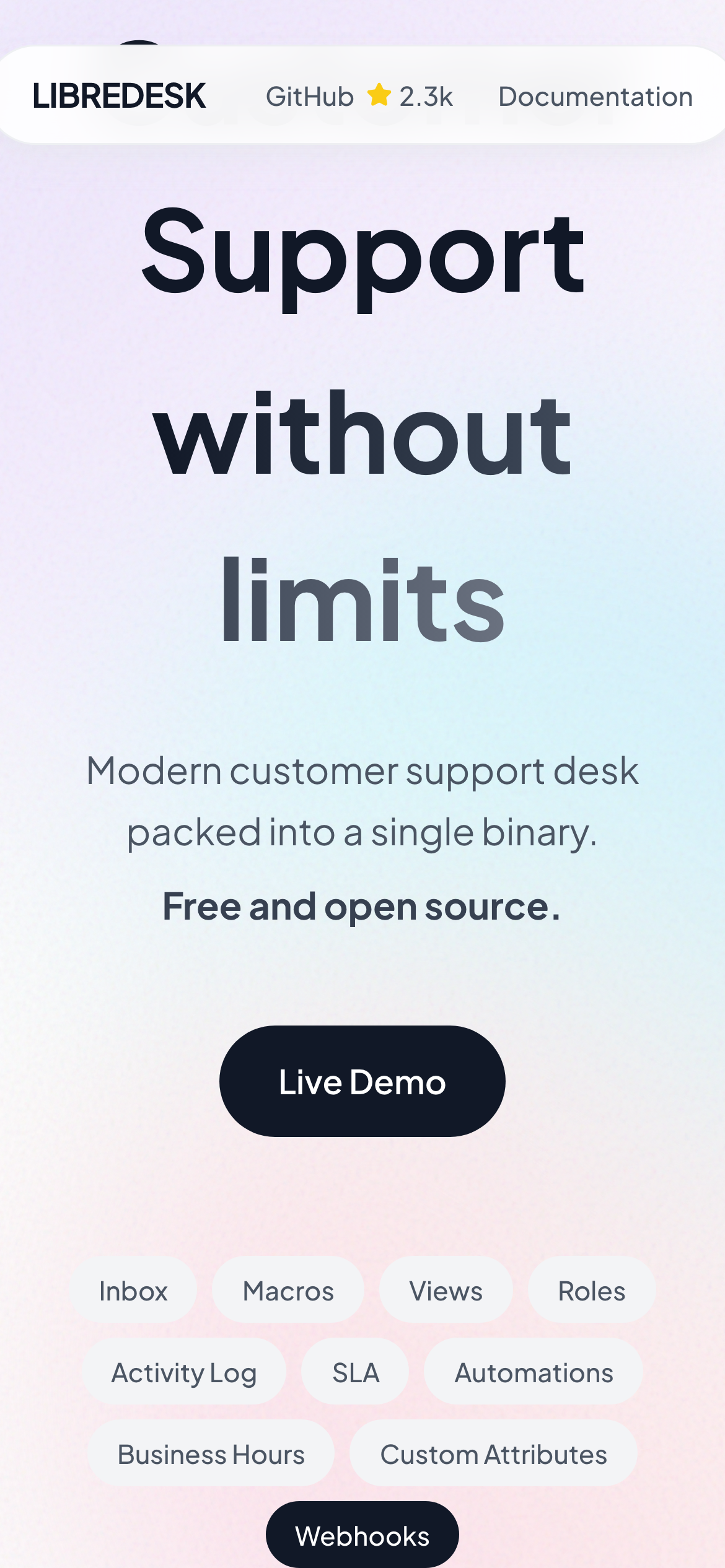 Libredesk is an open-source, self-hosted customer support platform designed to streamline helpdesk operations. Built as a single binary application, it offers straightforward deployment without complex infrastructure requirements. The platform provides essential support desk features including multi-shared inbox management, allowing teams to organize and handle customer inquiries across multiple channels from a centralized location. It includes automation capabilities to reduce manual workload, CSAT surveys for measuring customer satisfaction, and granular permission controls for managing team access levels. Being open-source, Libredesk allows organizations to self-host the solution, maintaining full control over their support data and infrastructure. The platform is suitable for businesses and teams of any size seeking a lightweight alternative to commercial helpdesk software. Users can access a live demo on the project website to evaluate the interface and features before deployment. The project is maintained on GitHub, where the community can contribute improvements and report issues.