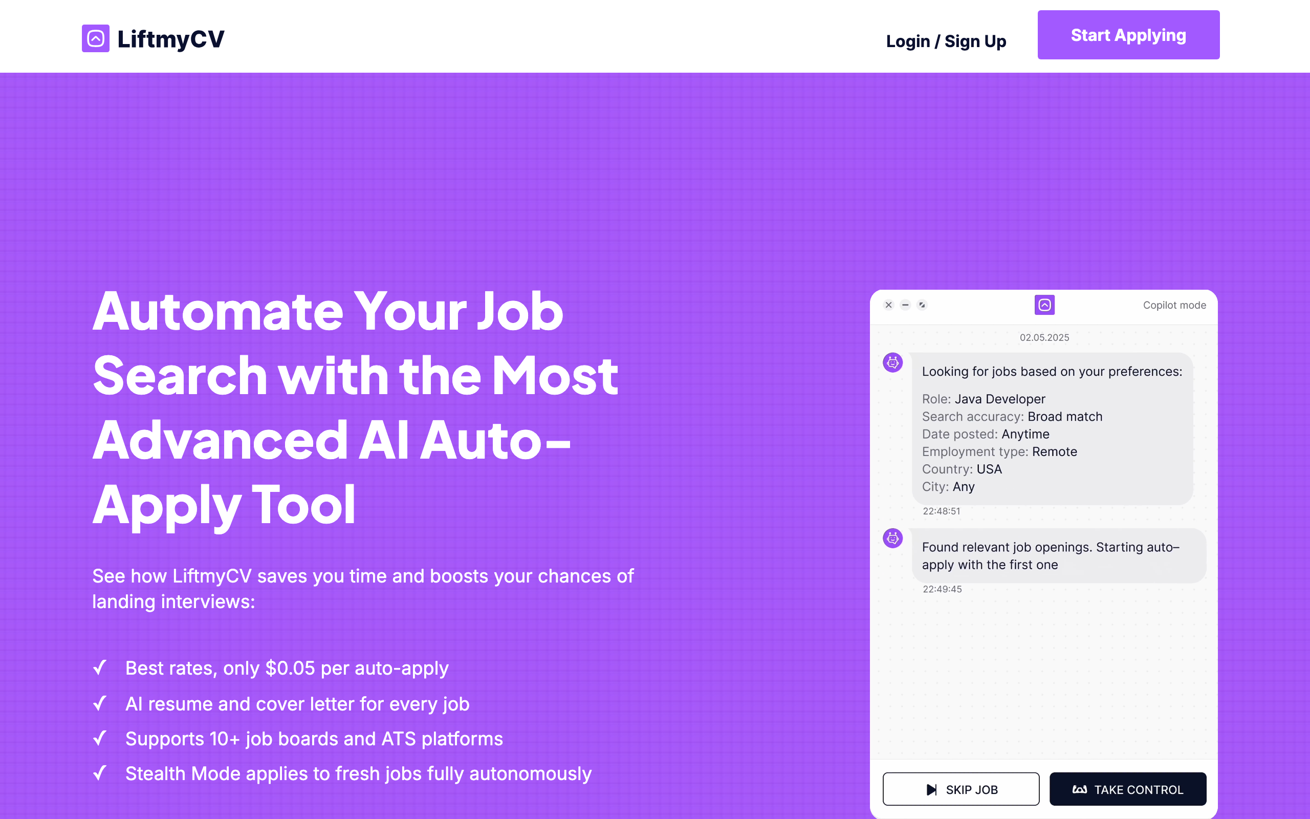 Hey HN! Dan Zaitsev here – solopreneur and maker of LiftmyCV, an AI job search agent that finds relevant job openings and auto-applies on your behalf. In early 2024, my small marketing team started losing clients due to the rise of AI tools. So I began searching for a job myself and was reminded how