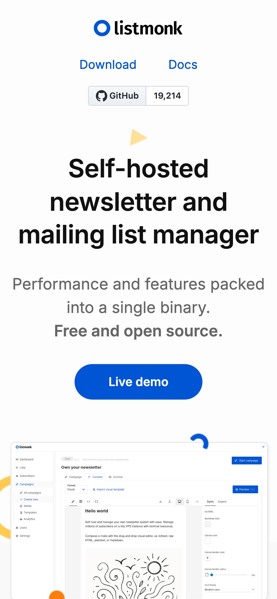 Listmonk is an open-source, self-hosted newsletter and mailing list manager designed for organizations seeking control over their email communications infrastructure. Built as a single binary application with PostgreSQL as its data store, Listmonk enables users to send email campaigns and transactional emails without relying on third-party services. The platform serves businesses, publishers, and developers who need a straightforward, locally-managed solution for managing subscriber lists and distributing bulk emails. By operating as a self-hosted application, users maintain full ownership of their data and messaging systems. Key characteristics include high performance capabilities, a comprehensive feature set, and the ability to run independently without external dependencies. The application provides a dashboard interface for managing campaigns, subscribers, and configurations. Being open-source, Listmonk allows technical users to review code, customize functionality, and contribute to development. The project is actively maintained, with the latest release (v6.0.0) published in January 2026. Listmonk is suitable for small to mid-sized organizations, development teams, and anyone requiring an alternative to commercial email marketing platforms. There are no licensing costs associated with the software, though users must manage their own hosting and infrastructure requirements.