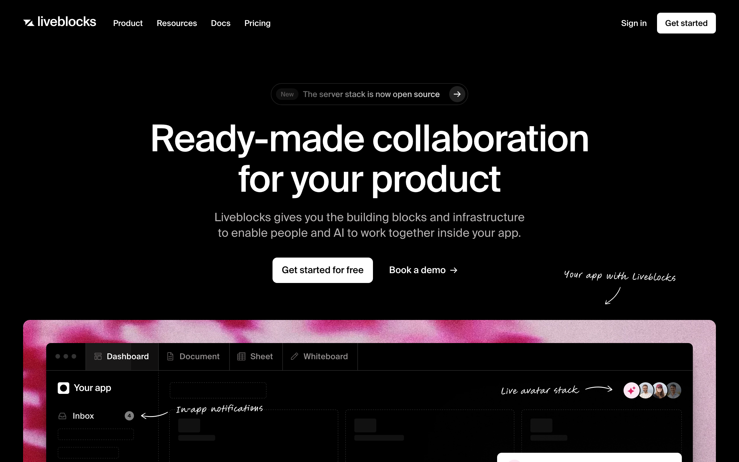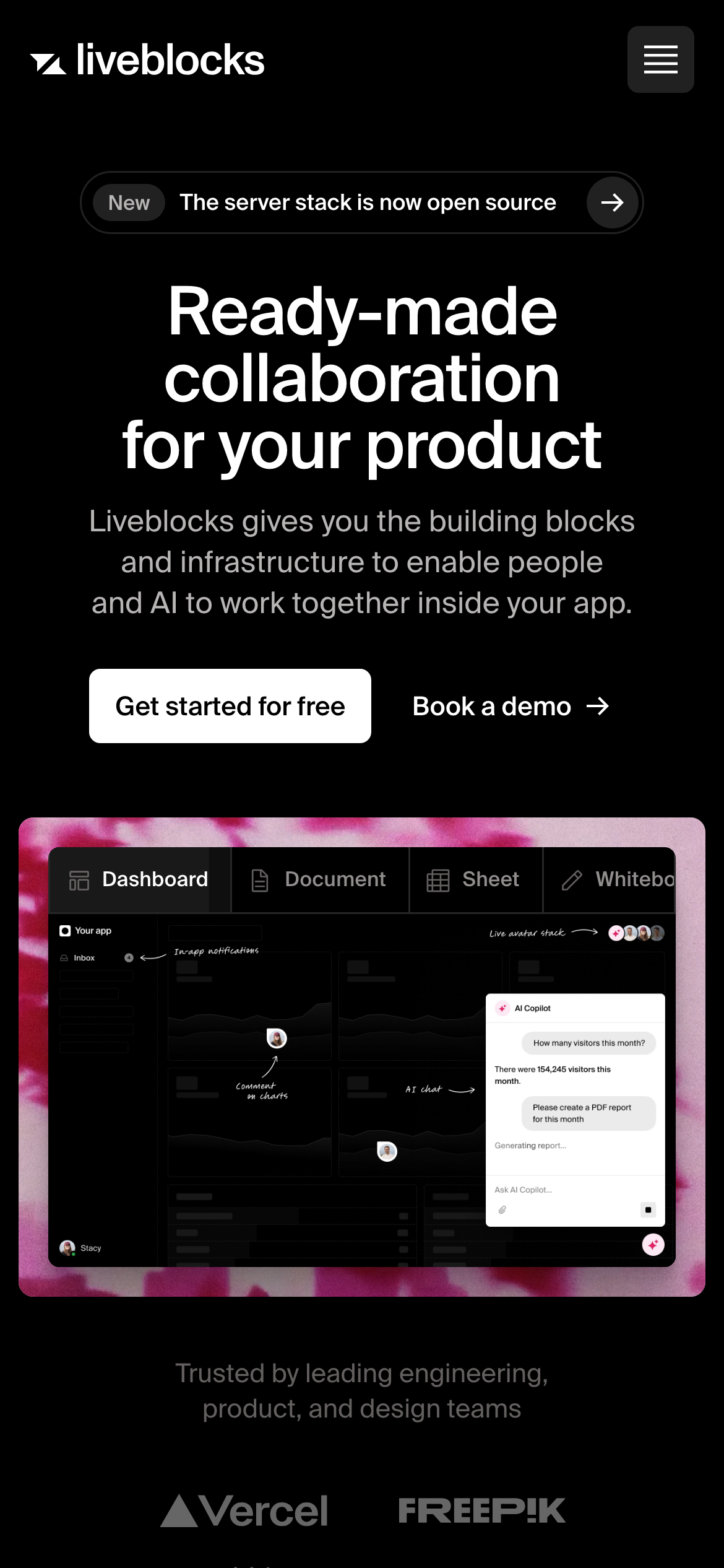 Liveblocks is an open-source infrastructure platform designed to enable real-time collaboration and AI integration within applications. It provides developers with pre-built components and backend infrastructure to facilitate seamless interaction between users and artificial intelligence systems. The platform is intended for software developers and product teams looking to add collaborative features to their applications without building real-time synchronization from scratch. Liveblocks handles the underlying infrastructure required for live updates, concurrent editing, and shared workspaces across multiple users and AI agents. Key offerings include APIs and SDKs that abstract away the complexity of managing real-time data, conflict resolution, and state synchronization. The platform supports multiple application types, from document editors to design tools to project management systems. By providing these building blocks, Liveblocks reduces development time and complexity when implementing collaborative features. As an open-source project, Liveblocks allows developers to inspect the codebase, contribute improvements, and avoid vendor lock-in. This approach appeals to teams prioritizing transparency and customization in their infrastructure choices. The platform addresses a specific need in modern application development: enabling effective human-AI collaboration within existing products rather than requiring separate tools or workflows.