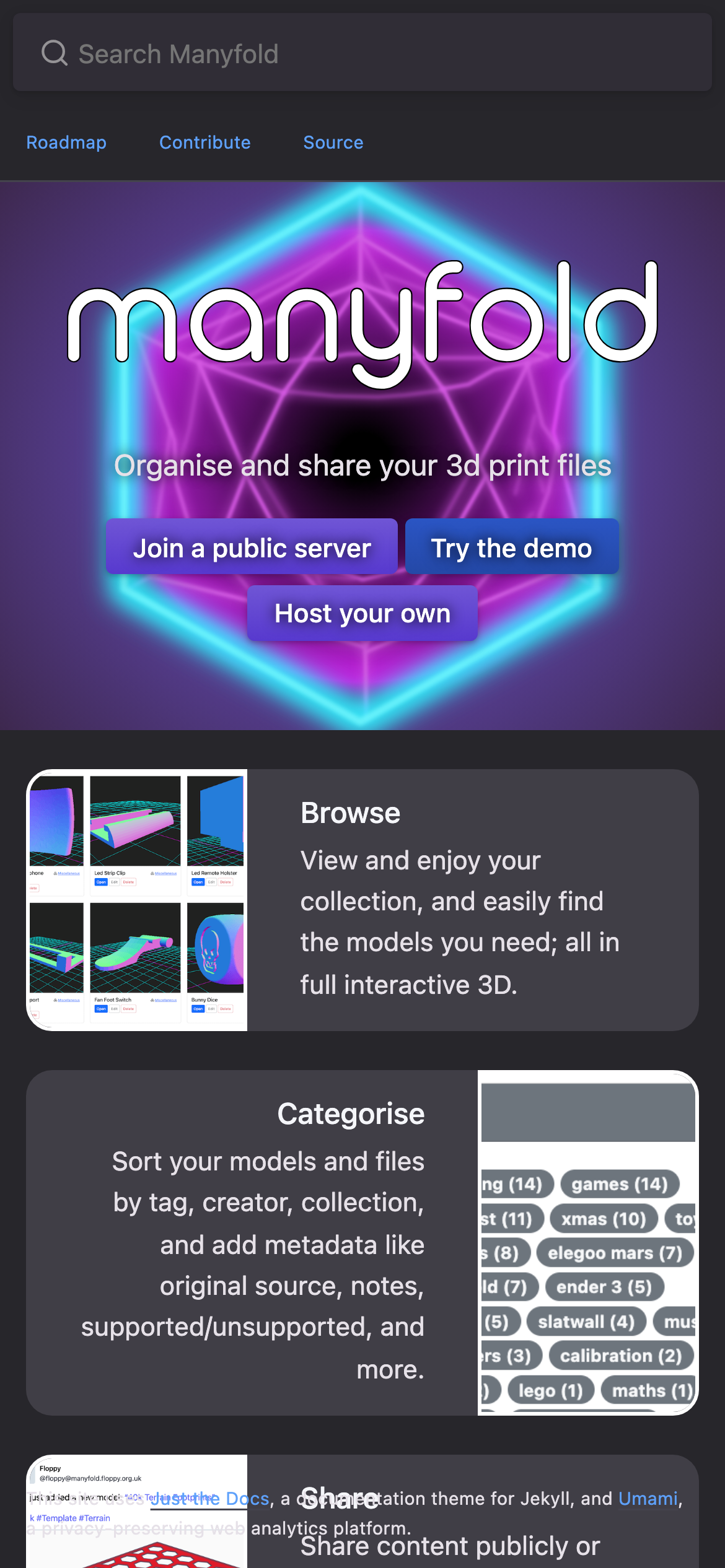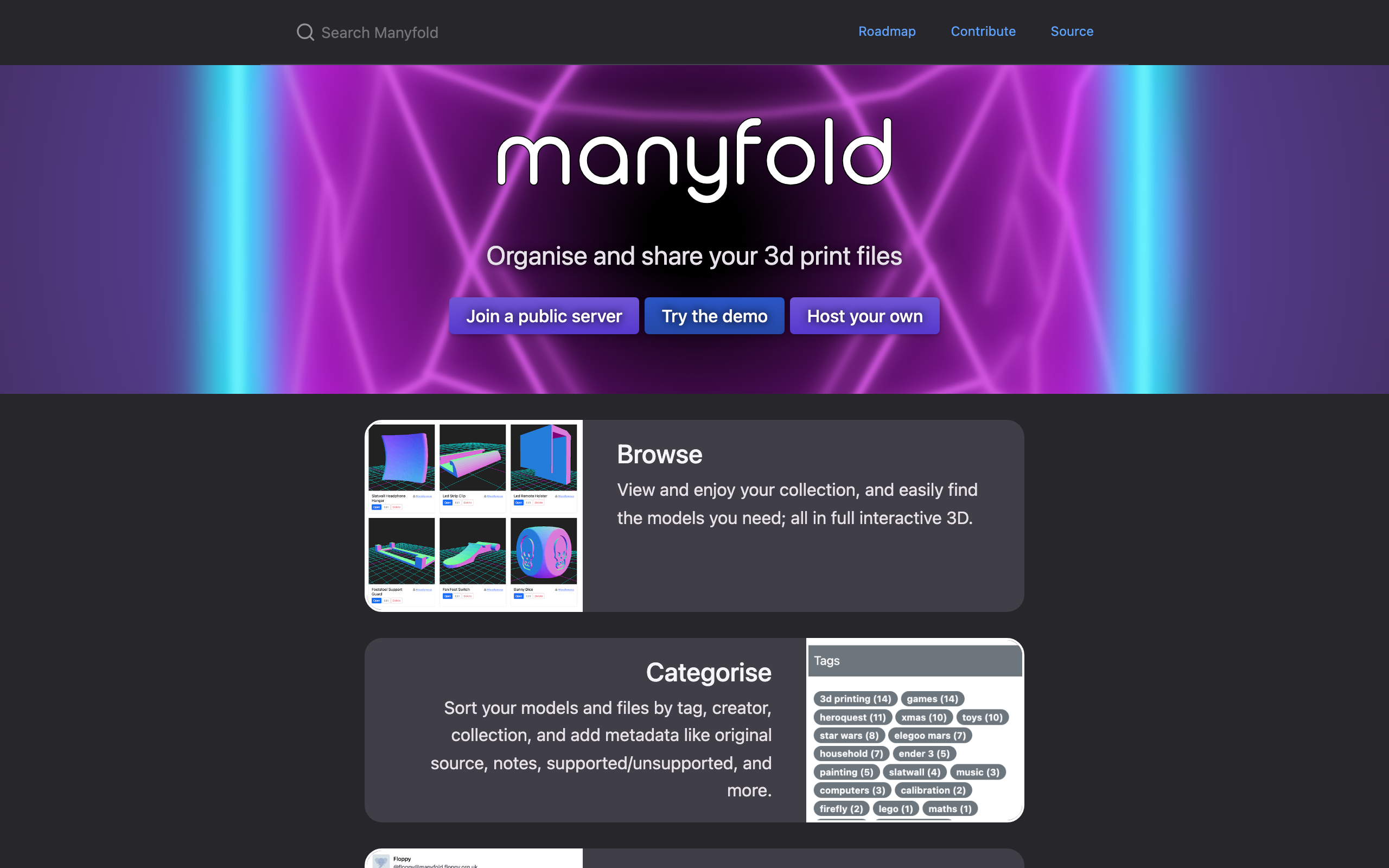 Manyfold is an open-source, self-hosted web application designed for organizing and managing collections of 3D print files. It supports multiple file formats including STL, OBJ, and 3MF, providing users with an interactive 3D viewer for browsing their models. The application allows users to categorize files through tags, creators, and collections while adding custom metadata such as source information, notes, and print compatibility details. The platform caters to makers, hobbyists, and professionals who work with 3D printing files and need centralized file management. Key features include automatic file reorganization on disk based on user-defined tags and customizable naming conventions, eliminating manual file sorting. Manyfold also supports content sharing through public or private access and integrates with the Fediverse, enabling users to follow and share content across federated instances. As a self-hosted solution, Manyfold gives users complete control over their data and collections. The open-source nature allows developers to modify and extend functionality according to specific needs. The application serves as a practical utility for anyone managing a substantial 3D model library who requires robust organizational tools and doesn't want to rely on cloud-based solutions.