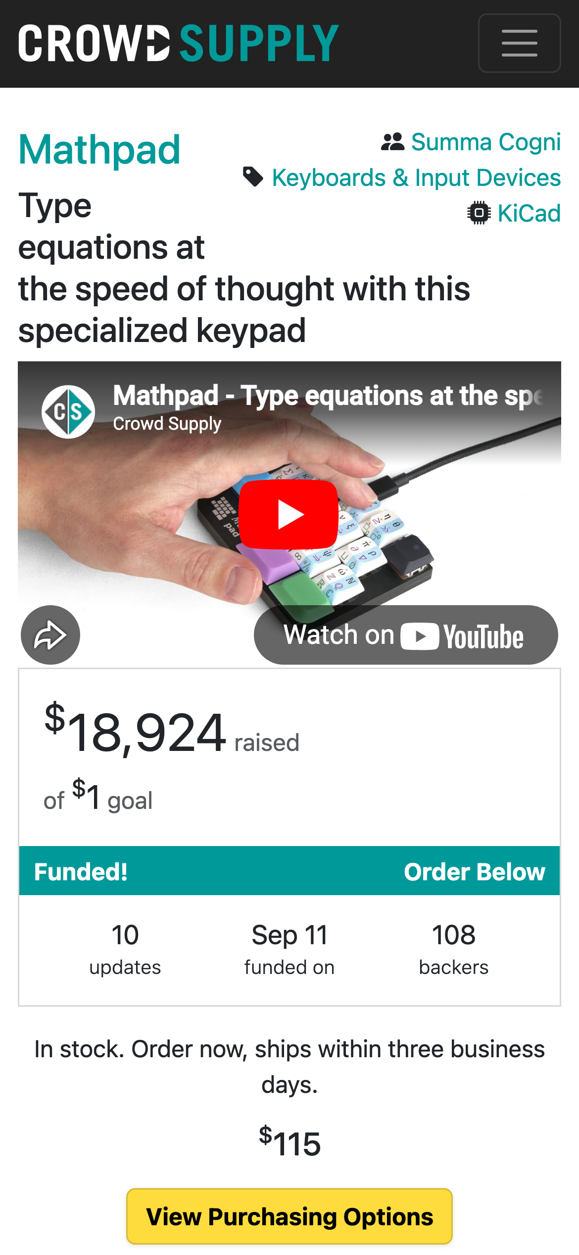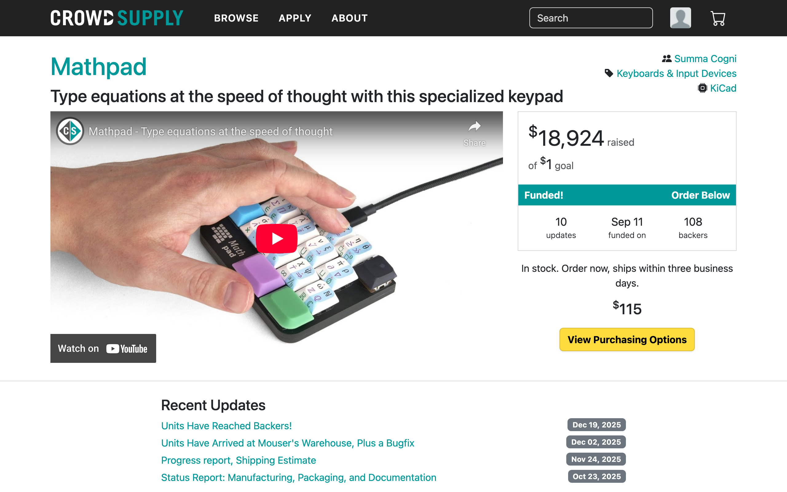 Mathpad is a physical keypad designed to simplify mathematical notation entry across digital platforms. It addresses a common workflow friction point: typing complex equations in code editors, email clients, messaging applications, and other text environments where mathematical symbols are typically difficult to input. The device features dedicated keys for Greek letters, calculus symbols, and other mathematical notation, enabling direct typing of equations rather than relying on workarounds like LaTeX syntax or Unicode character insertion. This makes it particularly useful for engineers, mathematicians, physicists, and software developers who frequently work with mathematical expressions. Mathpad is open source and available through Crowd Supply, with units currently in stock and shipping within three business days. The project is built using KiCad and has an active GitHub repository, allowing users to review the design, contribute improvements, or build their own versions. The keypad integrates with existing workflows without requiring special software or plugins, functioning as a standard input device across Windows, macOS, and Linux environments. By removing barriers to mathematical notation entry, Mathpad reduces cognitive load and speeds up documentation, research, and coding tasks that involve equations and scientific notation.