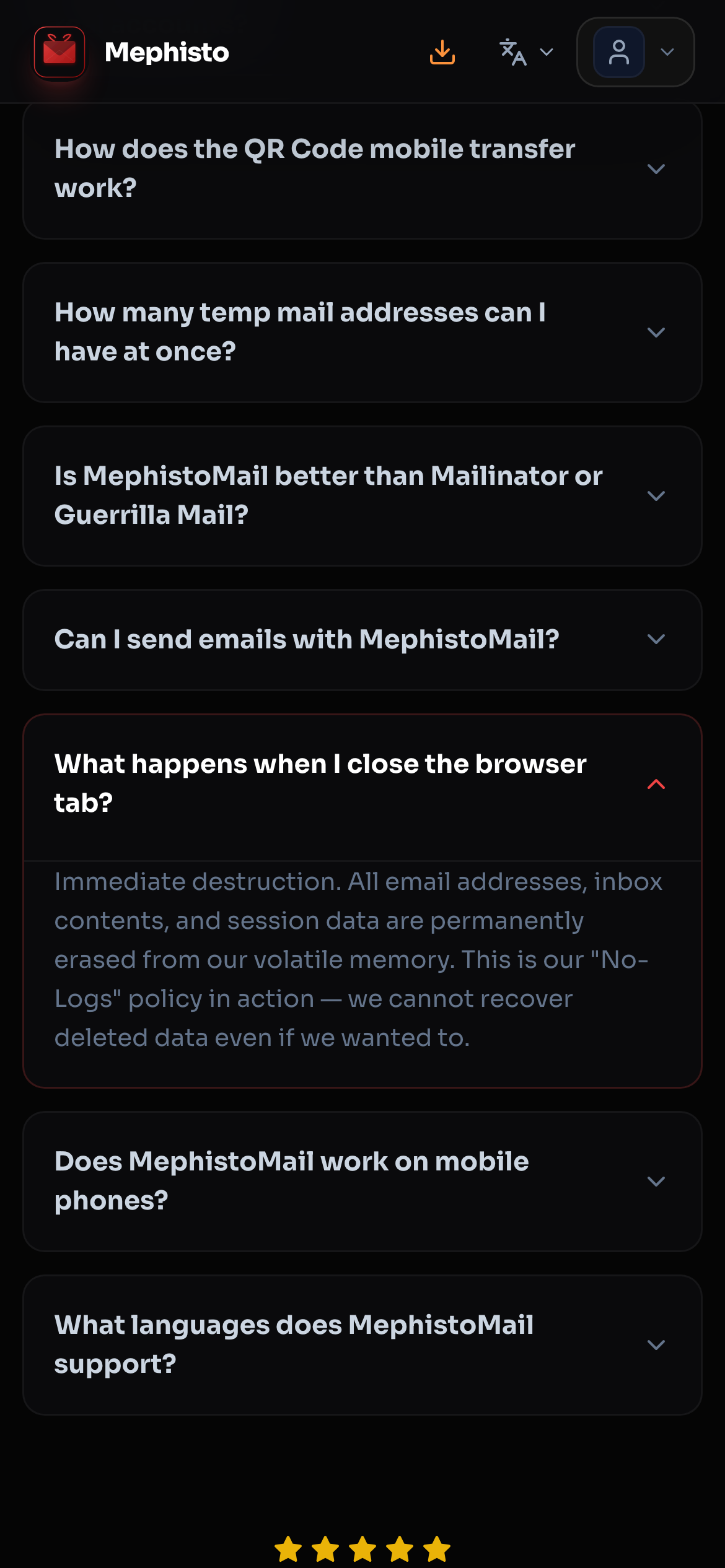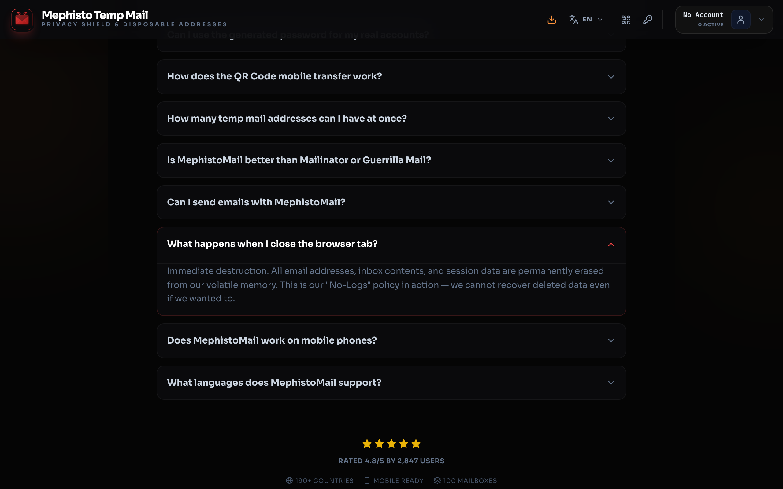 - Anonymous email reception with no logs or data retention