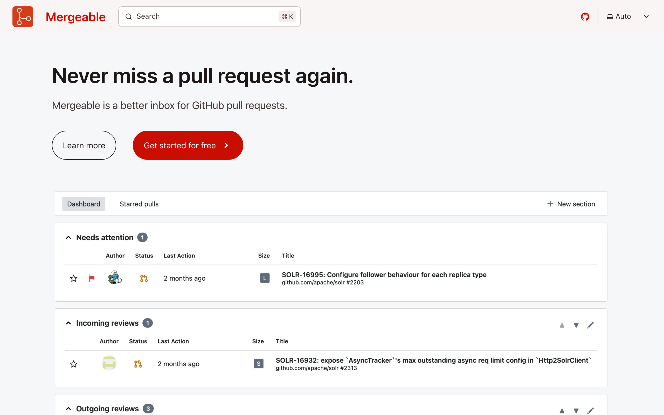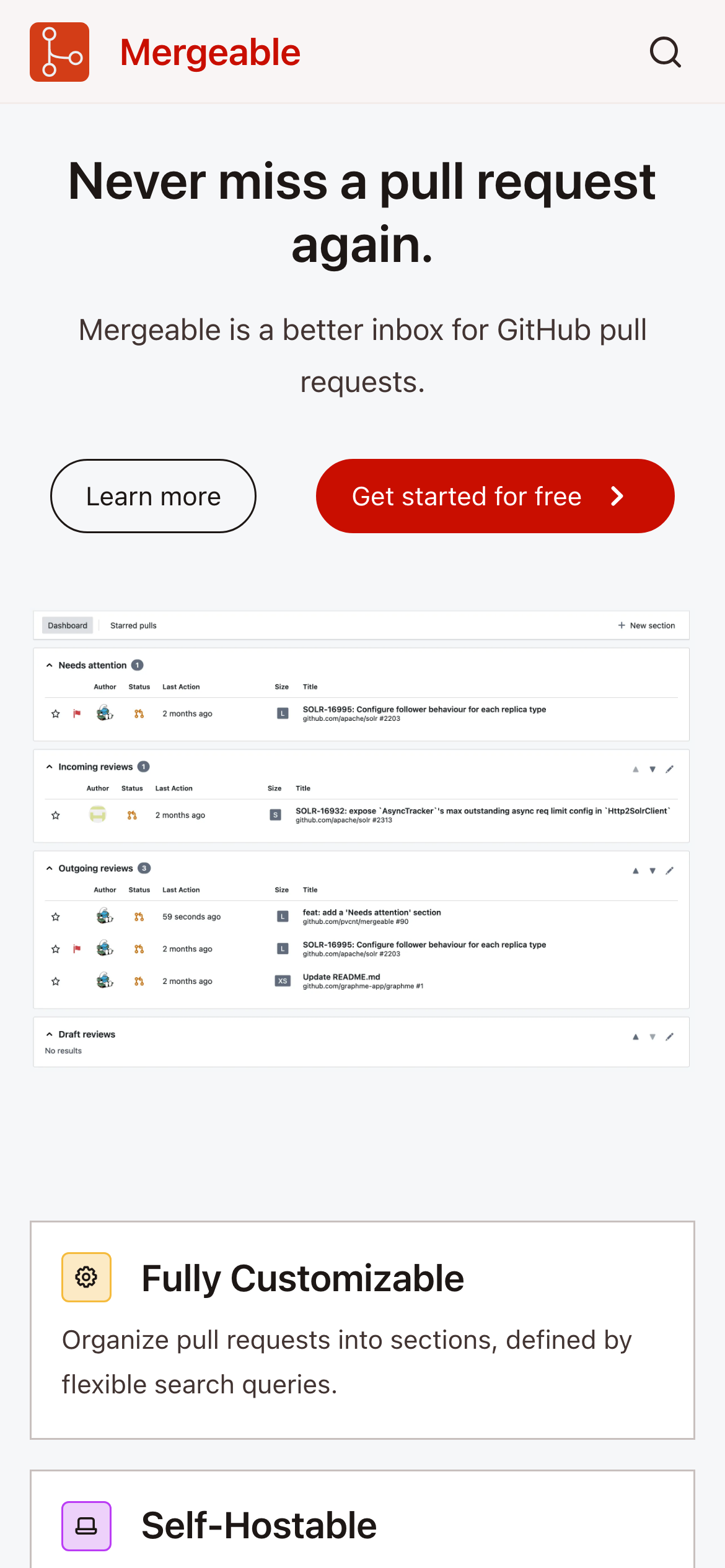 Mergeable is an open-source inbox application designed to streamline GitHub pull request management. It provides developers and development teams with a centralized interface for organizing and tracking pull requests across repositories and accounts. The tool allows users to organize pull requests into custom sections using flexible search queries, making it easier to prioritize and manage review workflows. All data is stored locally in browser storage, ensuring privacy and eliminating the need for external servers. The application supports keyboard shortcuts for efficient navigation, reducing reliance on mouse interactions for power users. Mergeable is built for developers who handle multiple pull requests across different GitHub accounts or repositories and need better visibility and organization than GitHub's default interface provides. The open-source nature of the project means users can inspect the code, contribute improvements, and self-host if desired. The application requires no installation beyond accessing the web interface and authenticating with GitHub. It functions as a lightweight alternative to managing pull requests directly through GitHub, offering a more structured approach to code review workflows.