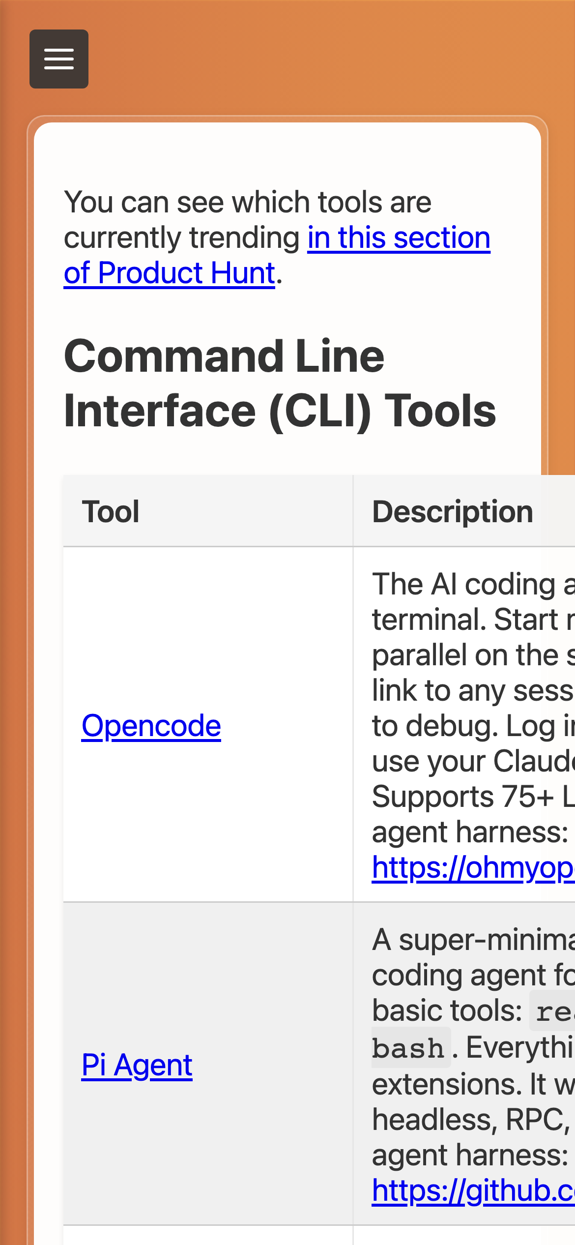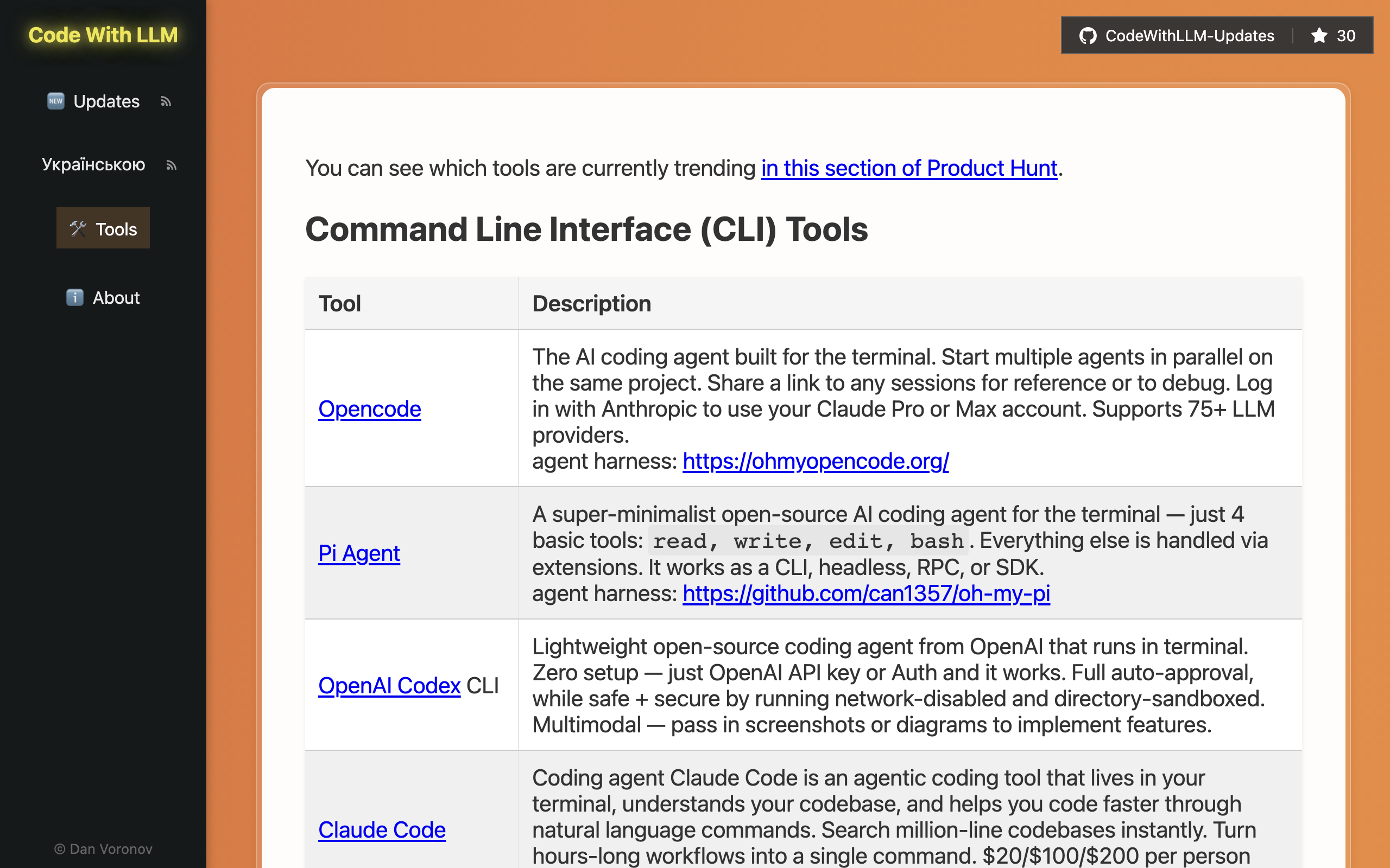 My Attempt to Organize the World of AI Dev Tools is an open-source resource that catalogs AI-powered development tools for programmers. Created by Dan Voronov, the project compiles a curated list of solutions spanning AI-powered IDEs, code generators, and other development utilities that leverage large language models (LLMs) for coding tasks. The resource serves developers exploring how artificial intelligence can enhance their coding workflows. Beyond tool listings, the project includes educational materials such as lecture slides from 2023-24, practical tips, code examples, and instructional content designed to help programmers effectively use LLMs in their work. A Telegram channel accompanies the project to keep the community updated on trends and new developments. The creator maintains an intentionally critical perspective on tool selection—notably questioning whether text-to-SQL projects warrant inclusion due to limited functionality—suggesting the compilation prioritizes practical utility over comprehensiveness. Hosted on both a dedicated website and GitHub, the project operates entirely as open source, welcoming community contributions and updates. It functions as both a reference guide for developers evaluating AI coding tools and an educational platform for learning LLM-assisted development practices. The resource is particularly useful for those seeking curated recommendations rather than exhaustive unfiltered tool databases.