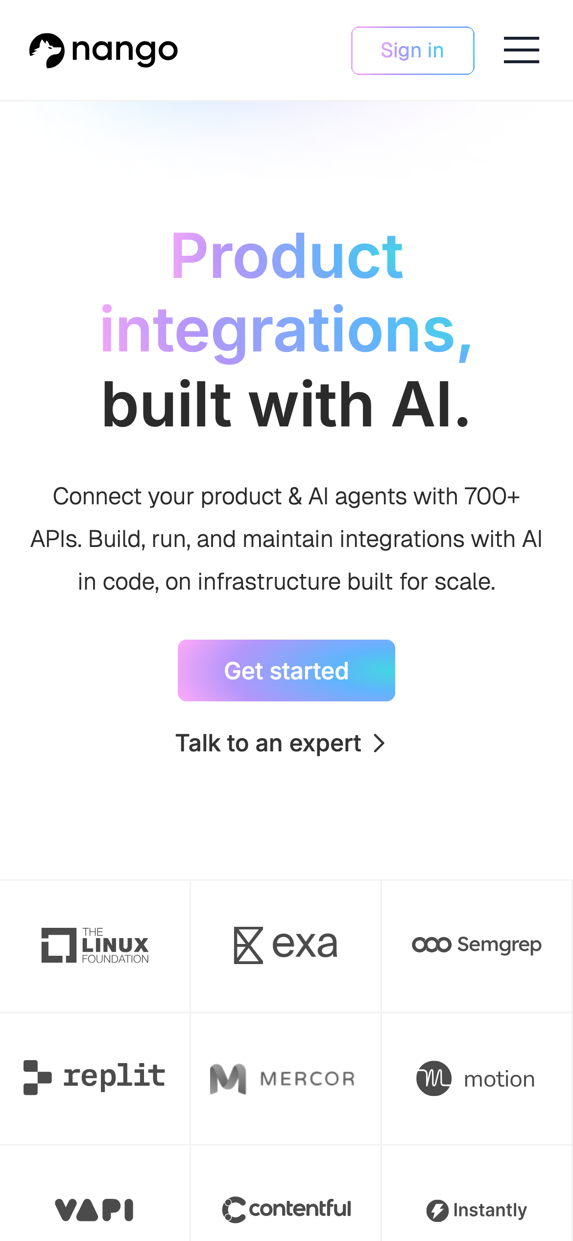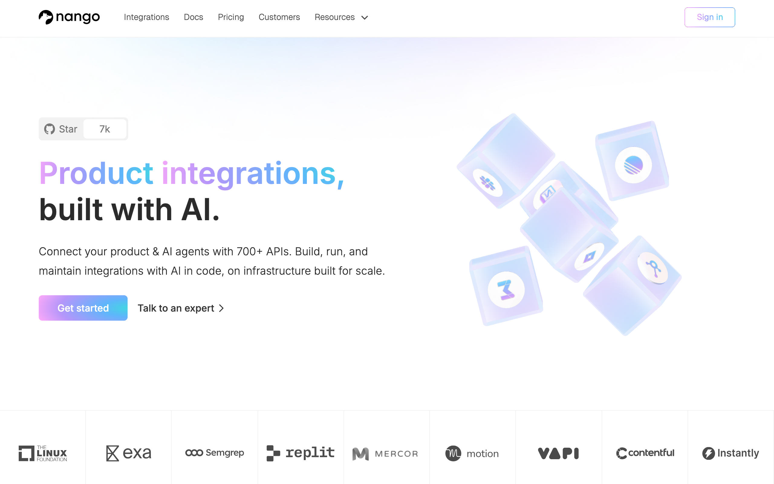 Nango is an open-source unified API platform designed to simplify building and maintaining product integrations. It enables developers to connect applications and AI agents with over 700 pre-built APIs, reducing the complexity typically associated with multi-API integration work. The platform allows teams to write integration logic in code while leveraging infrastructure built to handle scale. Nango handles common integration challenges including API authentication, data synchronization, and error handling, allowing developers to focus on business logic rather than infrastructure concerns. Nango is particularly suited for SaaS companies, product teams, and developers building integration-heavy applications or AI agents that need to interact with multiple external services. It supports both traditional API integrations and modern AI-driven workflows. As an open-source project, Nango can be self-hosted or used through their hosted service, providing flexibility in deployment options. The platform includes comprehensive documentation, a growing collection of pre-configured integrations, and an active community for support. Teams can get started immediately with existing API templates or build custom integrations tailored to specific needs.