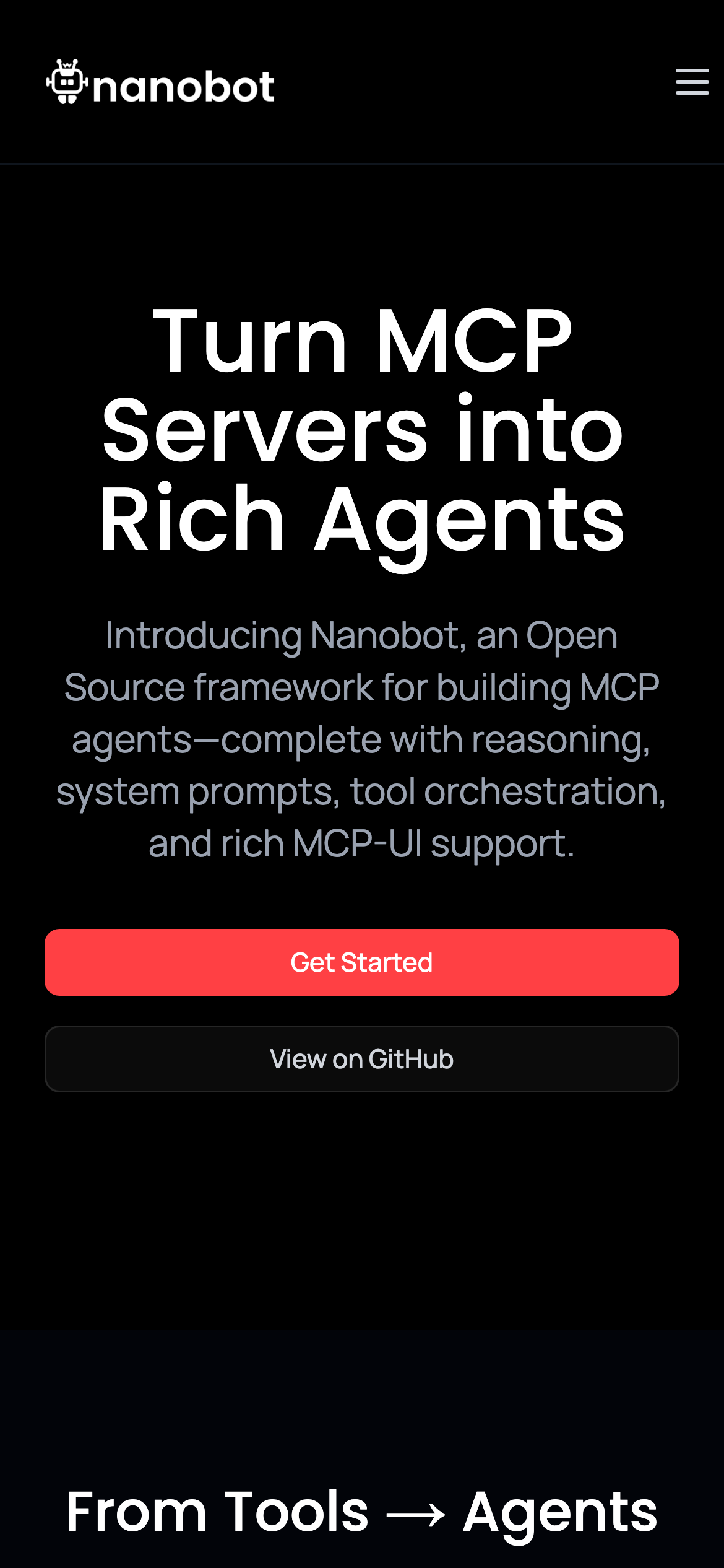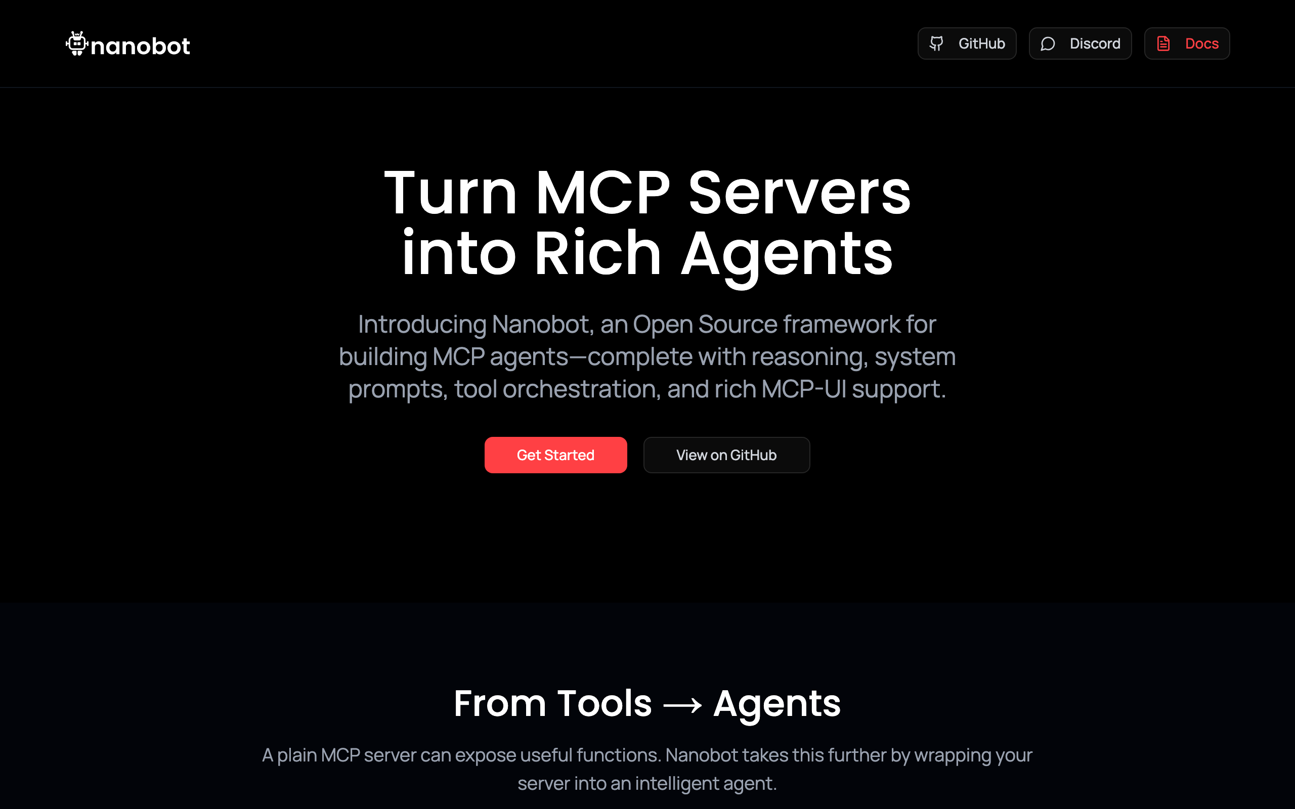 Today we're releasing Nanobot an open-source framework for building AI agents on top of the Model Context Protocol (MCP). MCP servers are a great way to expose structured tools, but they’re usually just that—collections of functions. Nanobot makes it simple to wrap any MCP server with reasoning