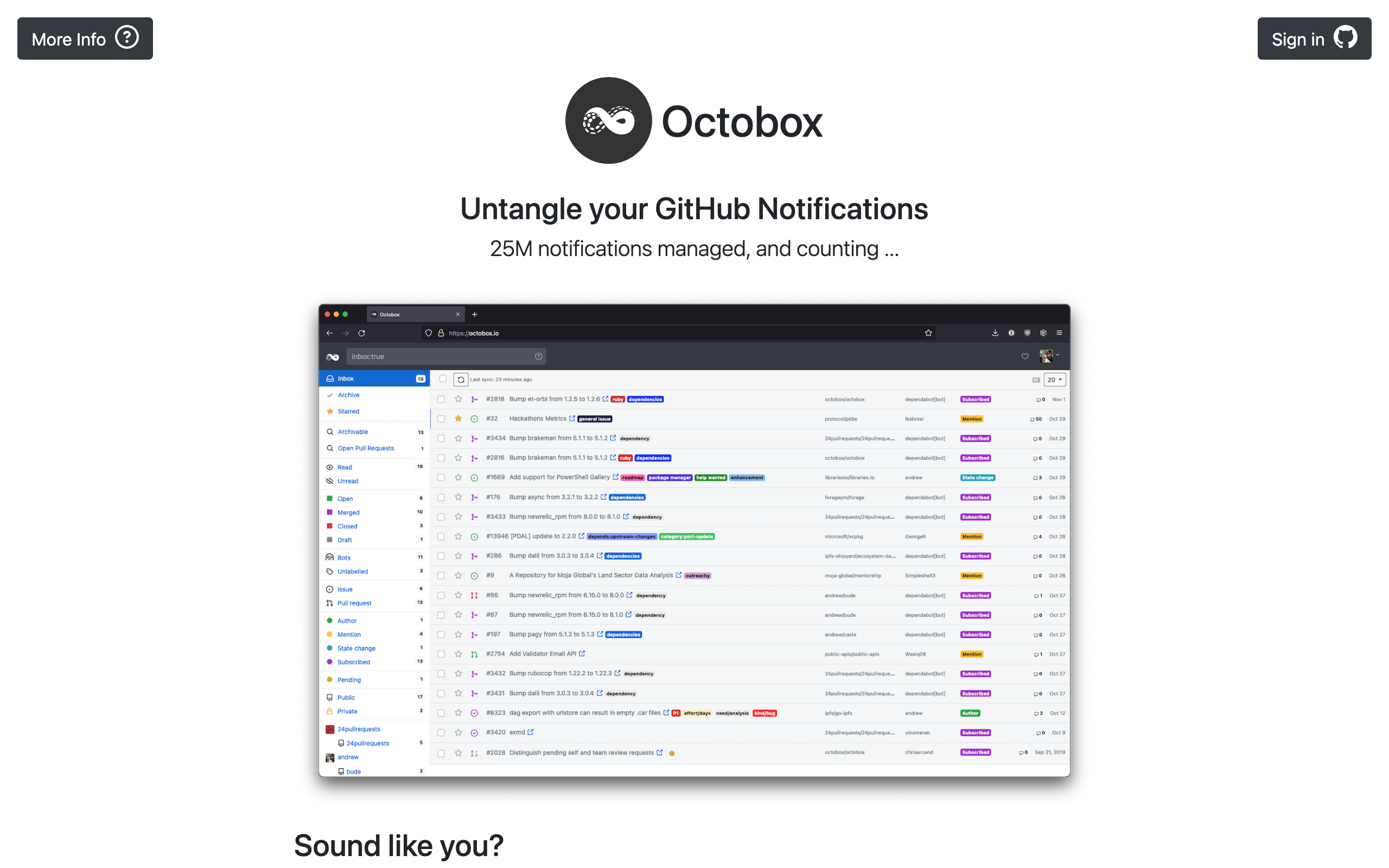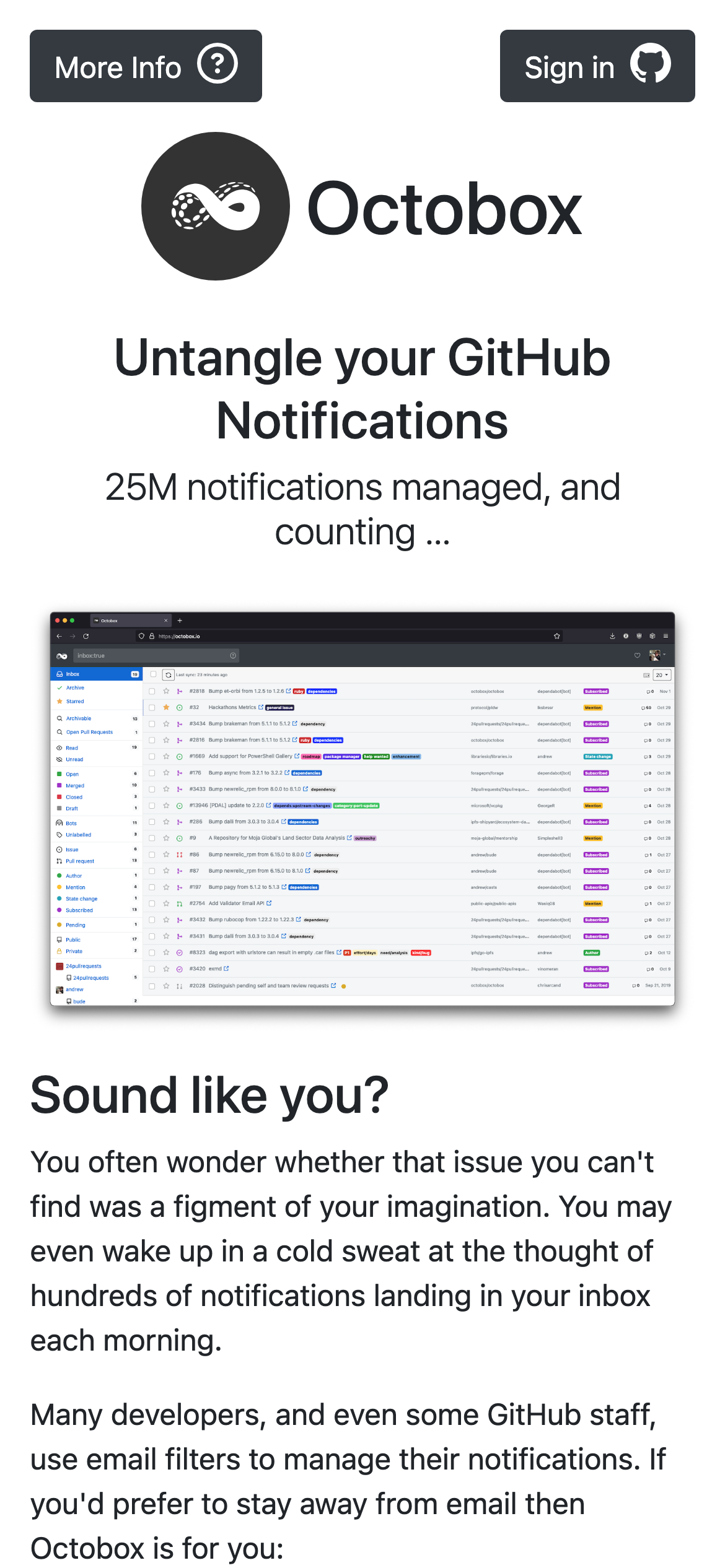 Octobox is an open-source developer utility that provides a centralized interface for managing GitHub notifications. Rather than relying on email filters or navigating GitHub's native notification system, Octobox gives developers a dedicated platform to organize, filter, and track issues, pull requests, and mentions across their repositories. The tool is designed for developers who receive high volumes of GitHub notifications and need a more efficient way to stay on top of important updates without relying on email. Users can view all notifications in one place, mark items as read or archived, and prioritize what requires immediate attention. Octobox addresses a common pain point in development workflows: notification fatigue. By consolidating GitHub activity into a streamlined dashboard, it helps developers maintain visibility into project activity while reducing the mental overhead of managing scattered notifications across email and GitHub's interface. The project is completely open-source and available on GitHub, making it accessible for individual developers and teams. It integrates directly with GitHub's notification system, allowing users to maintain their existing workflows while gaining better organizational control. Octobox is suitable for solo developers, open-source maintainers, and teams working across multiple repositories who need a more manageable approach to notification handling.