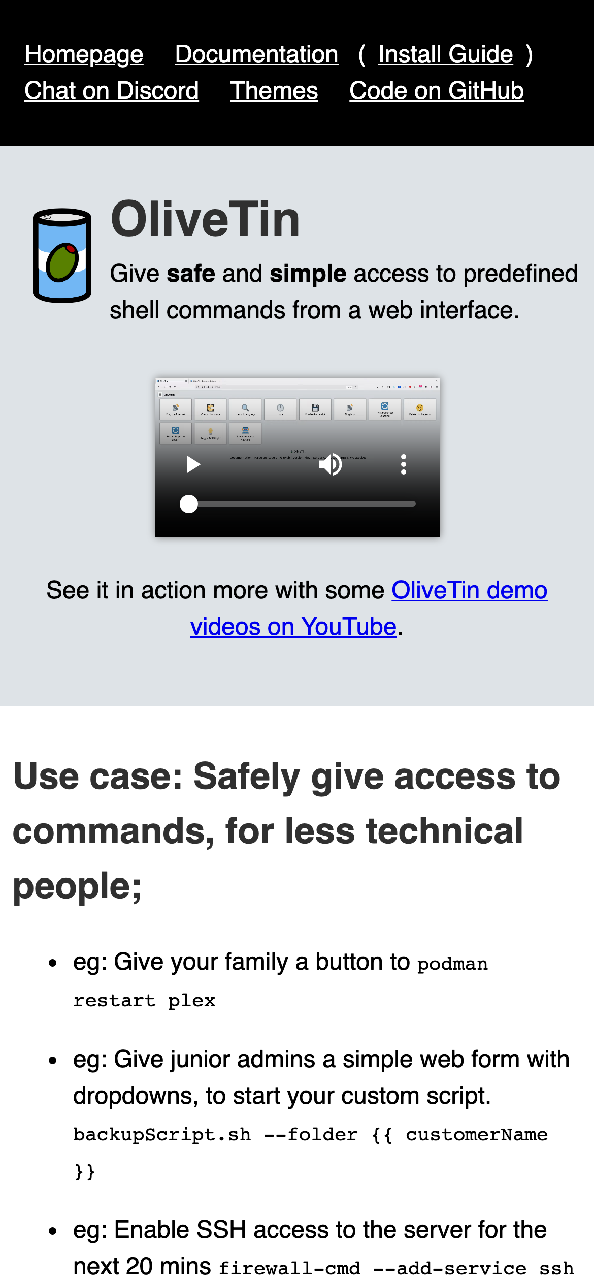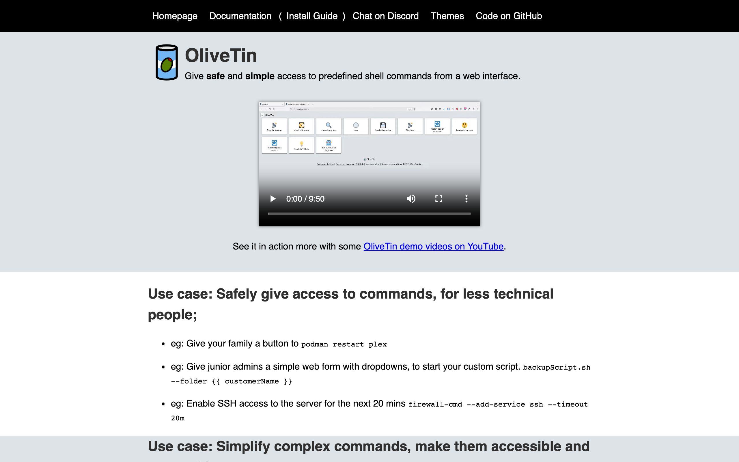 OliveTin is an open-source web interface that allows users to safely execute predefined Linux shell commands without requiring direct SSH access. It functions as a bridge between web browsers and command-line operations, making it useful for routine administrative tasks such as restarting services, running backup scripts, or executing system pings. The tool is designed for system administrators, DevOps engineers, and technical teams who need to provide controlled command execution capabilities to multiple users or in environments where SSH access is restricted, impractical, or cumbersome. By defining commands in advance, administrators can grant safe access to specific operations without exposing full terminal privileges. OliveTin uses YAML-based configuration, treating setup as code rather than relying on complex admin panel settings. This approach allows configurations to be version-controlled, easily replicated, and maintained alongside infrastructure definitions. The application provides a straightforward web interface where authorized users can execute only the commands administrators have explicitly enabled, reducing security risks while maintaining operational efficiency. This makes it particularly valuable in shared environments, remote infrastructure, or situations where streamlining access to routine tasks is important.