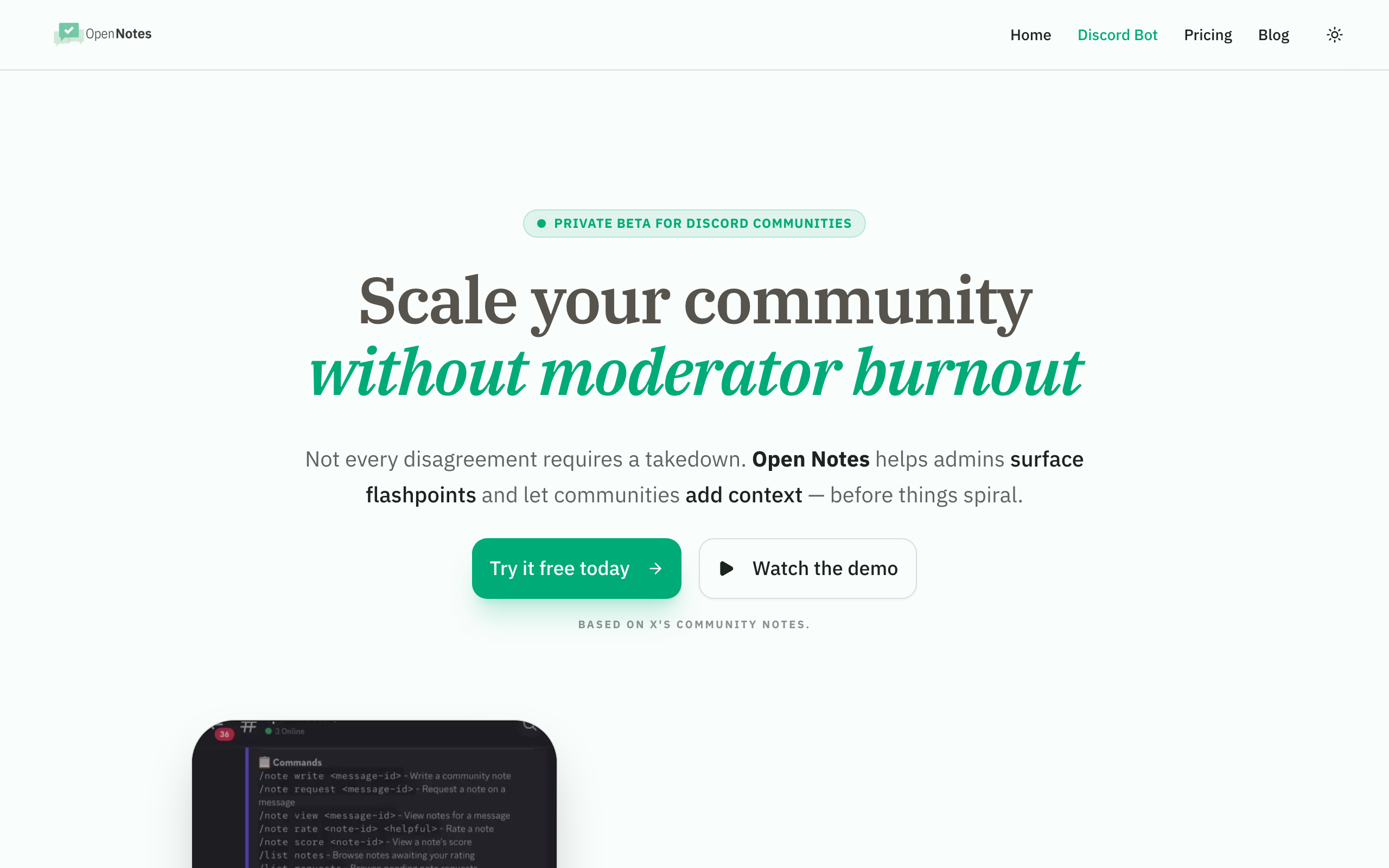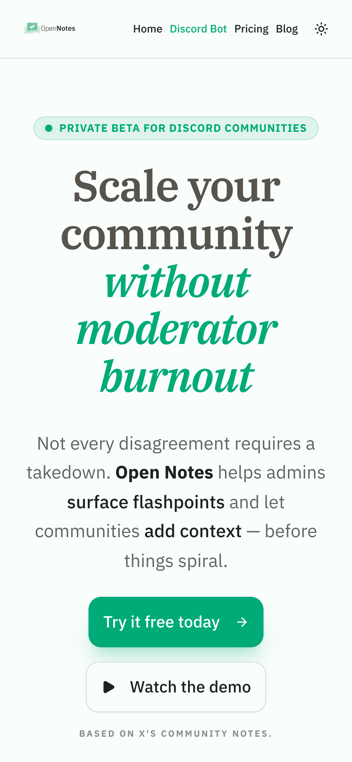 Howdy, Open Notes co-founder here! At Open Notes, we're building a system for community-driven constructive moderation and annotation that can be added to anything. Under the hood, we're using the open-source Twitter/X Community Notes algorithm (though that doesn't really kick in